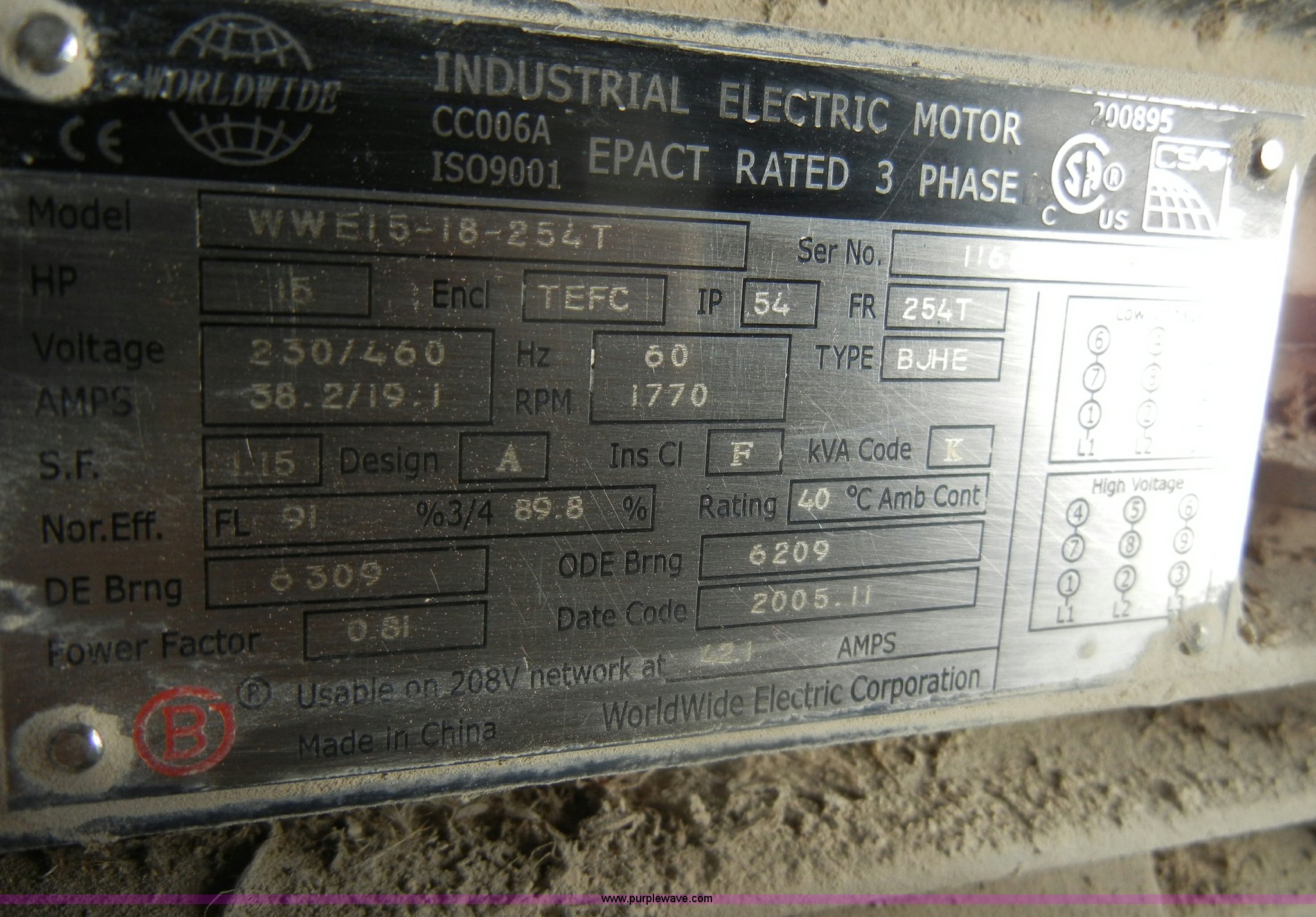 Purple Wave is selling a used Air Compressor in Kansas. This item is a Sutorbilt air compressor with the following: Used for bubbling system in water plants, 3,600 max RPM, 4 amp, 15 HP electric motor, Three phase, 1,770 RPM, Model WWE15-18-254T, Model GACMBPA