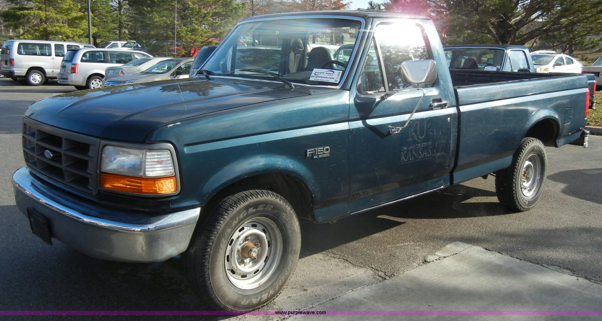 1995 Ford F150 XL pickup truck. 86,913 miles on odometer, 5.8L V8 EFI engine, Automatic transmission, AC and heat, Tilt, Cruise, AM/FM, Manual windows and locks, Vinyl bench seat, Ball hitch, Trailer wiring, 235/75R15 tires, Interior/exterior cosmetic damage, Dents and scratches, Body rust. Title distribution may be delayed up to 14 days from verification of funds. 1FTEF15HXSLB70716. KU facilities. 1503 Sunflower. Lawrence, KS 66045