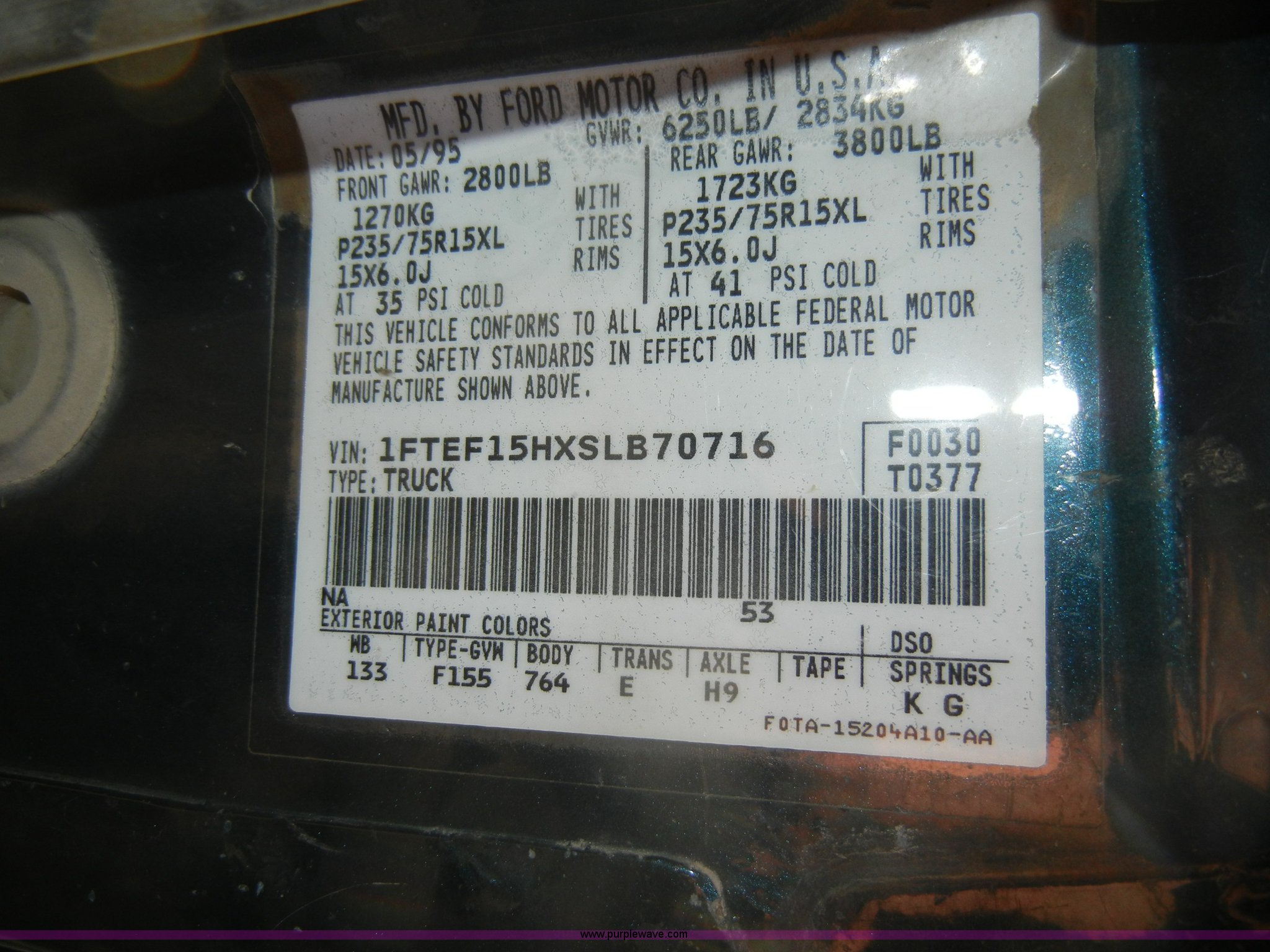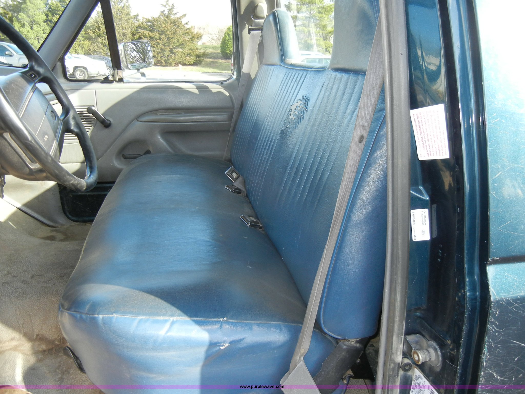 Purple Wave is selling a used Passenger Vehicle in Kansas. This item is a 1995 Ford F150 XL pickup truck with the following: 86,913 miles on odometer, 5.8L V8 EFI engine, Automatic transmission, AC and heat, Tilt, Cruise, AM/FM, Manual windows and locks, Vinyl bench seat, Ball hitch, Trailer wiring, 235/75R15 tires, Interior/exterior cosmetic damage, Dents and scratches, Body rust