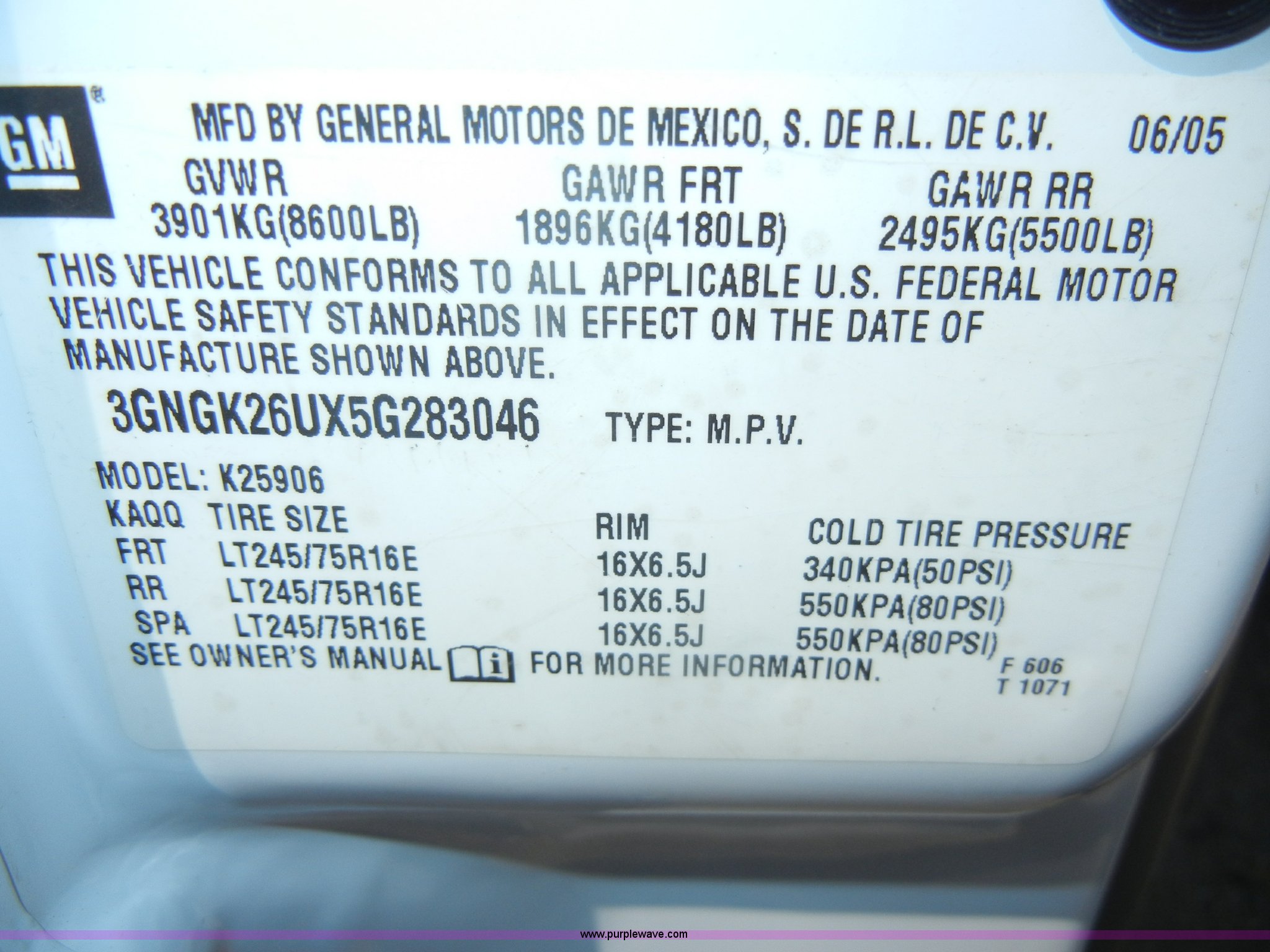 Purple Wave is selling a used Passenger Vehicle in Kansas. This item is a 2005 Chevrolet Suburban 2500 SUV with the following: 191,069 miles on odometer, 6.0L V8 SFI gas engine, Automatic transmission, Four wheel drive, AC and heat, Tilt, Cruise, AM/FM/CD, Power windows, locks, mirrors, and seats, Cloth interior, Rear control panel, Front tow hooks, Receiver hitch, Trailer wiring, 245/75R16 tires, worn, Interior/exterior cosmetic damage, Glove box damaged
