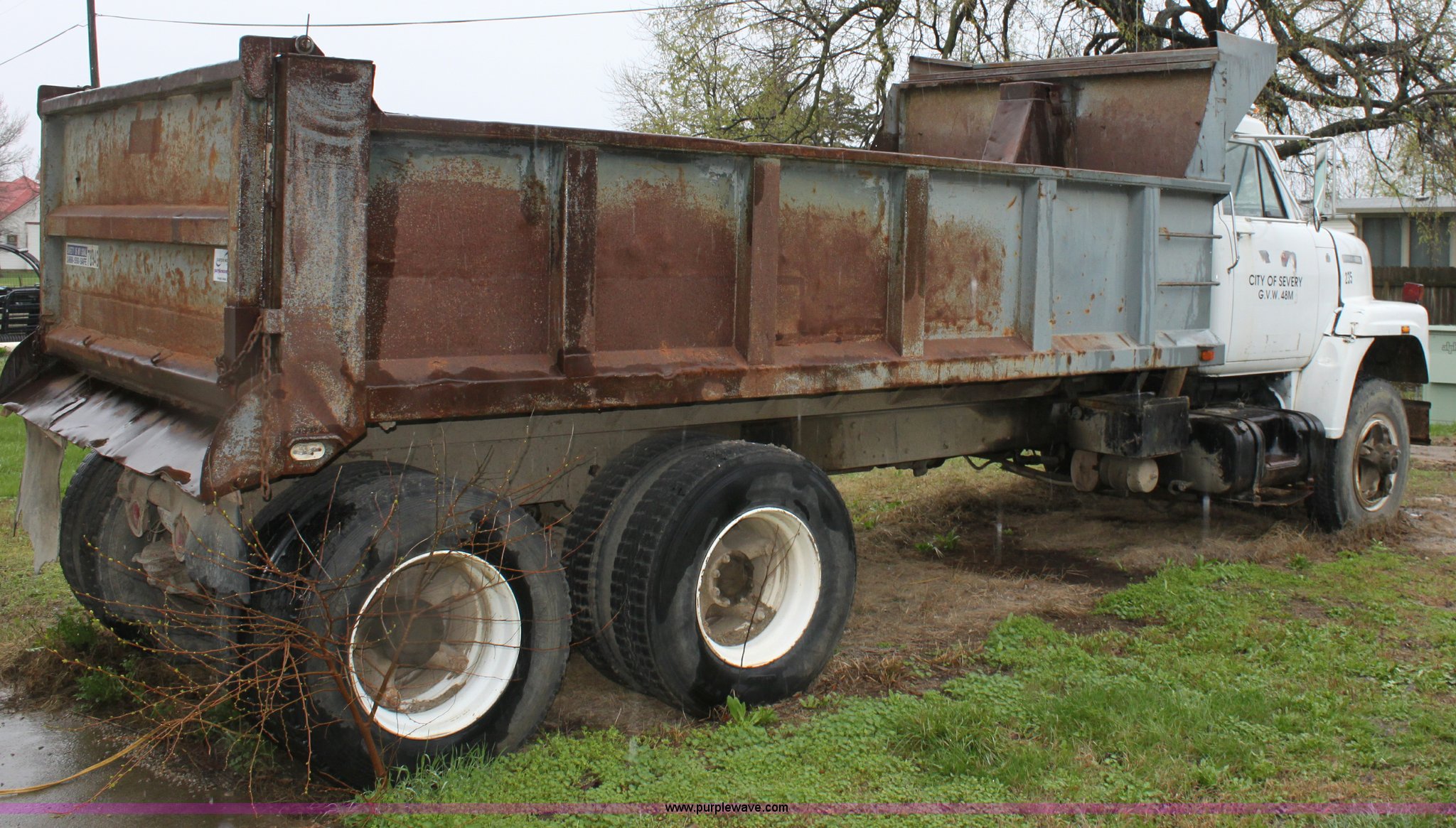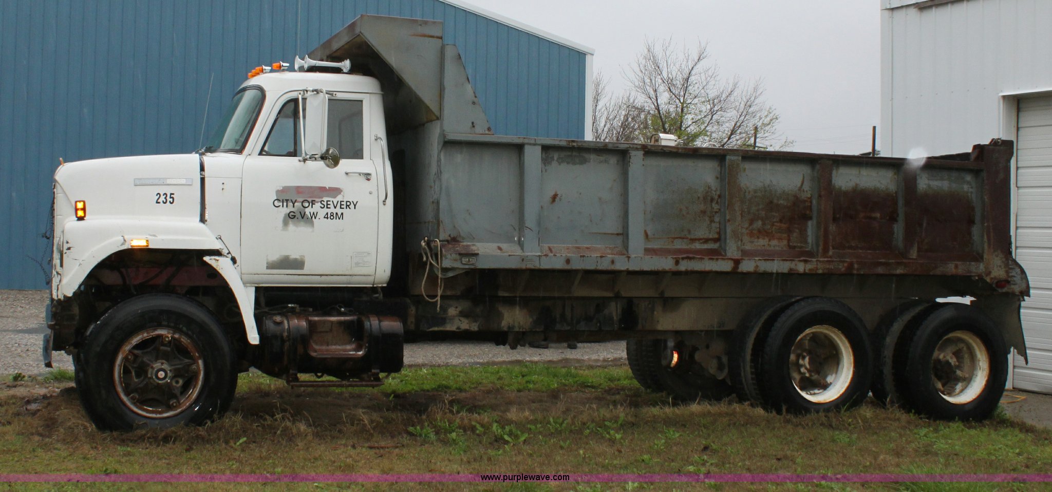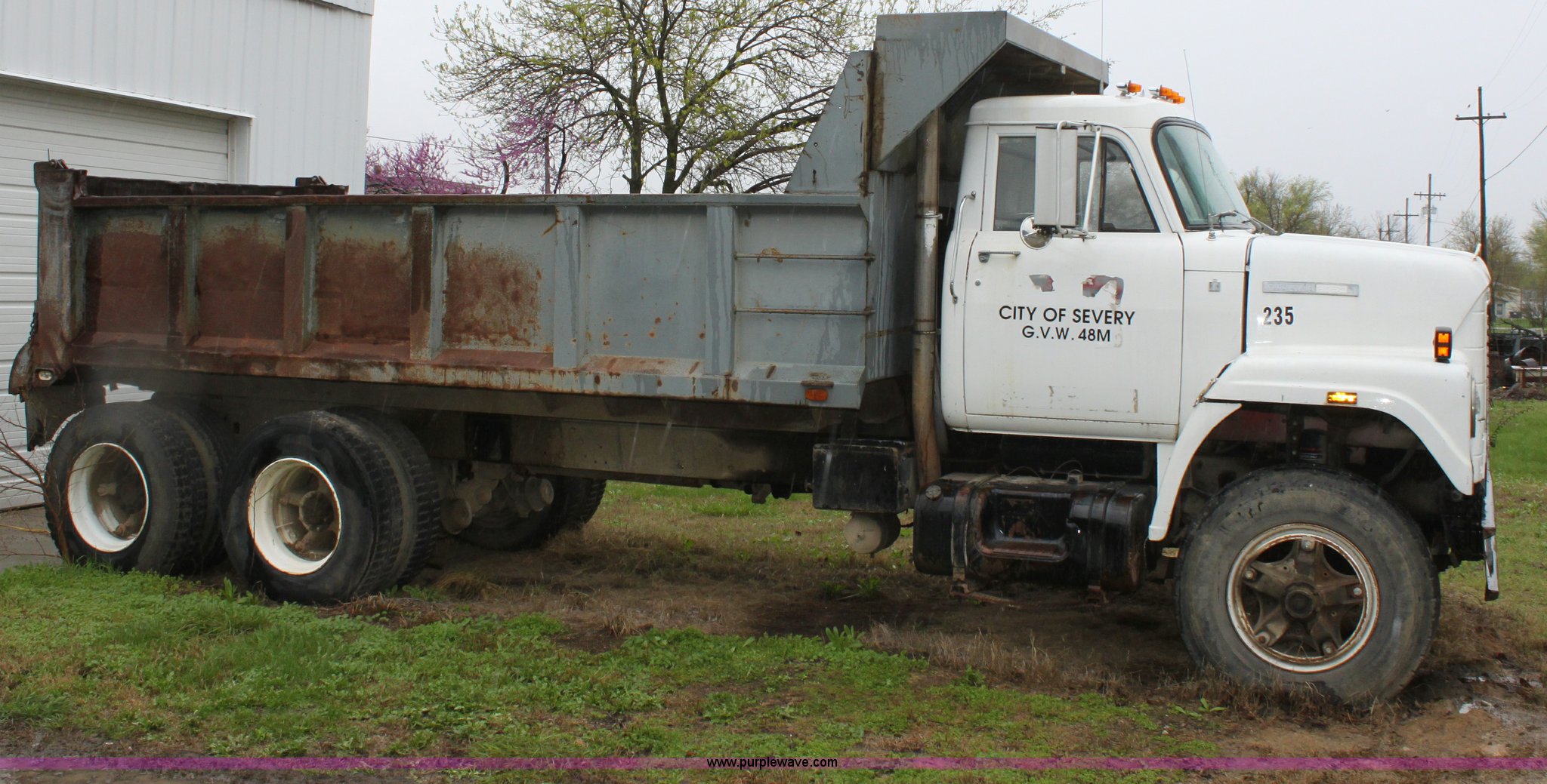 1974 International Fleetstar 2050 tandem axle dump truck. 94,726 miles on odometer, 2,422 hours on meter, Caterpillar V8 diesel engine Serial 32Y83953, Automatic transmission, Differential lock, Heater, Air brakes, Chelsea PTO, new, Manual release end gate, Dual fuel tanks, Spring suspension, 36" side boards, 11R22.5 tires, GVWR 48,860 lbs, Hoist leaks. Title distribution may be delayed up to 14 days from verification of funds. 75795DGB25322. City of Severy. 100 N Kansas. Severy, KS 67137