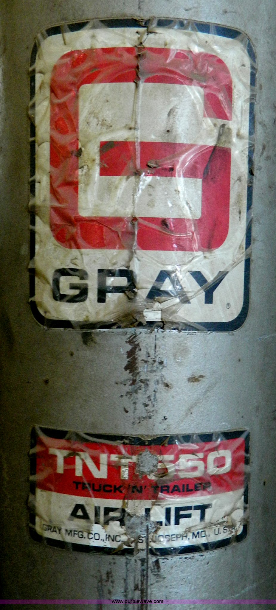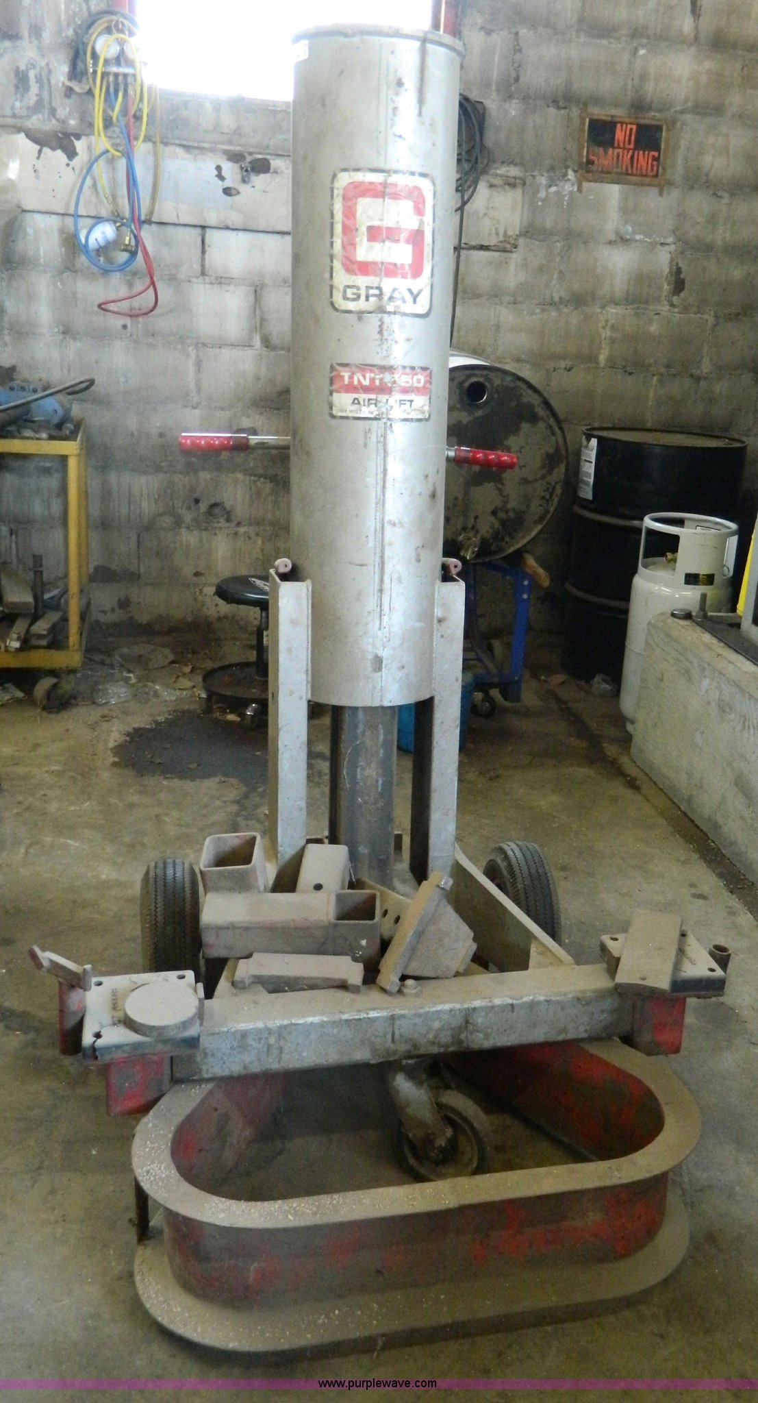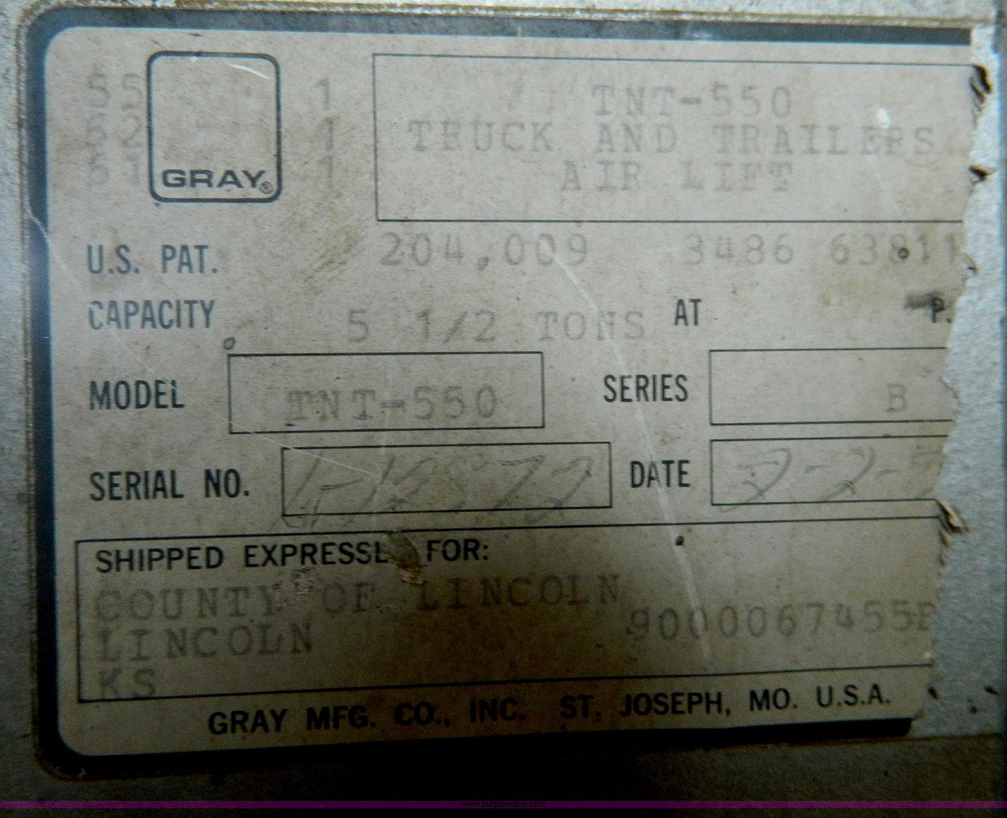 Gray 5 1/2 ton bumper jack. TNT 550, Air over hydraulic, Bleeds down, needs seal kit, Serial 12872. Lincoln County Highway. 216 E Lincoln Ave.. Lincoln, KS 67455