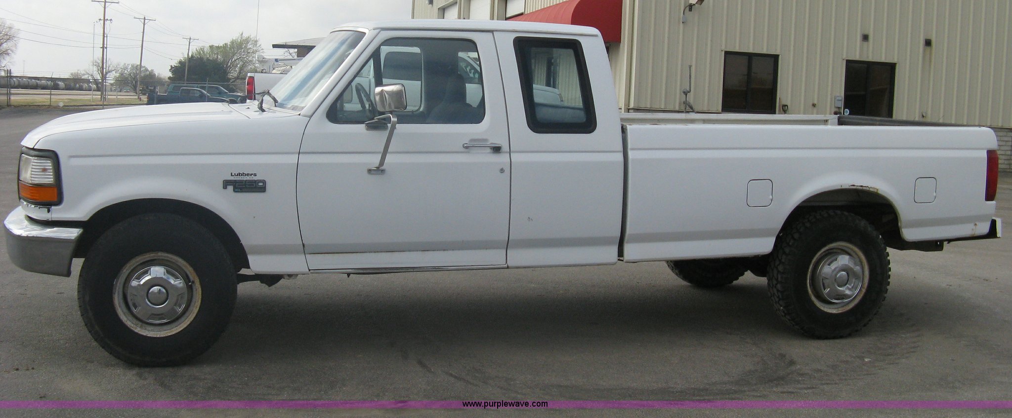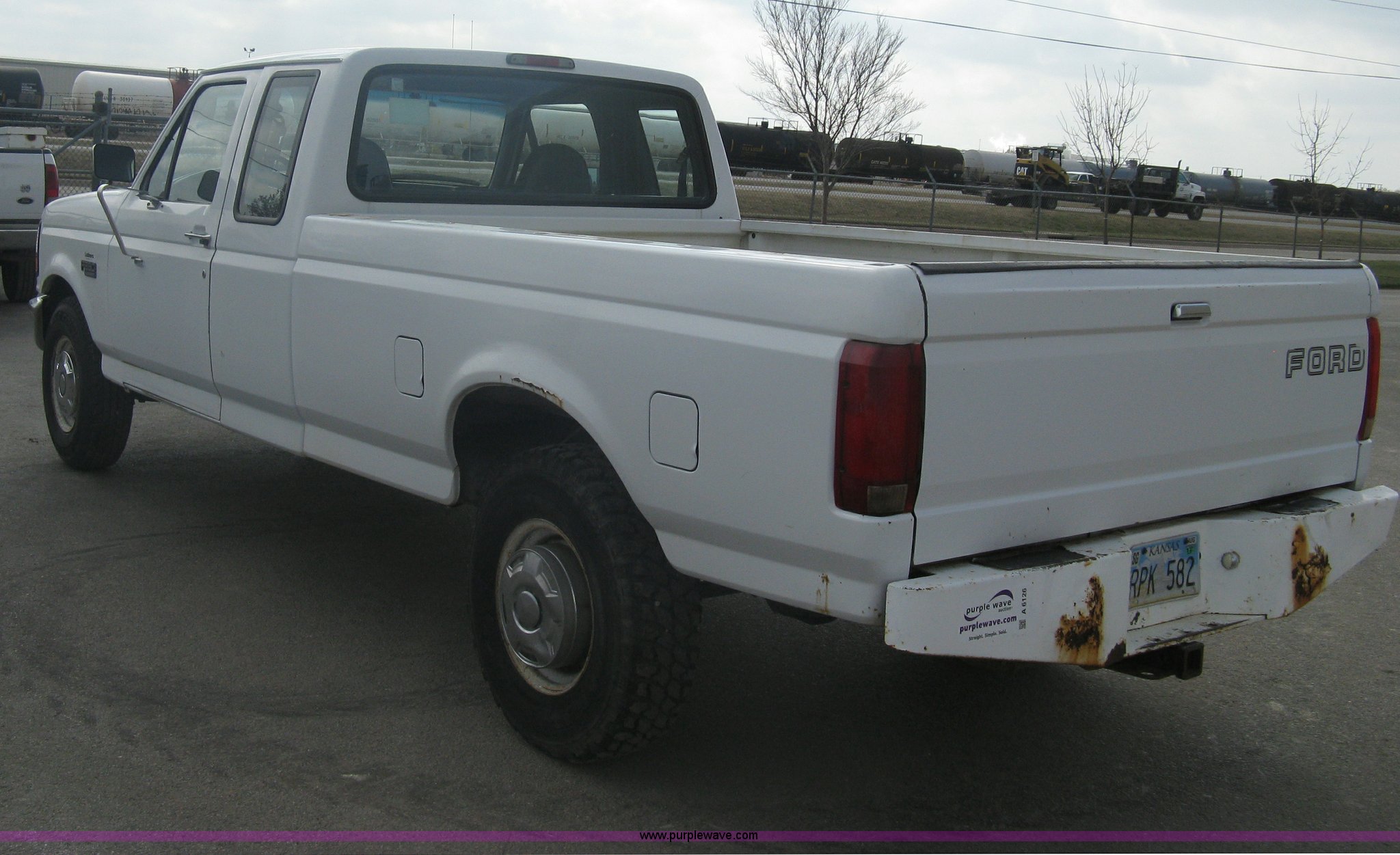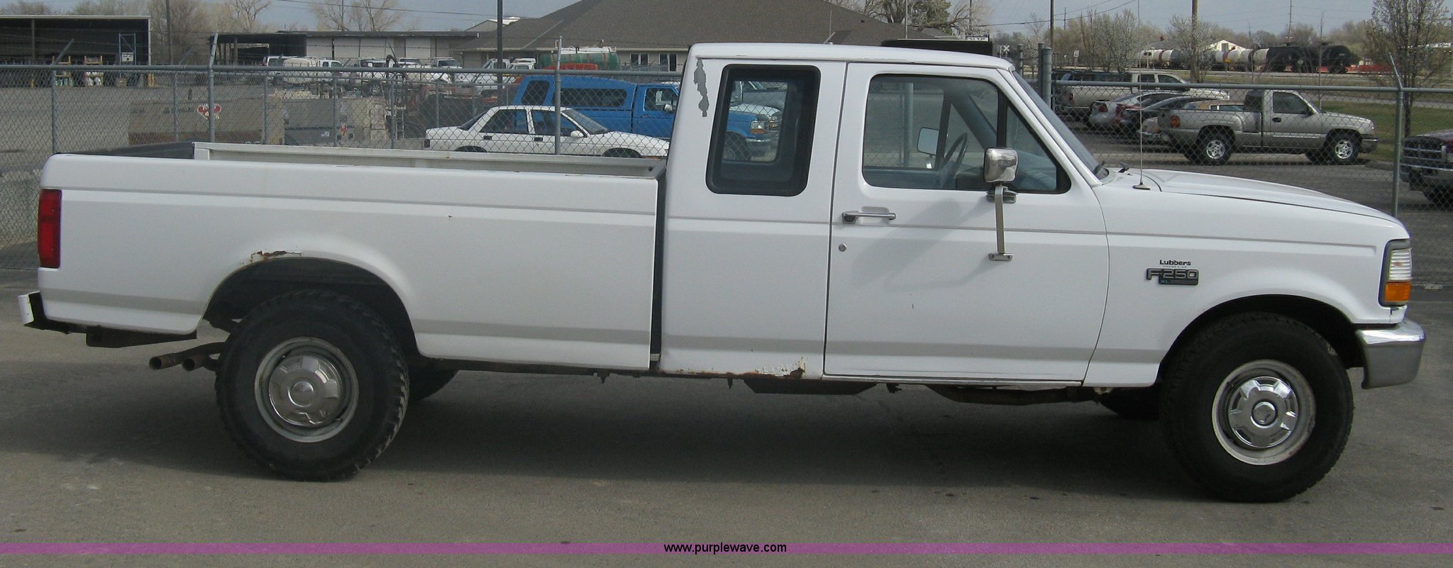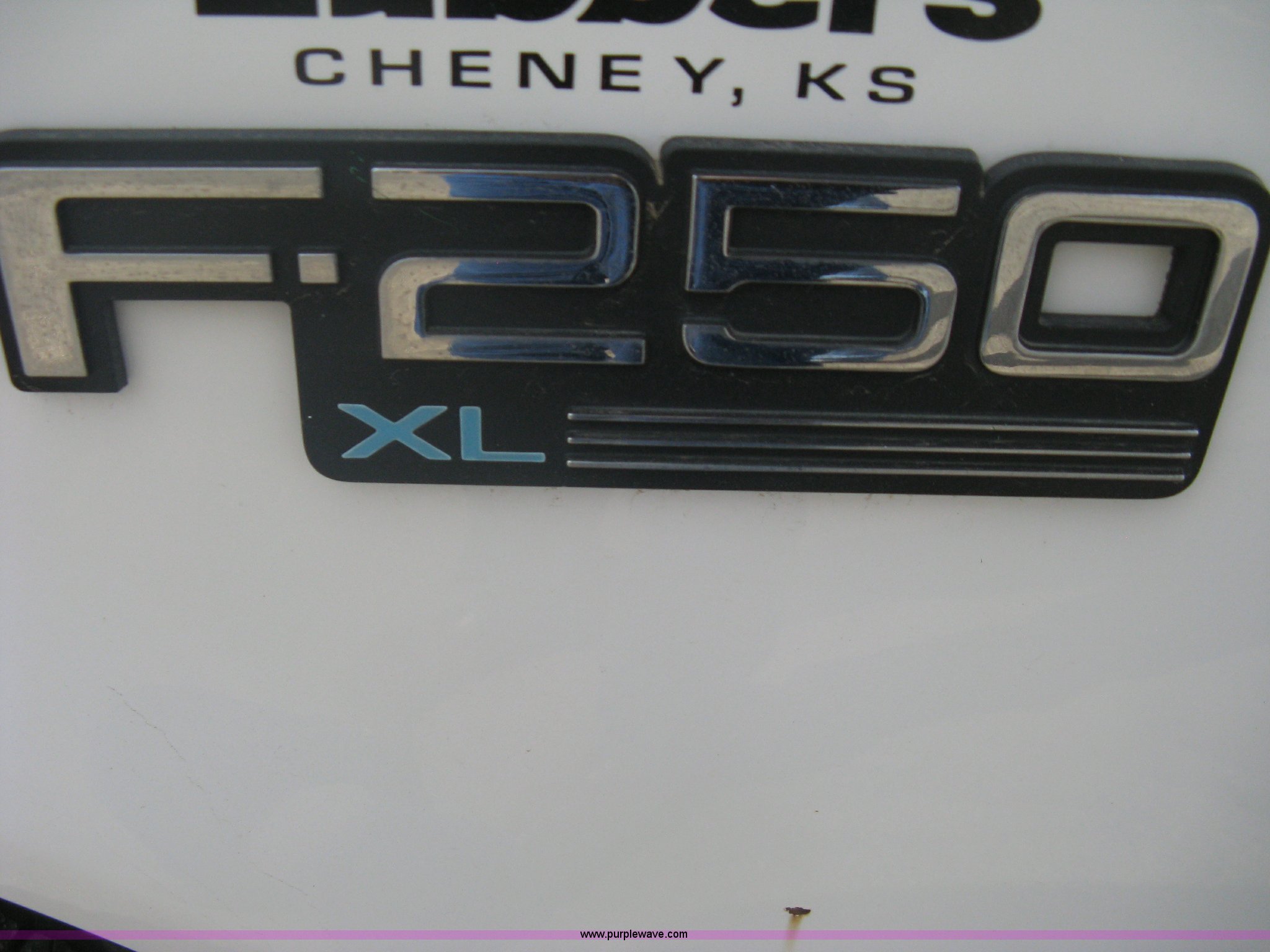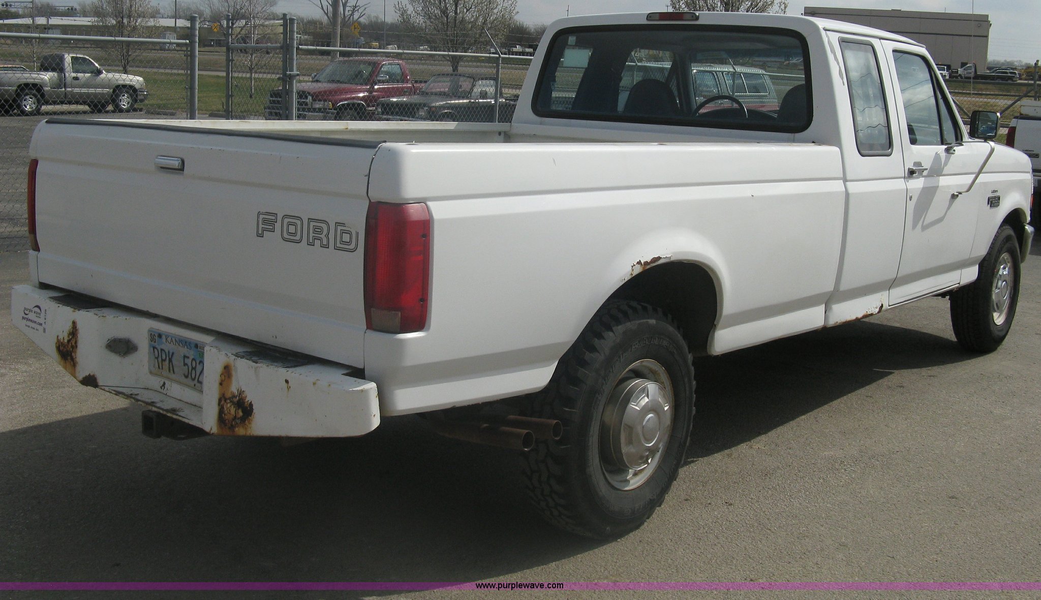 Purple Wave is selling a used Passenger Vehicle in Kansas. This item is a 1996 Ford F250 XL SuperCab pickup truck with the following: 143,425 miles on odometer, 5.8L V8 EFI gas engine, Five speed manual transmission, AC and heat, AM/FM/Cassette, Manual windows and locks, Auxiliary gas tank, Receiver hitch, Trailer wiring, LT235/85R16 tires, Exterior rust, Peeled paint, Dash cracked, Interior/exterior cosmetic damage