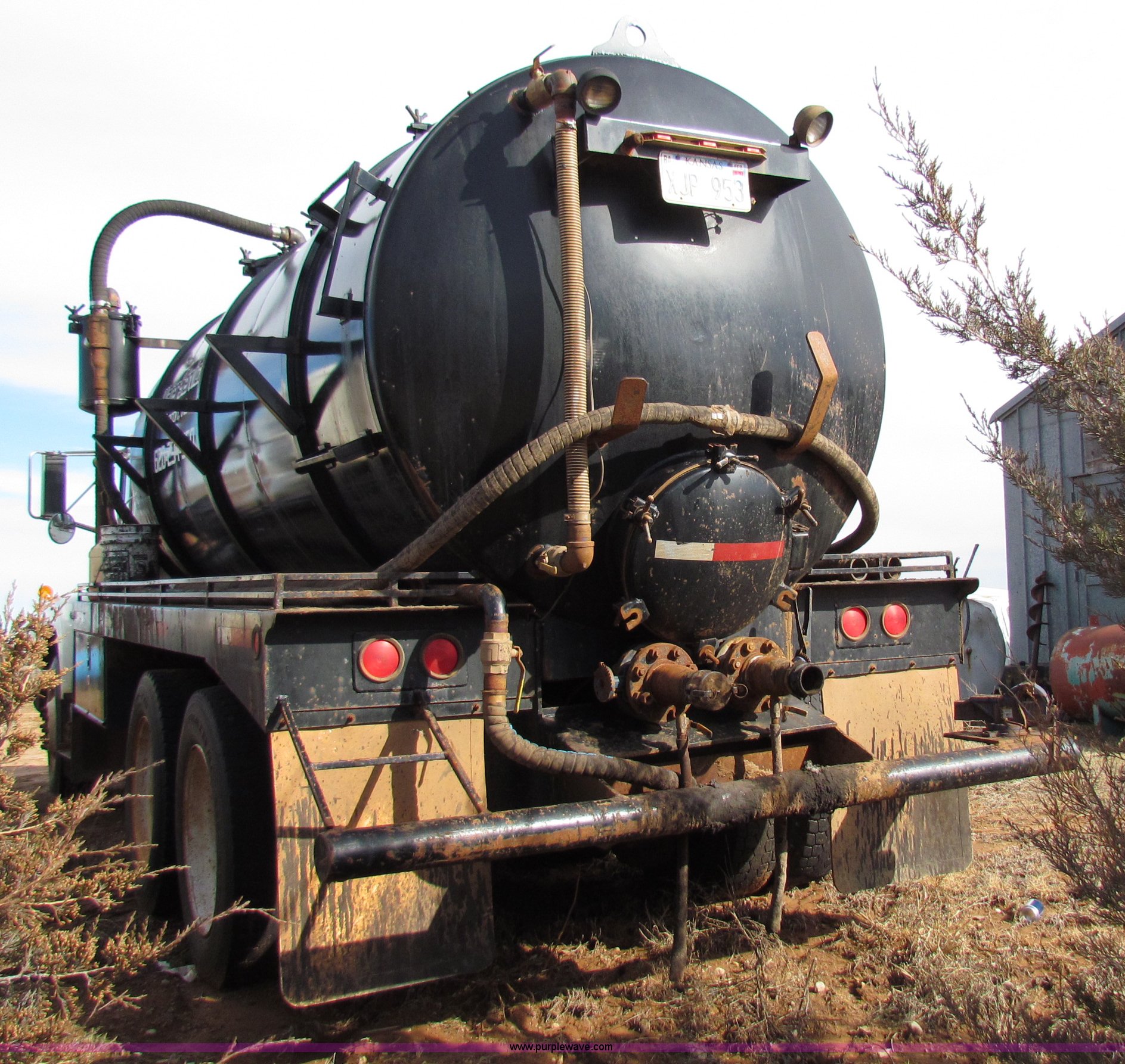 Purple Wave is selling a used Tank Truck or Water Truck in Kansas. This item is a 1989 Mack RD688S water tanker semi truck with the following: 289,680 miles on odometer, 5,383 hours on meter, Mack E6 11.0L six cylinder diesel engine, 13 speed manual transmission, Replacement transmission, 7,000 miles use, Twin screw, Air brakes, Throttle stop, Chelsea PTO, Four year old tank and pump, 80 barrel tank, Tank liner, Camel back suspension, 285/75/24.5 tires, Needs suspension work