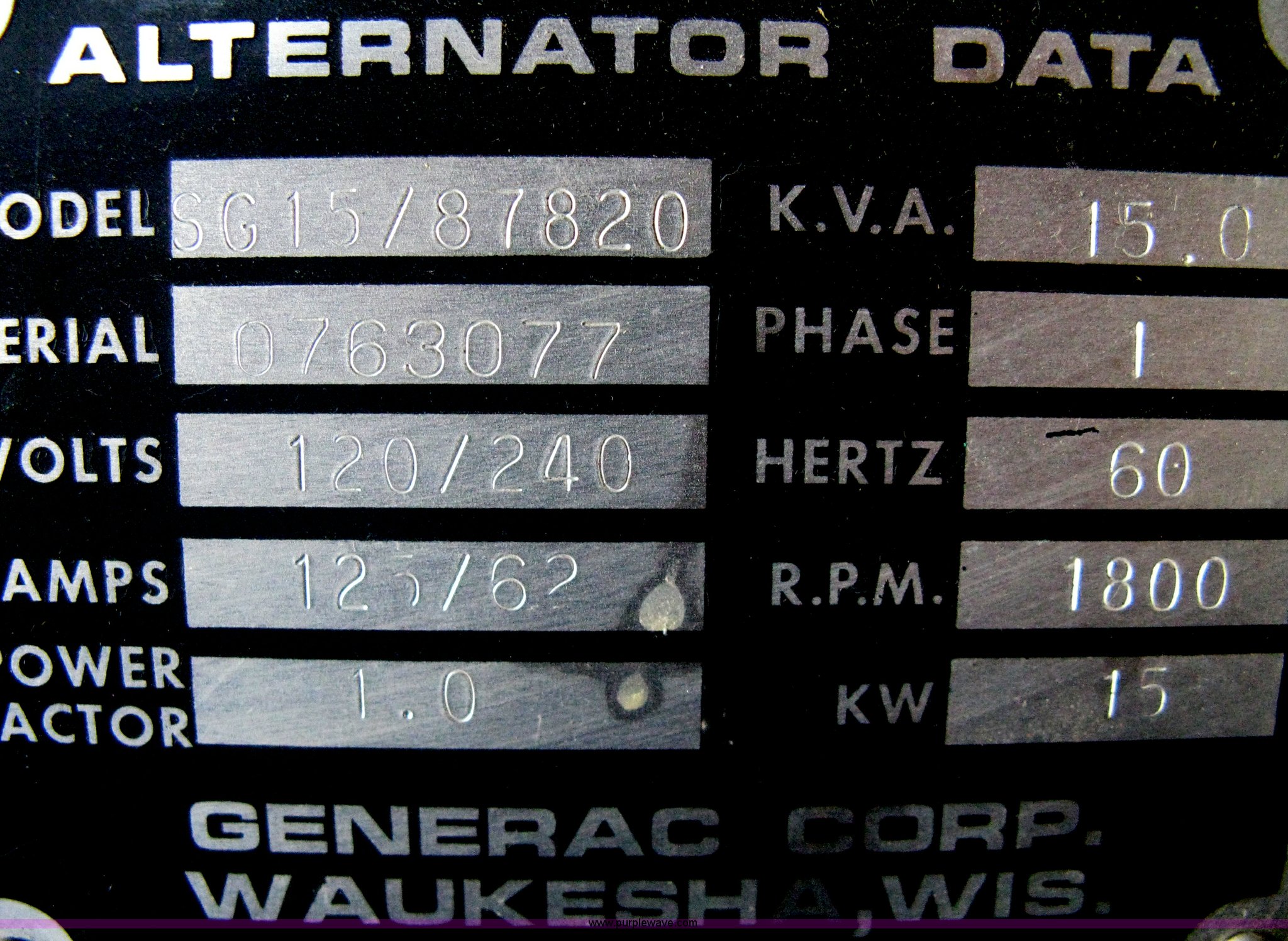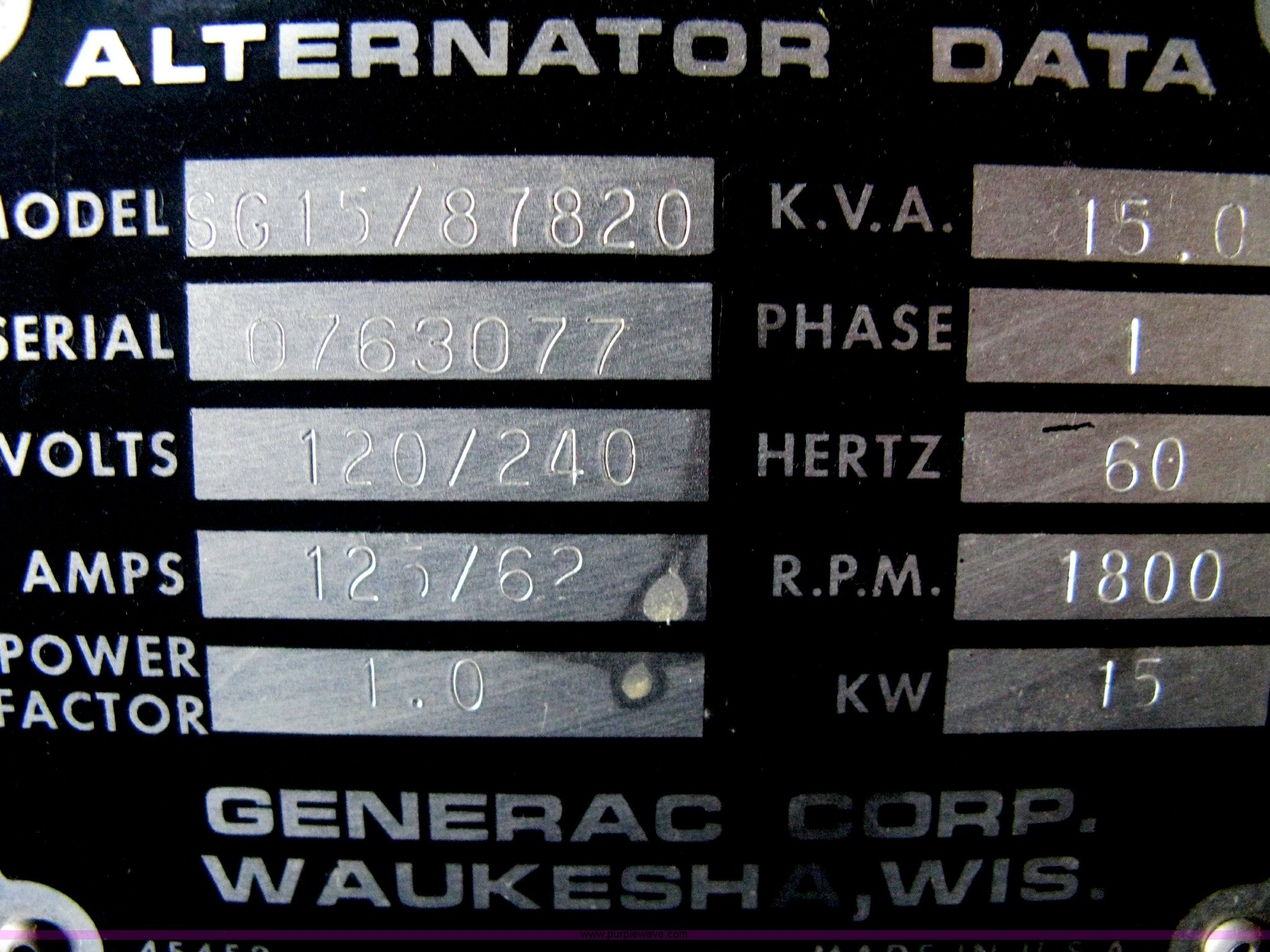 Purple Wave is selling a used Generator Set in Kansas. This item is a Generac gas powered generator with the following: 849 hours on meter, Four cylinder gas engine, Model SG15/87820, 120/240v, 125/62 amp, 15 KVA, Single phase, 60 Hz, 1,800 RPM, Serial 0763077