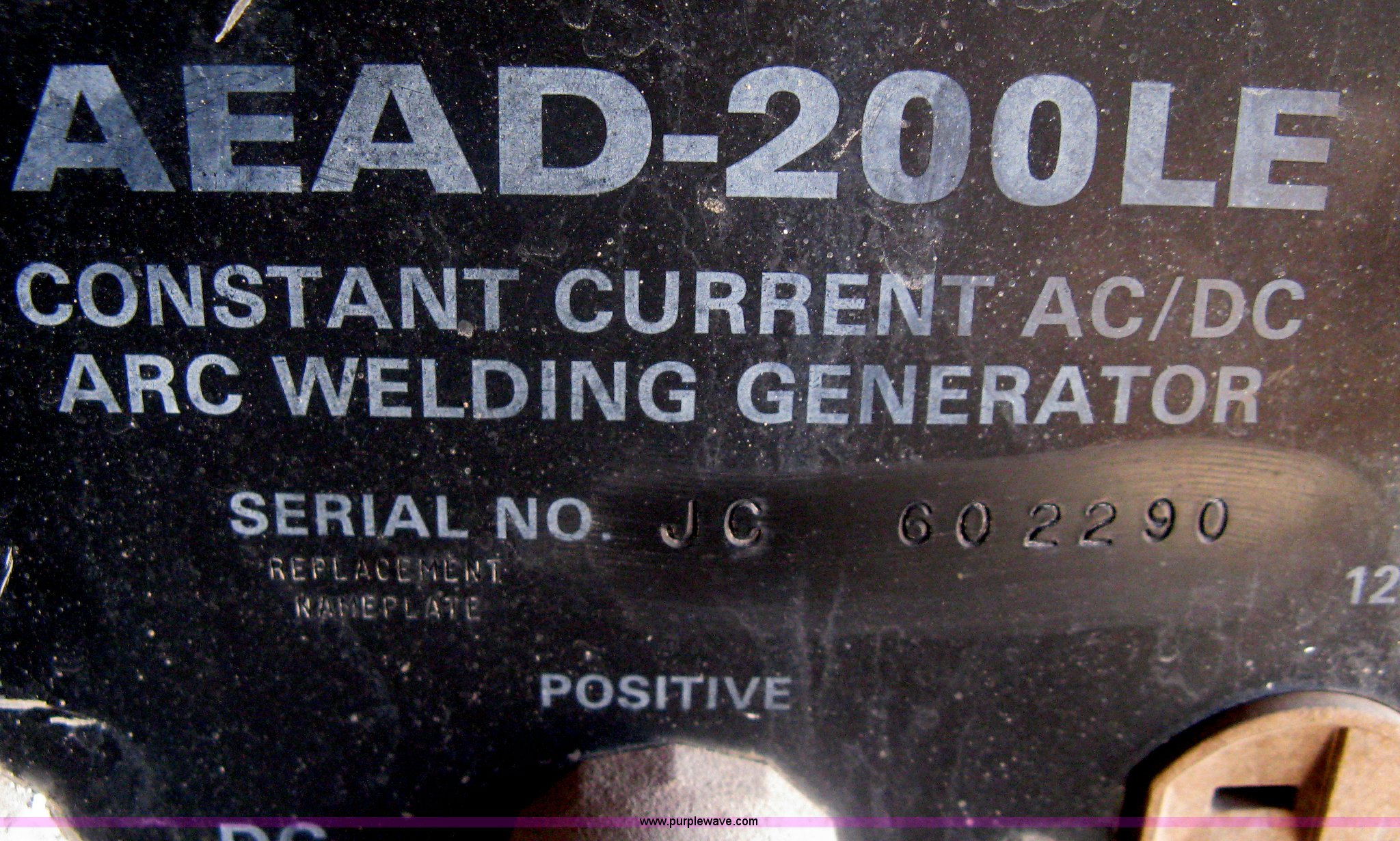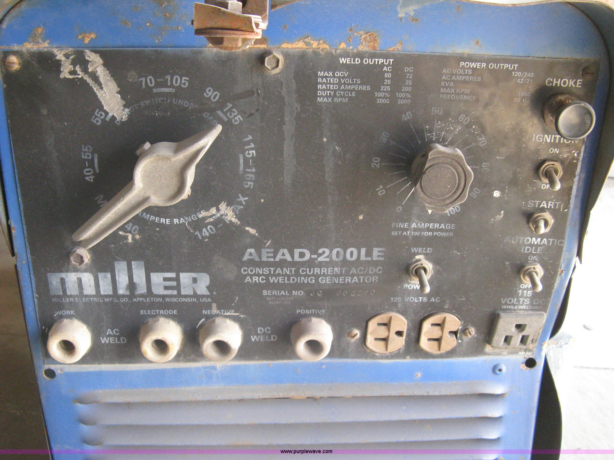 Purple Wave is selling a used Welder (Manual) in Kansas. This item is a Miller AEAD-200LE welder/generator with the following: Constant current AC/DC arc welder, Engine knocks, Operating condition unknown, Serial JC602290