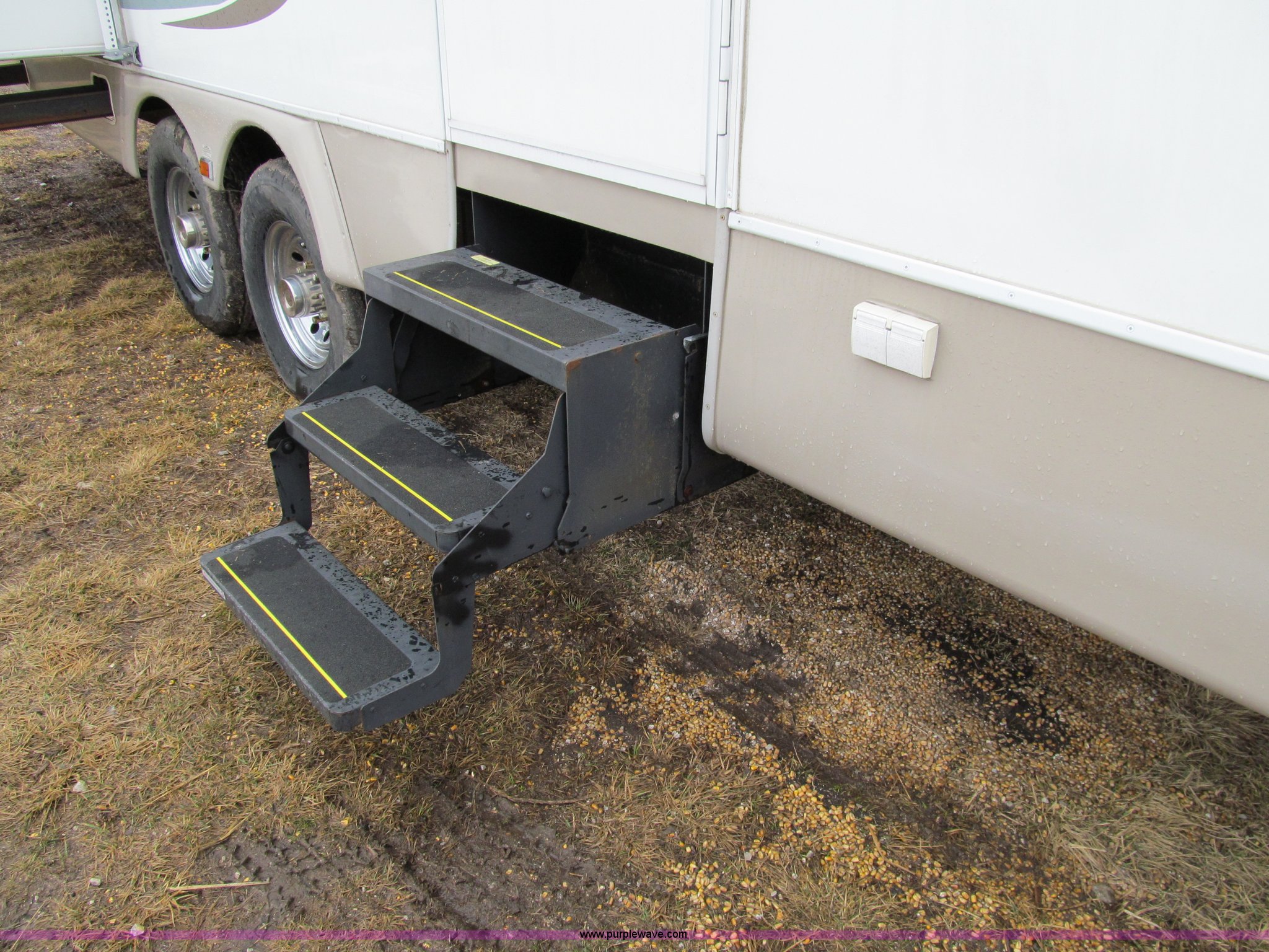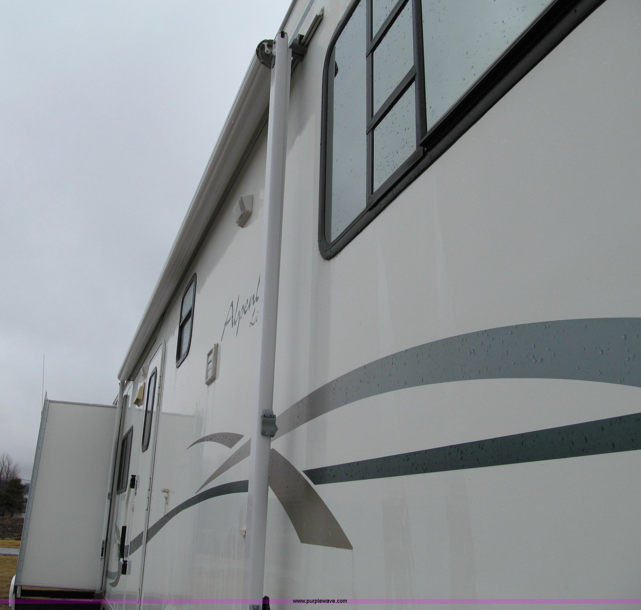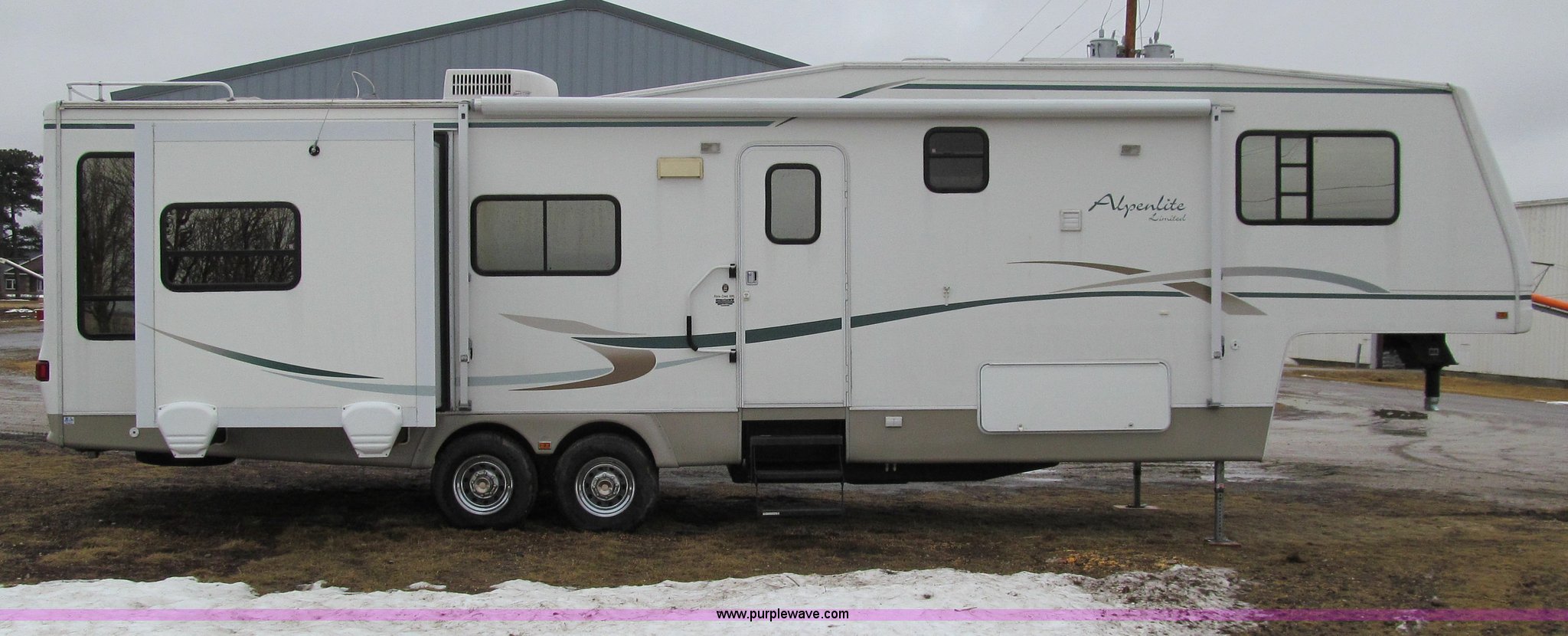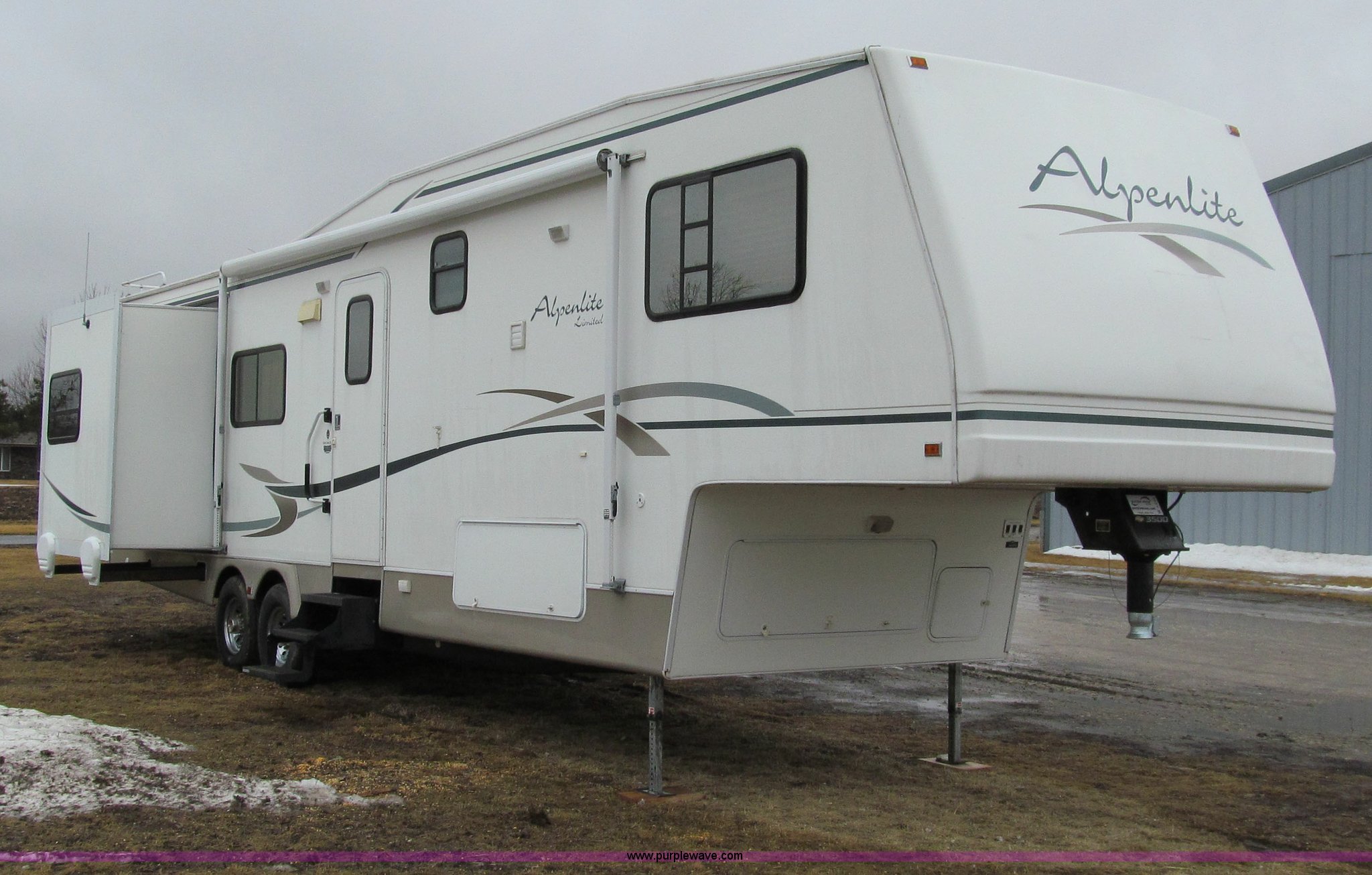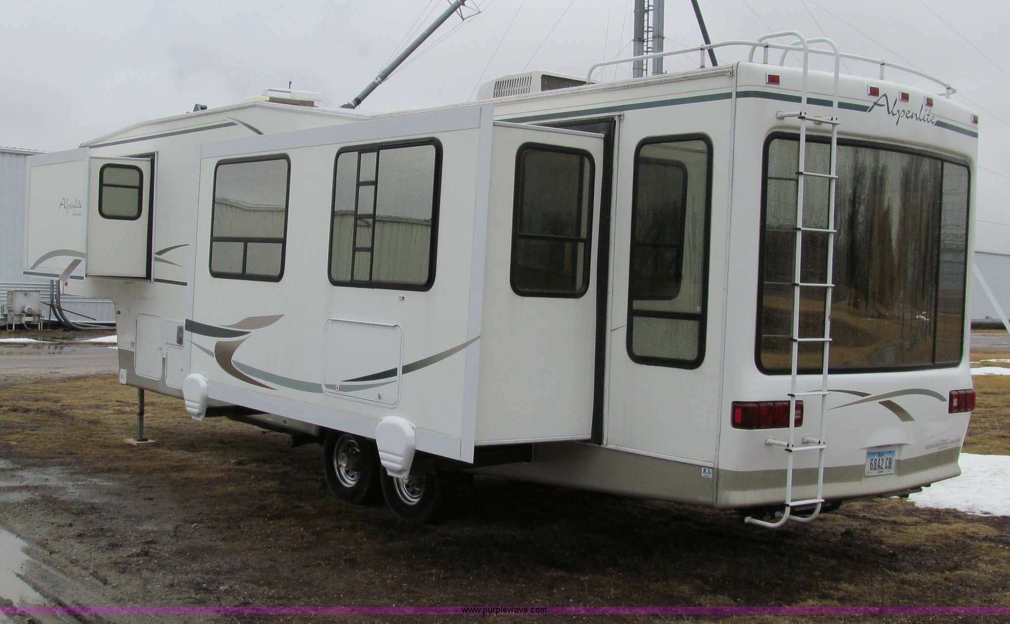 Purple Wave is selling a used RV in Iowa. This item is a 2002 Western Alpenlite Limited 36RL fifth wheel camper with the following: Tandem axle, Dinette with four chairs, Sofa, converts to bed, (2) recliner chairs, Desk, Entertainment center, 27" television, Stereo, DVD/CD player, Disc changer, 50 amp service with 30 amp cord, AC and furnace, Central vacuum, Three burner stove with oven, Microwave, Royal refrigerator/freezer, Center vanity with shower, Side aisle toilet, Kenmore stackable washer/dryer, Queen bed, 19" television, damaged, Front closet, Electric front stabilizer jacks, A&E 17' awning, (4) 6v batteries, (2) propane tanks, Rear ladder, Battery disconnect, Spare wheel and tire, Goodyear LT235/85R16 tires, 8 bolt rims