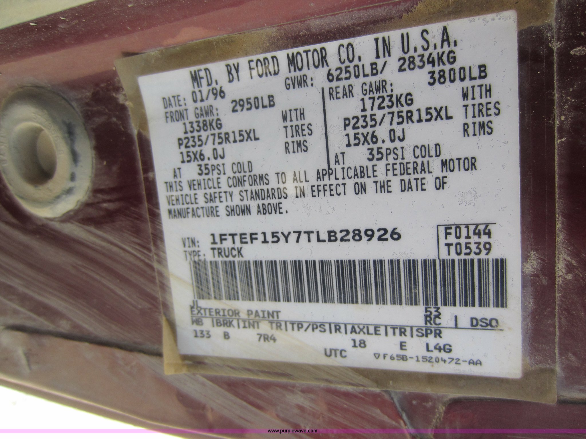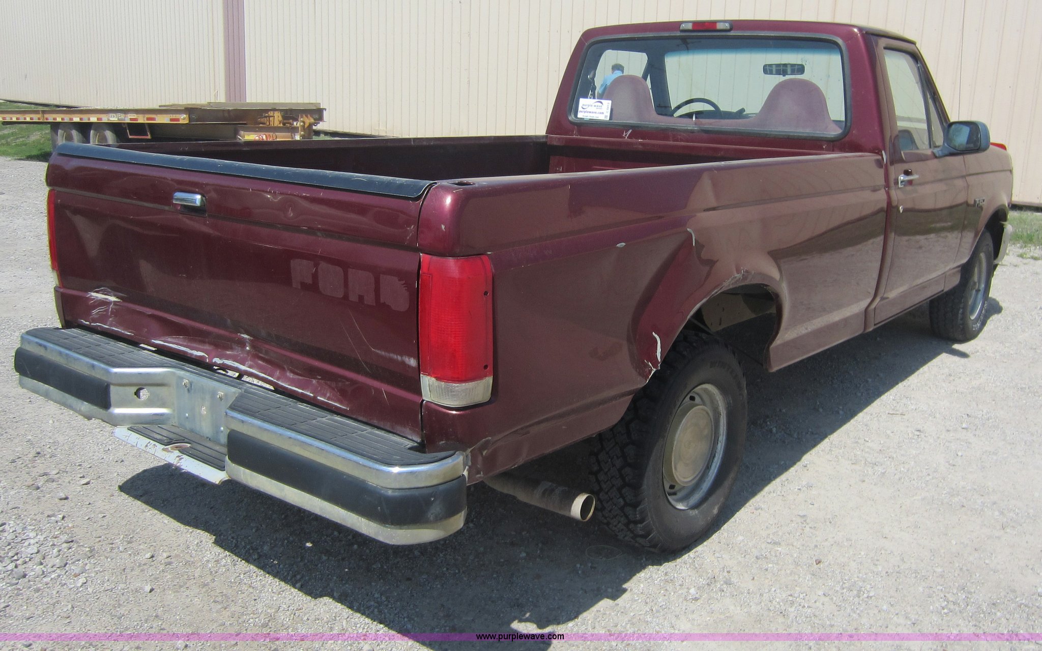 Purple Wave is selling a used Passenger Vehicle in Kansas. This item is a 1996 Ford F150 pickup truck with the following: 239,037 miles on odometer, 4.9L I6 EFI engine, Automatic transmission, AC and heat, AM/FM, Manual windows and locks, Cloth interior, LT235/75R15 tires, Interior/exterior cosmetic damage, Check engine light on