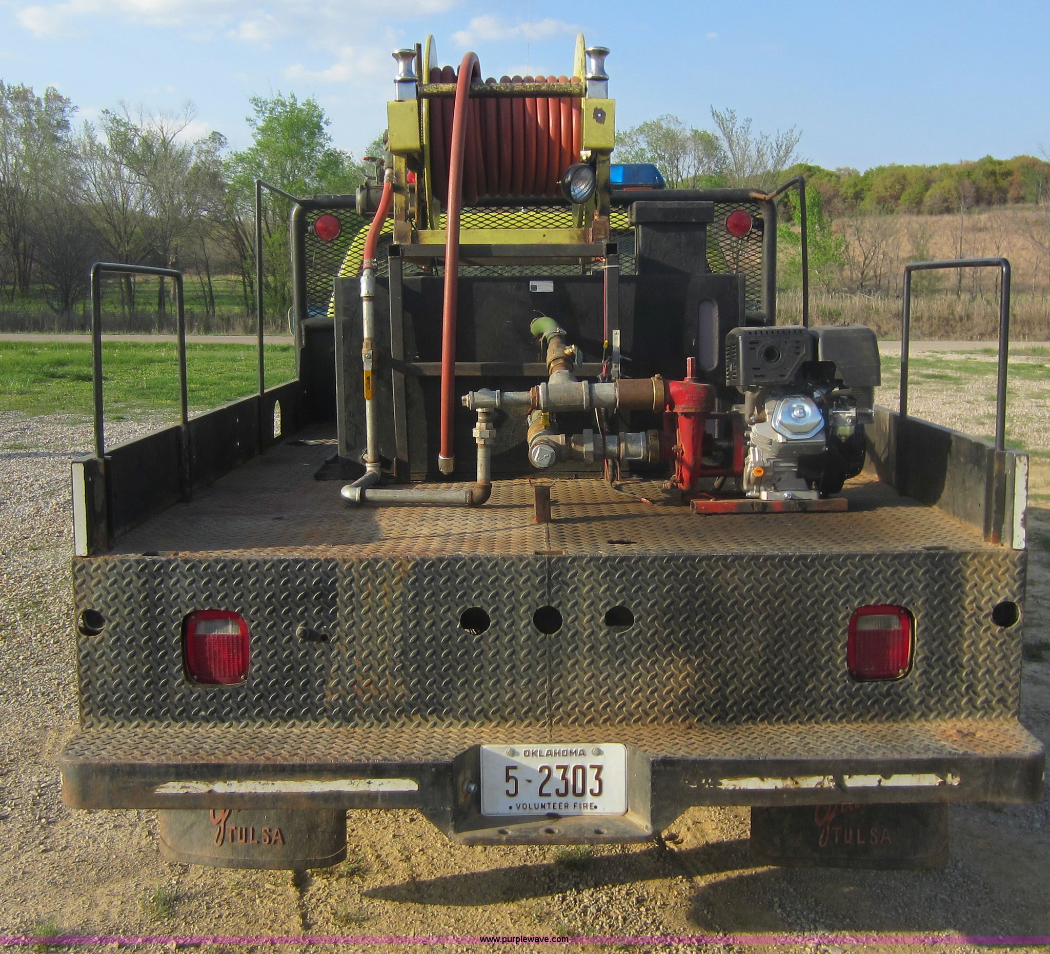 1989 Chevrolet V3500 fire truck. 7,386 miles on odometer, 350 5.7L V8 gas engine, Automatic transmission, Four wheel drive, Heater, AM/FM, Manual windows and locks, Vinyl interior, Light bar, Fog lights, Ramsey front mount 8,000 lb winch Remote, Needs repair, Flatbed, 300 gallon poly tank 2" inlet and outlet, 13 HP gas engine, Siren, Electric hose reel with 100' of 1" hose, 265/75R16 tires, Extra passenger door included, Unit# 23. 1GBHV34K3KJ111029. Boulanger Rural Fire Dept.. 1273 CR 4860. Pawhuska, OK 74056
