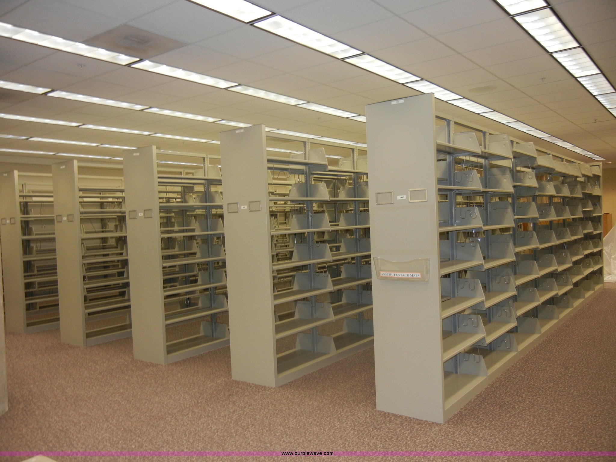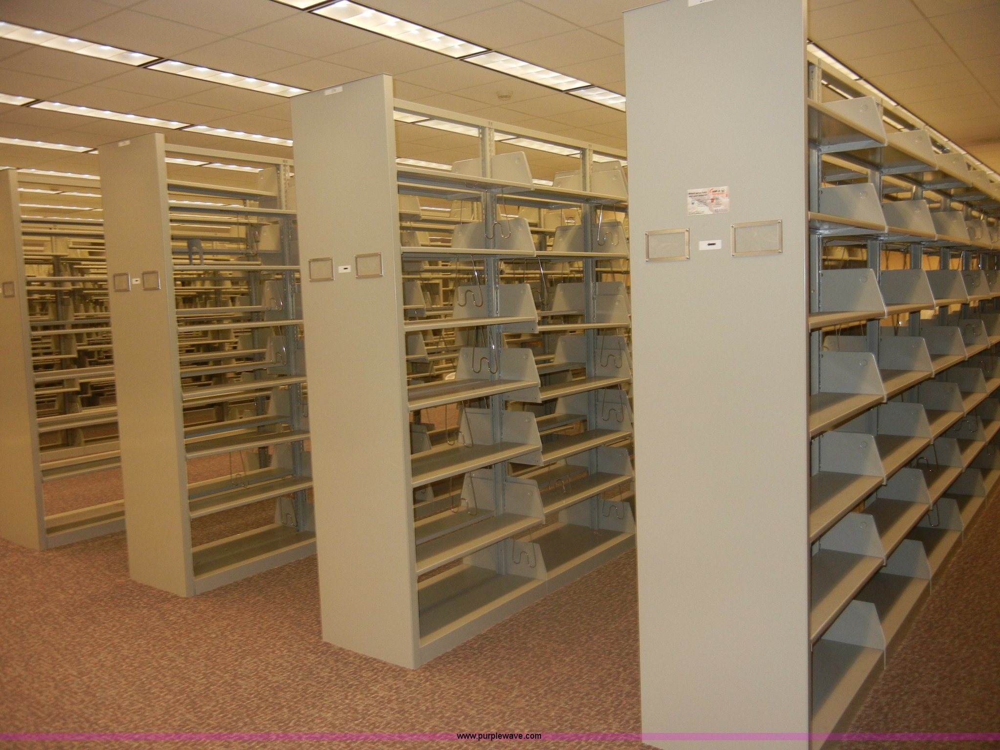 Purple Wave is selling a used Shelving and Storage in Kansas. This item is a Double faced cantilever library bureau metal shelving with the following: 10"W shelves, 36"W sections, 90"H, (102) erected sections, Buyer must disassemble and remove