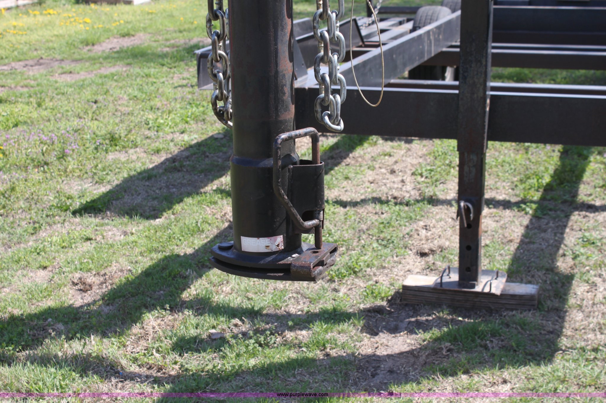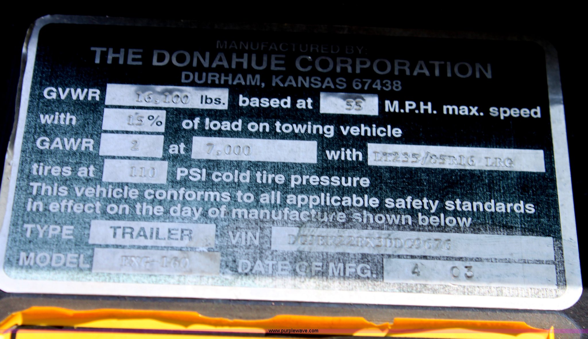 2003 Donahue EXG160 tandem axle swather trailer. GVWR 16,100 lbs, Gooseneck hitch, 5' fold down ramps, Steel deck and wheel troughs, Adjustable rear wheel troughs, Dual braking axles, 235/85R16 tires. DC9KK22FX3DDC9676. Shipping quotes available. 542 W Grant. Lindsborg, KS 67456