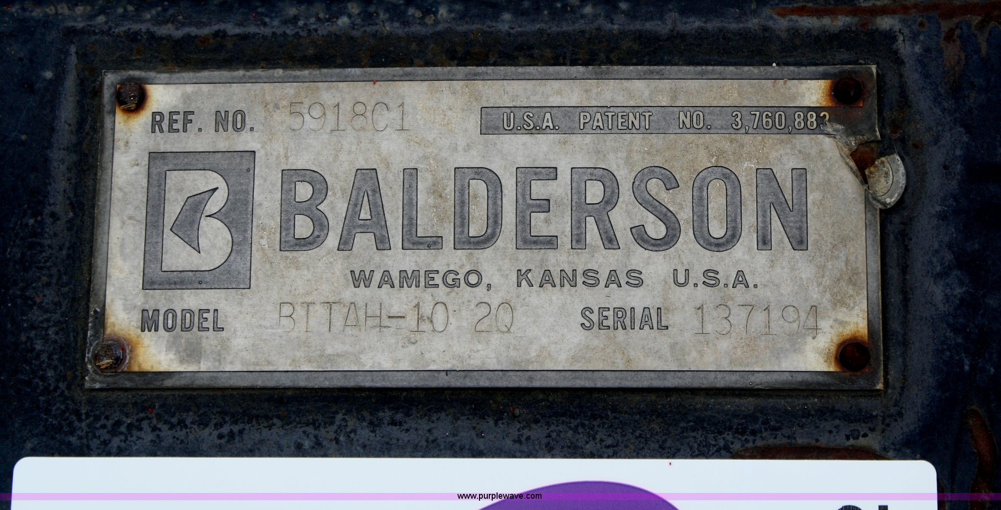 Balderson 10' blade. Hydraulic angle, Removed from IT 28 loader, Model BTTAH-10-20, Serial 137194. Shipping quotes available. Lexeco. 1901 S 2nd. Leavenworth, KS 66048