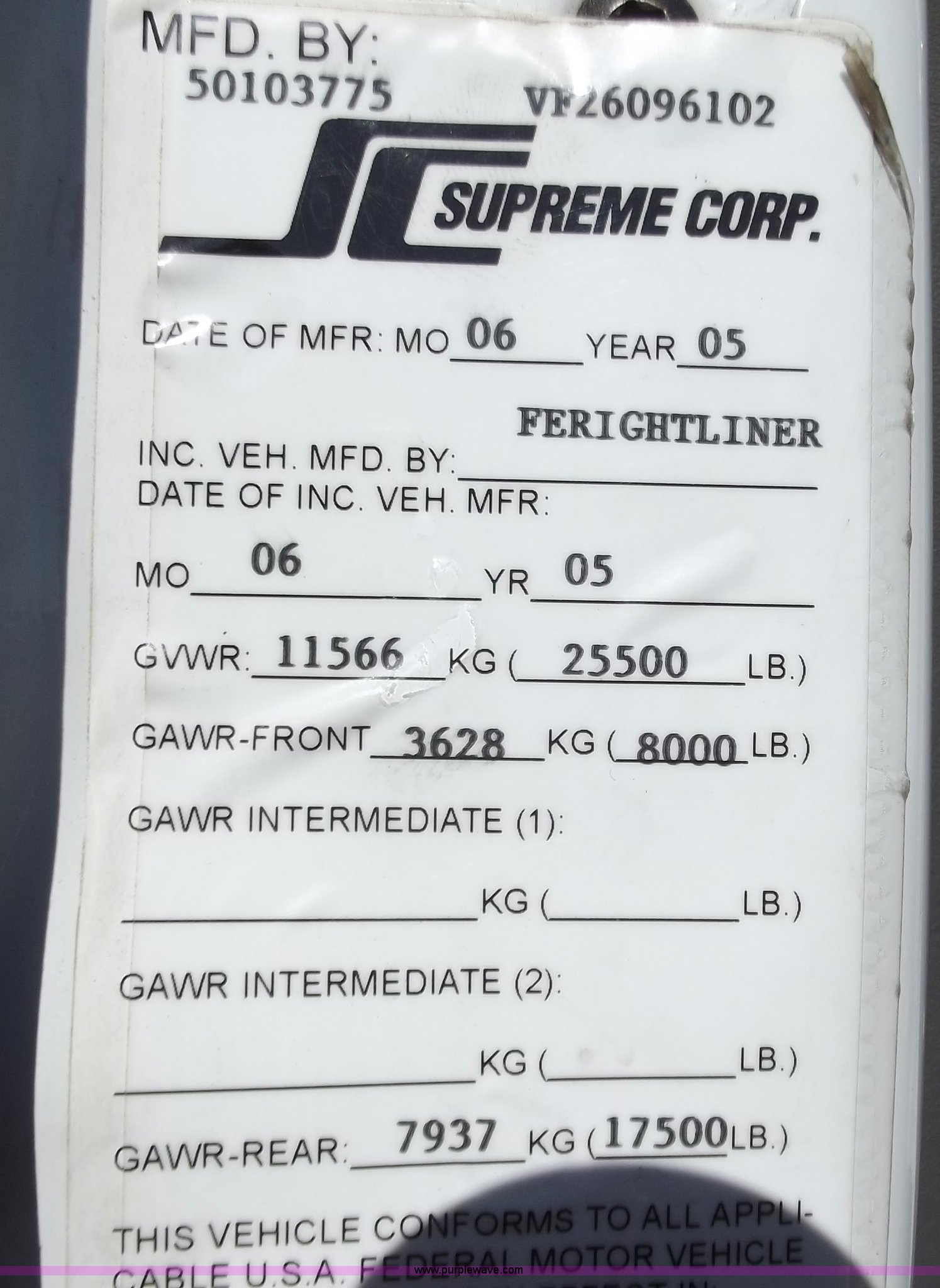 Purple Wave is selling a used Flat Bed Truck in Missouri. This item is a 2006 Freightliner M2 106 flatbed truck with the following: 523,950 miles on odometer, Mercedes-Benz MBE 900 6.4L six cylinder diesel engine, 230 HP, Six speed manual transmission, AC and heat, Cruise, AM/FM, Air ride seat, Air ride cab, Electric brake controller, Bumper, Block heater, 80 gallon fuel tank, Rear exhaust stack, CM flatbed, 12'L x 94"W, (4) storage boxes, Stake pockets, Rub rail, Headache rack, Window, Gooseneck ball, Fifth wheel hitch, Receiver hitch, Trailer wiring, Air suspension, Air brakes, 295/75/22.5 tires, GVWR 25,500 lbs, FAWR 8,000 lbs, RAWR 17,500 lbs, 150" wheelbase, Check engine light is on, ABS light is on