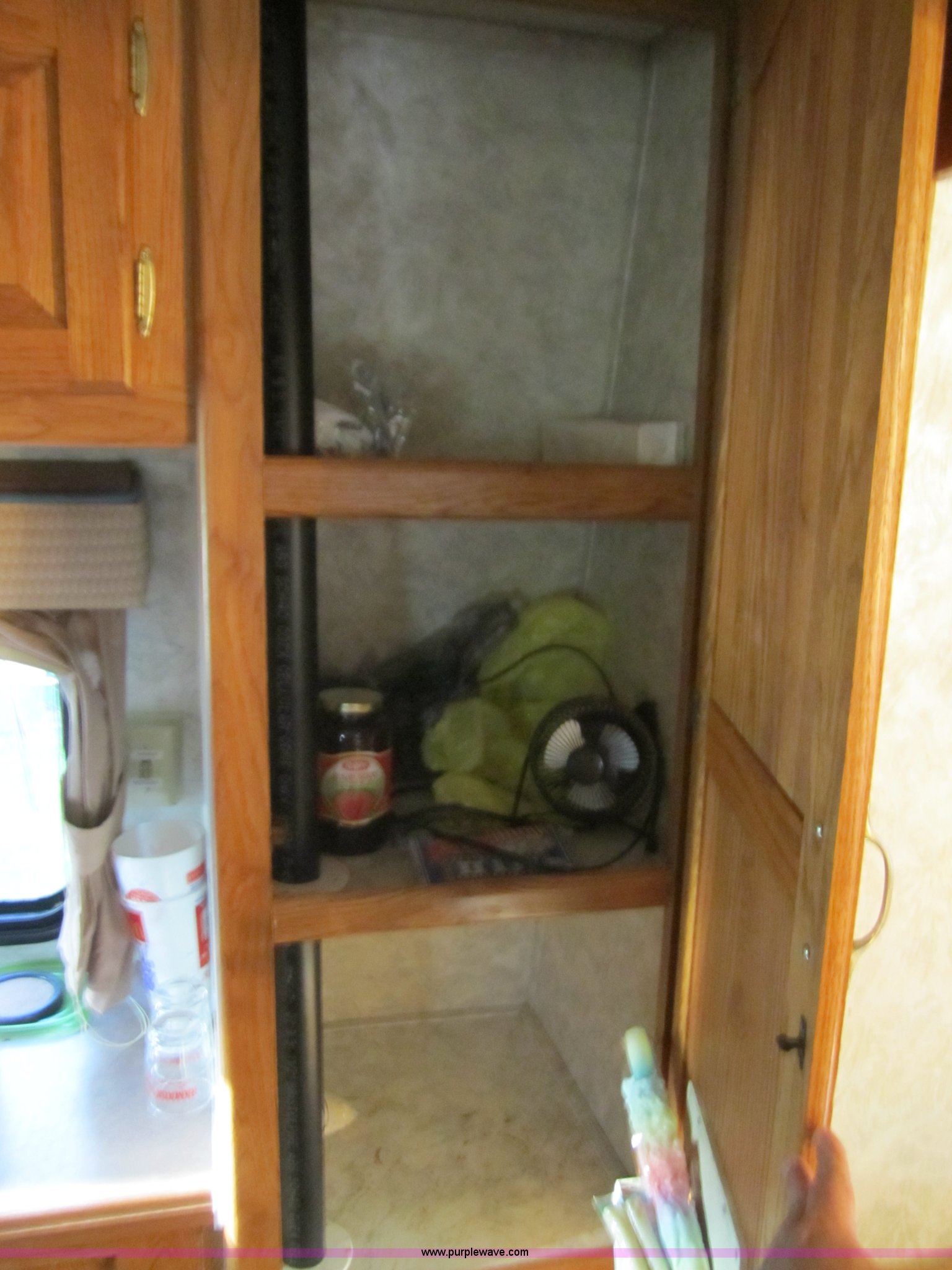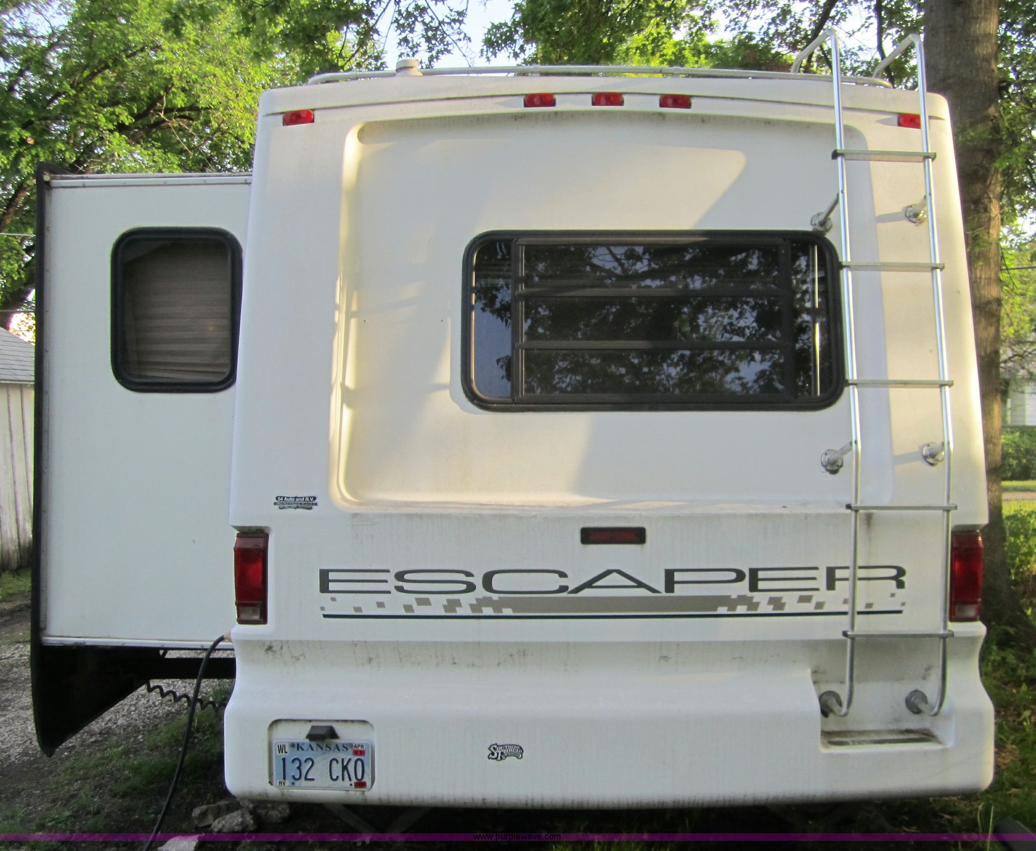 Purple Wave is selling a used RV in Kansas. This item is a 1995 Damon Escaper 30' fifth wheel camper with the following: Single slide out, 18' awning, Queen bed, Stove, microwave, fridge/freezer, Bathroom sink, toilet, shower, Dual propane tanks, AC and heat, AM/FM/Cassette, ST225/75R15 tires, GVWR 12,000 lbs, Deep freezer not included