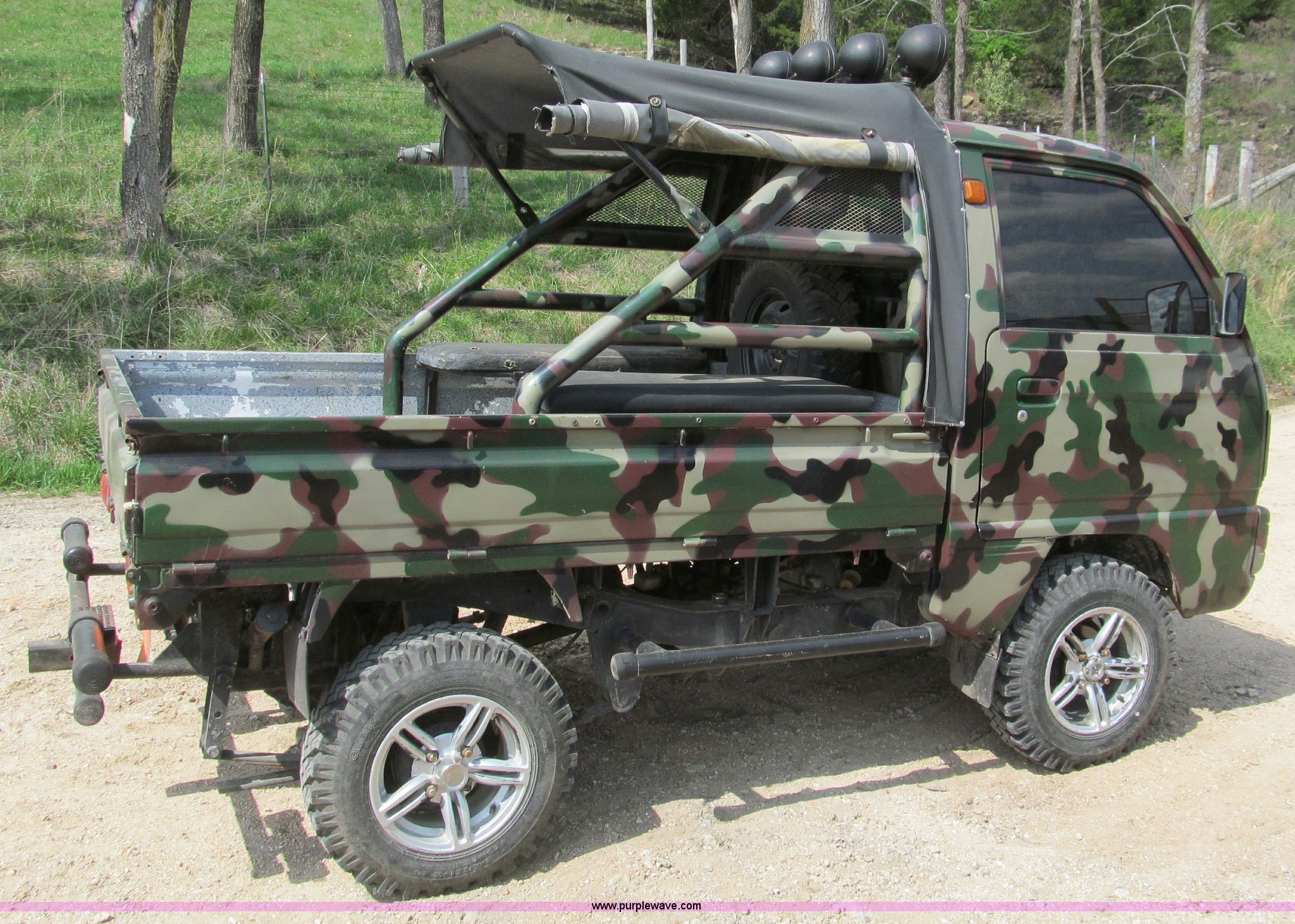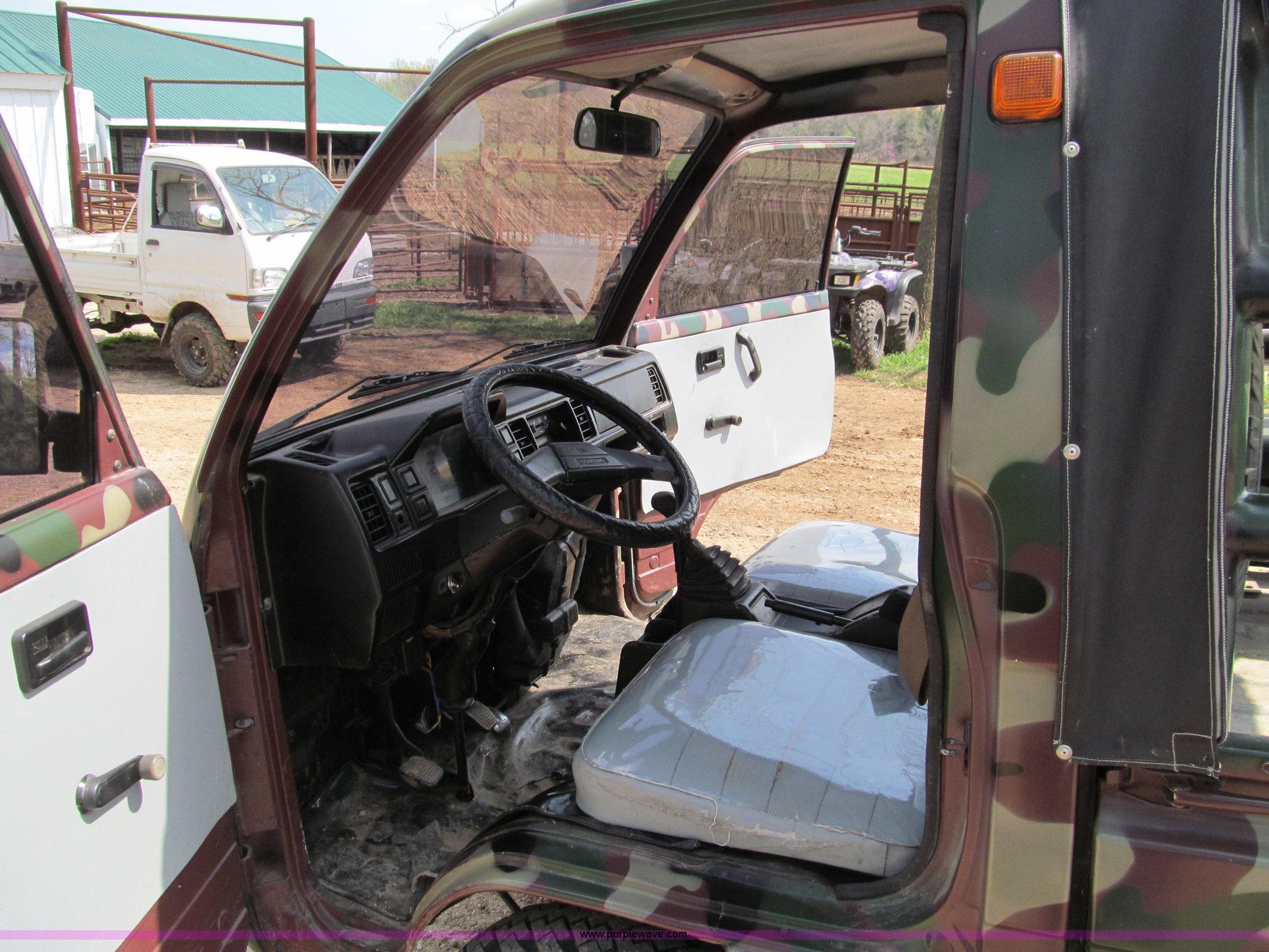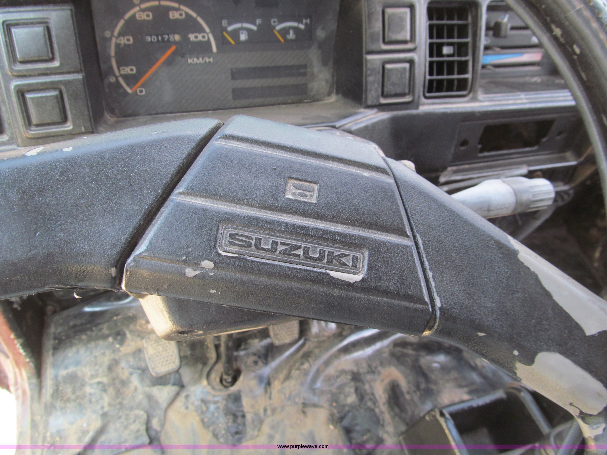Purple Wave is selling a used Utility Vehicle in Missouri. This item is a Suzuki utility vehicle with the following: 90,178 km on odometer, Three cylinder gas engine, Five speed manual transmission with Hi-Low range, Four wheel drive, Left hand drivers operation, Heater, Manual windows and locks, Vinyl interior, 6'4" x 4'7" bed, Fold down sides, 6.40/6.50-13 tires