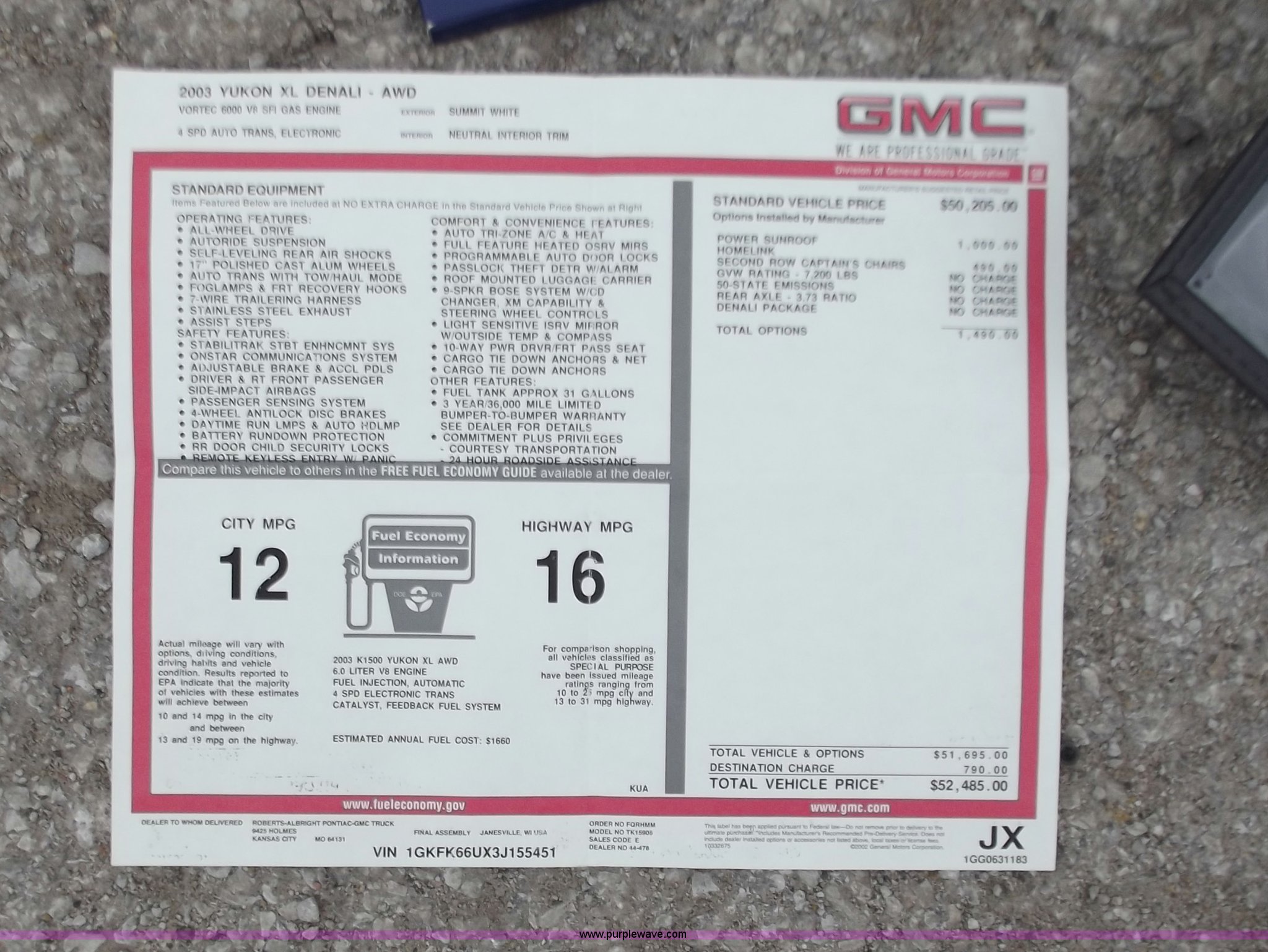 2003 GMC Yukon Denali 1500 XL AWD SUV has sold in Lee's Summit, Missouri for $11550. Item D3854 sold on May 2nd, 2012.