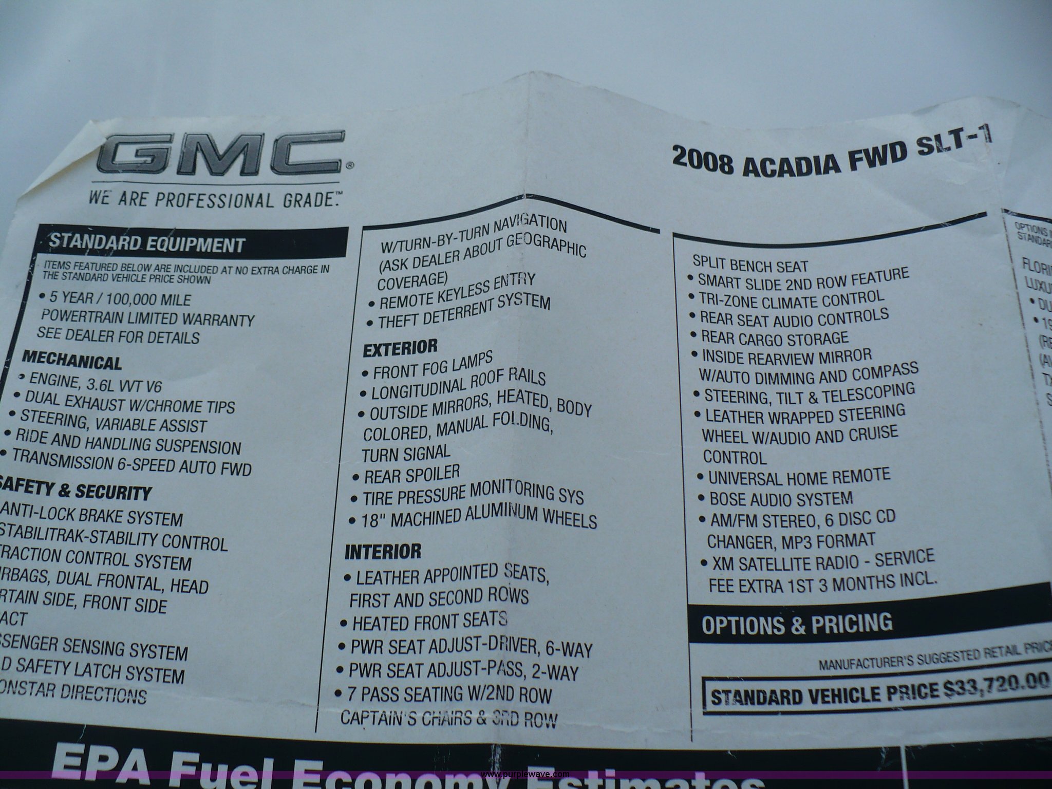 2008 GMC Acadia SLT SUV. 75,503 miles on odometer, 3.6L V6 SFI engine, Automatic transmission, Front wheel drive, AC and heat, Tilt, Cruise, AM/FM/Cassette, Bose sound system, 6 CD changer, XM radio, Power windows, locks, mirrors, and seats, Heated seats, Leather interior, Steering variable assist, Remote keyless entry, Sunroof, Aluminum wheels, P255/60R19 tires. 1GKER23788J172237. Shipping quotes available. Summit Construction Company. 15000 S Hamilton Rd. Greenwood, MO 64034