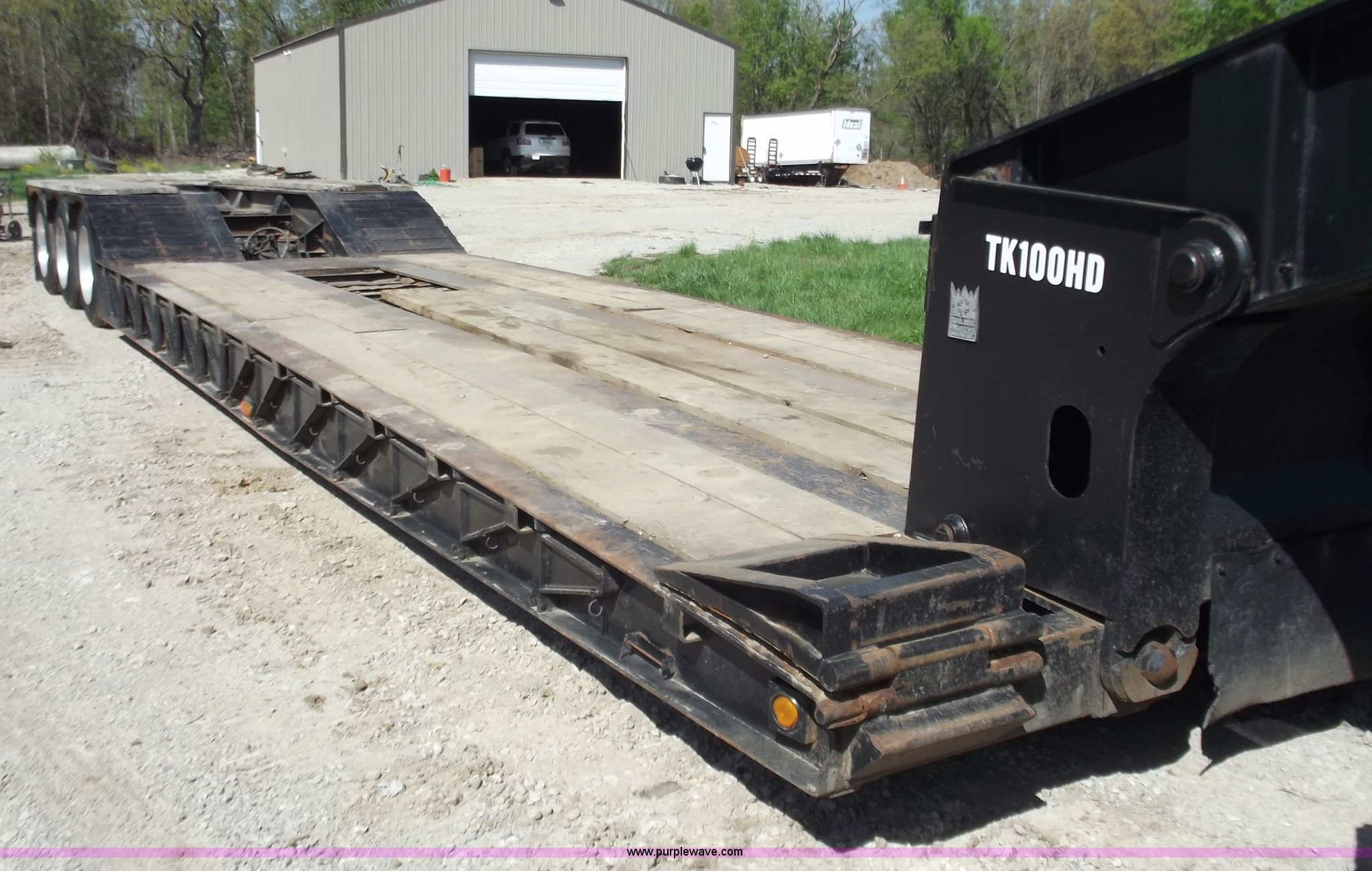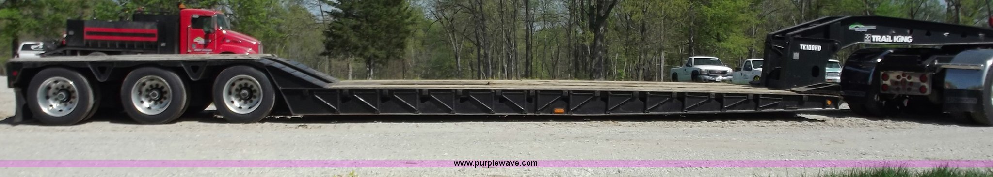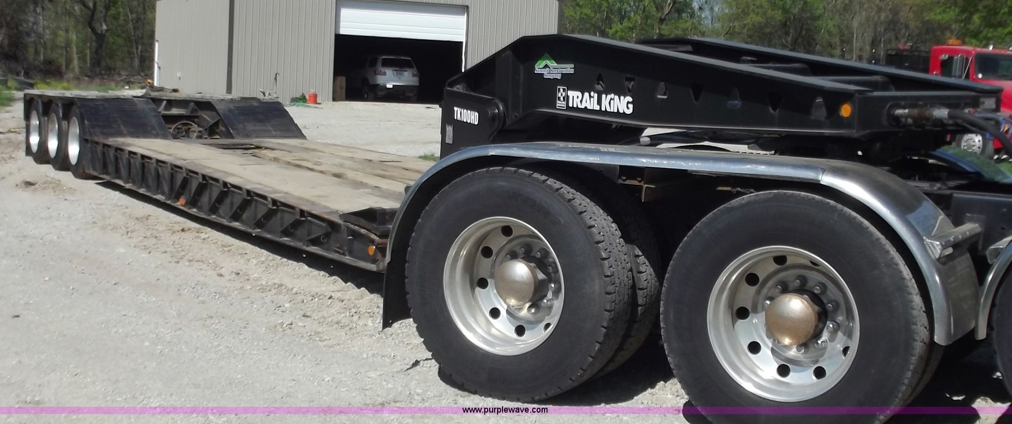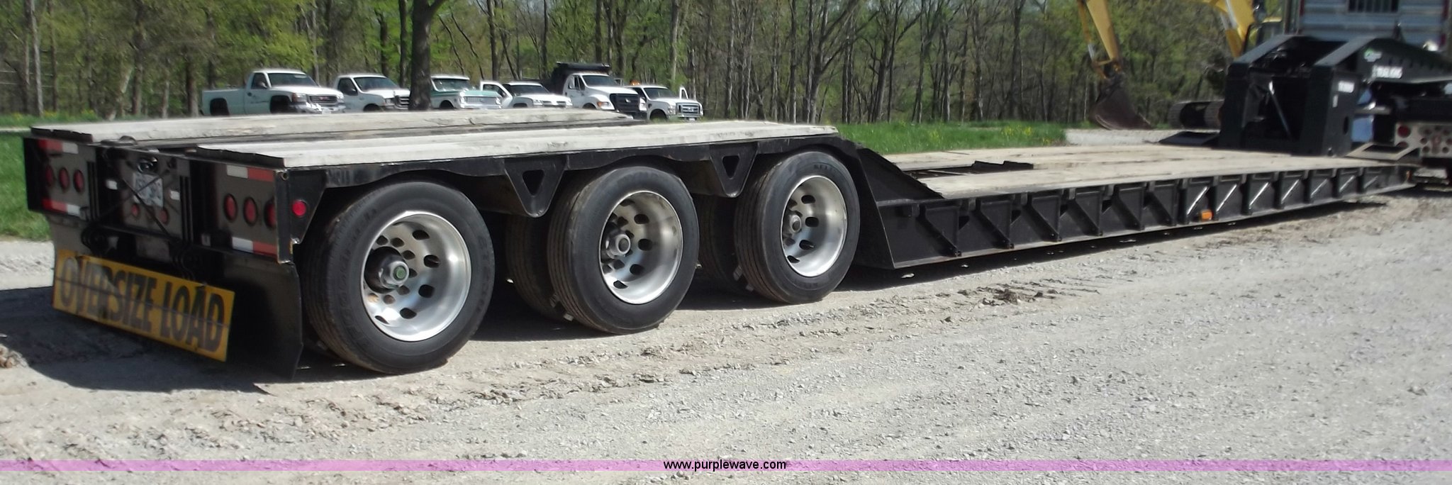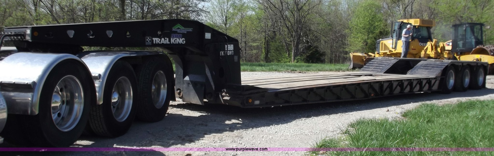 Purple Wave is selling a used Equip. Trailer in Missouri. This item is a 1999 Trail King 50 ton lowboy trailer with the following: Model TK100HDG-533, GVWR 133,320 lbs, GAWR 20,280 lbs, 100,000 lbs concentrated load rating, 40'L, 24' flat deck, 12' top deck above tires, 4' ramp, 24" fold down ramps, 14" to 26" fold out extenders, Air suspension, Air brakes, Aluminum wheels, 225/70R22.5 tires, Oversize load sign on rear, One air bag will need replaced