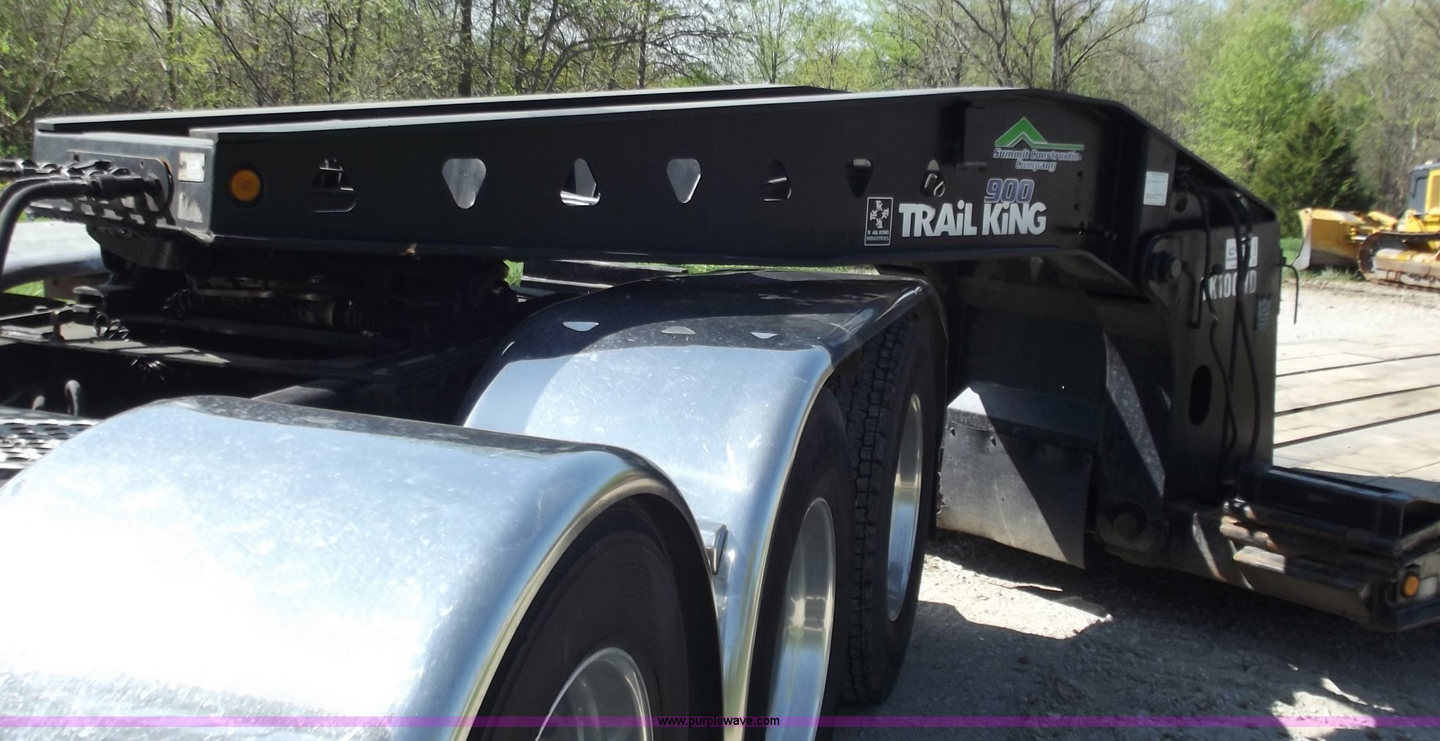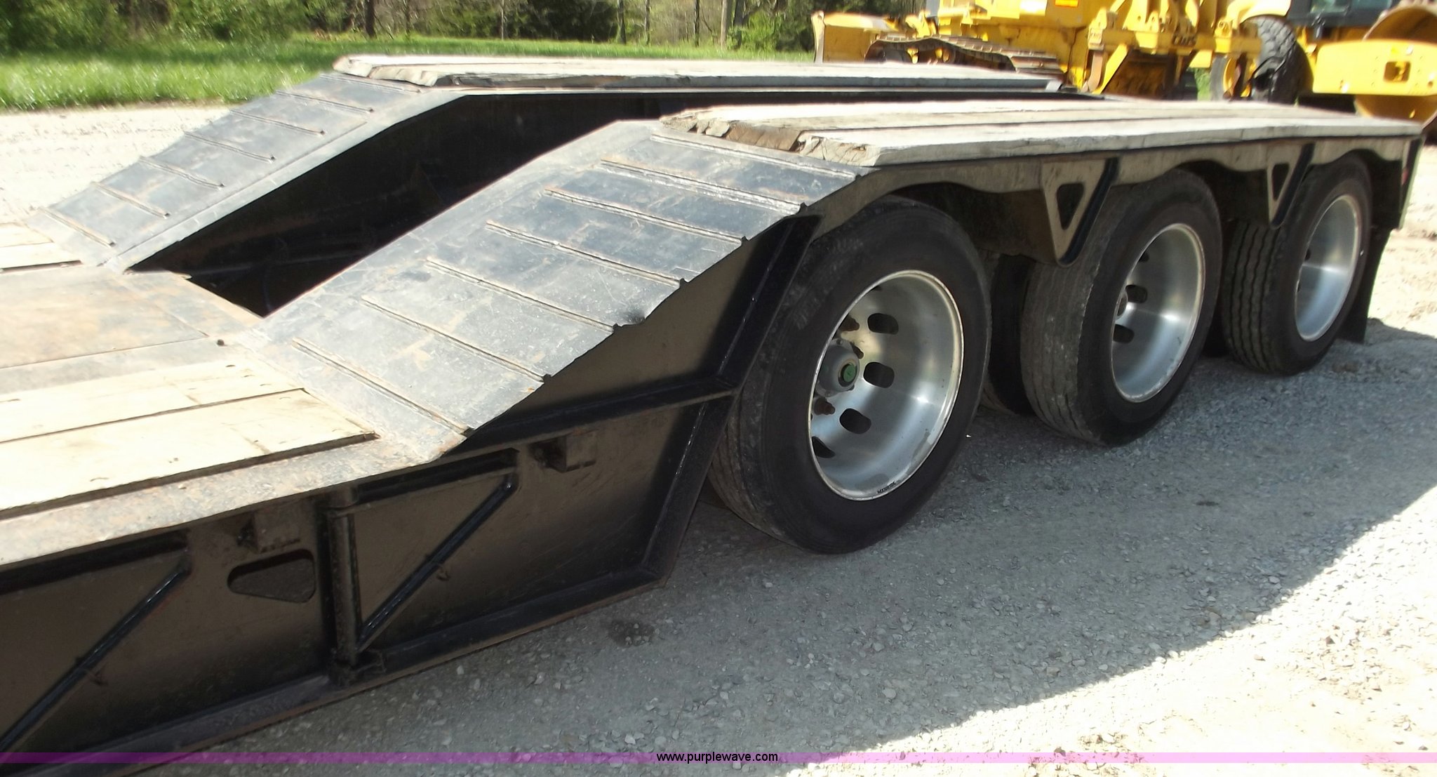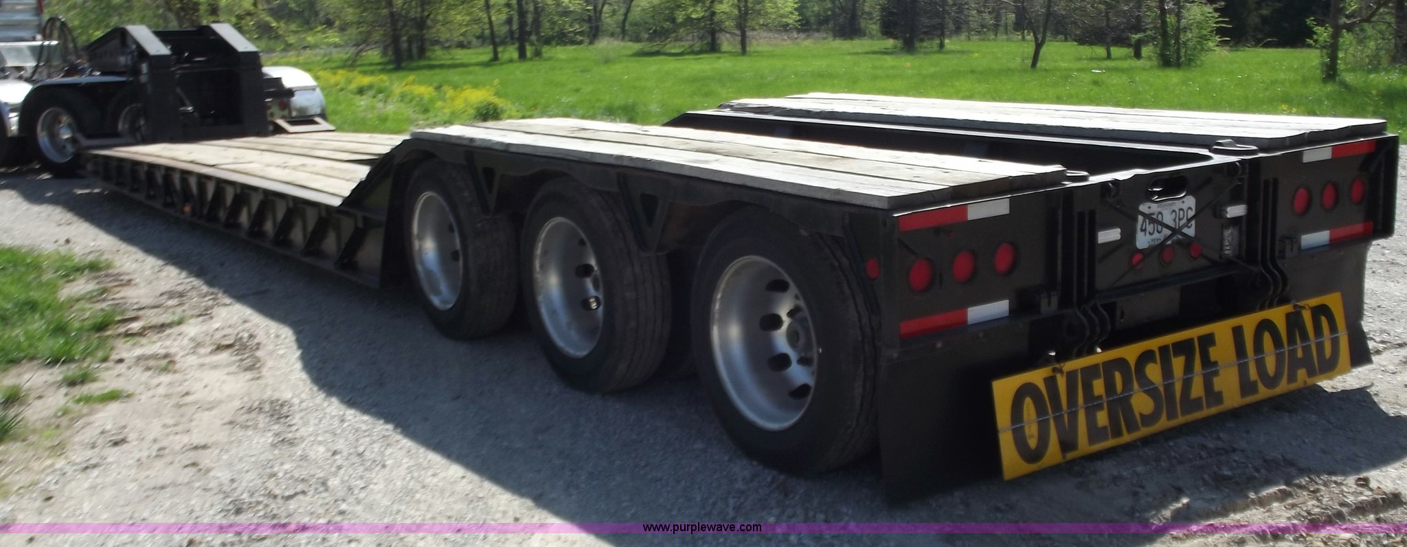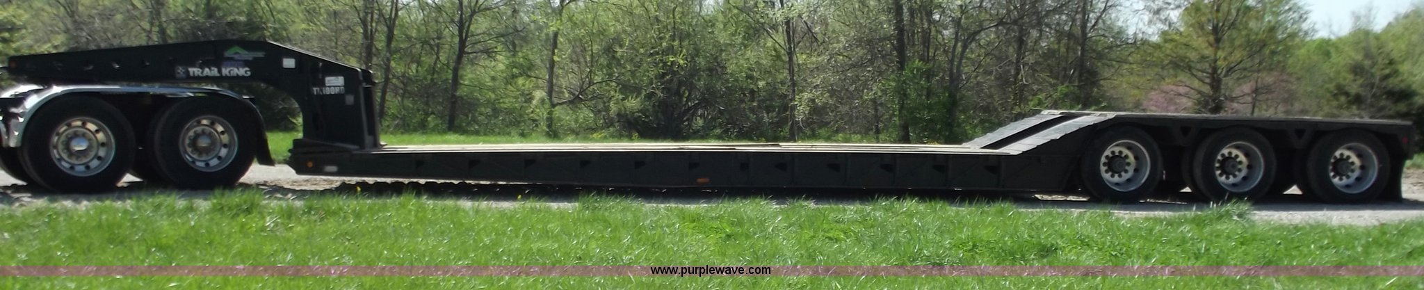 Purple Wave is selling a used Equip. Trailer in Missouri. This item is a 1999 Trail King 50 ton lowboy trailer with the following: Model TK100HDG-533, GVWR 133,320 lbs, GAWR 20,280 lbs, 100,000 lbs concentrated load rating, 40'L, 24' flat deck, 12' top deck above tires, 4' ramp, 24" fold down ramps, 14" to 26" fold out extenders, Air suspension, Air brakes, Aluminum wheels, 225/70R22.5 tires, Oversize load sign on rear, One air bag will need replaced