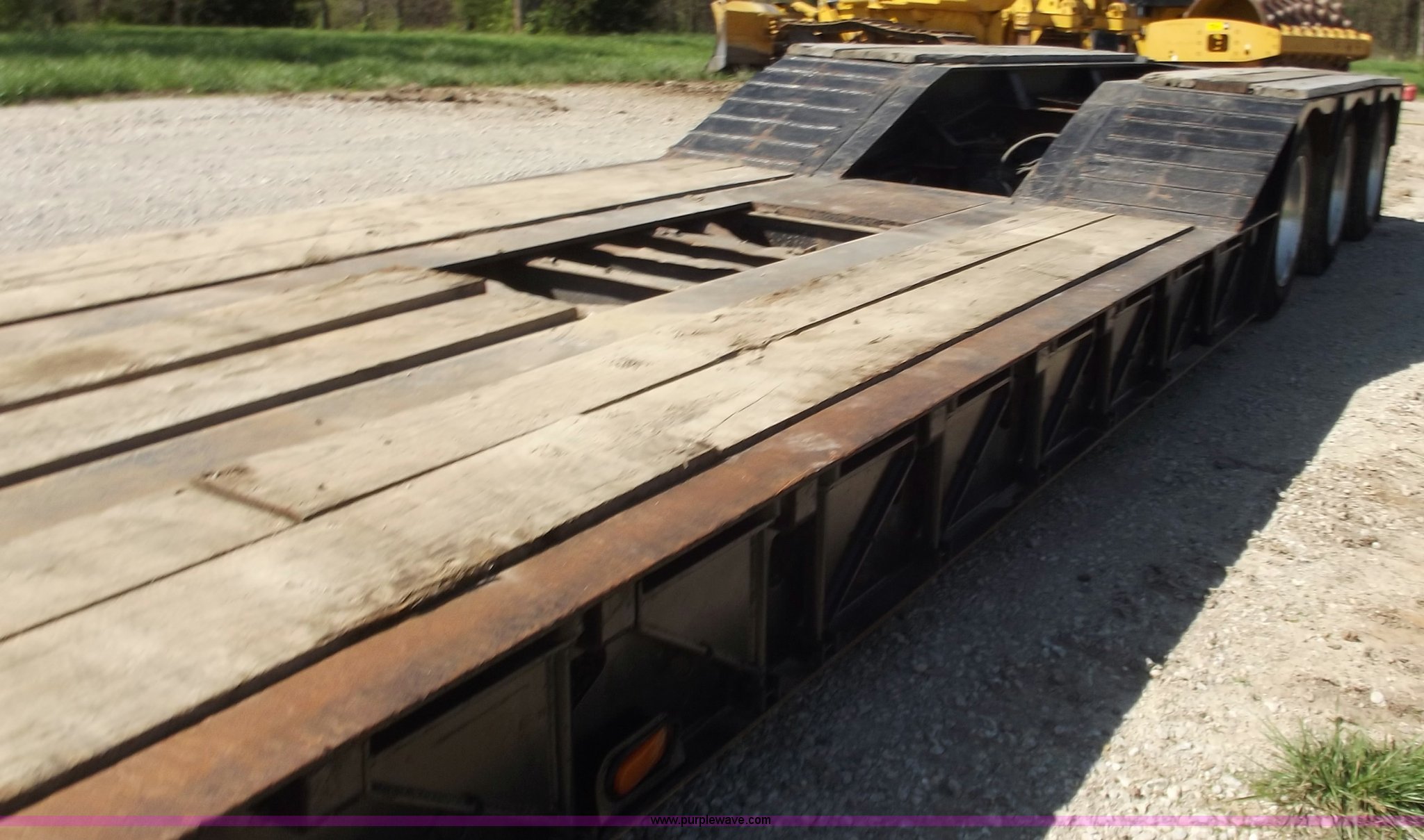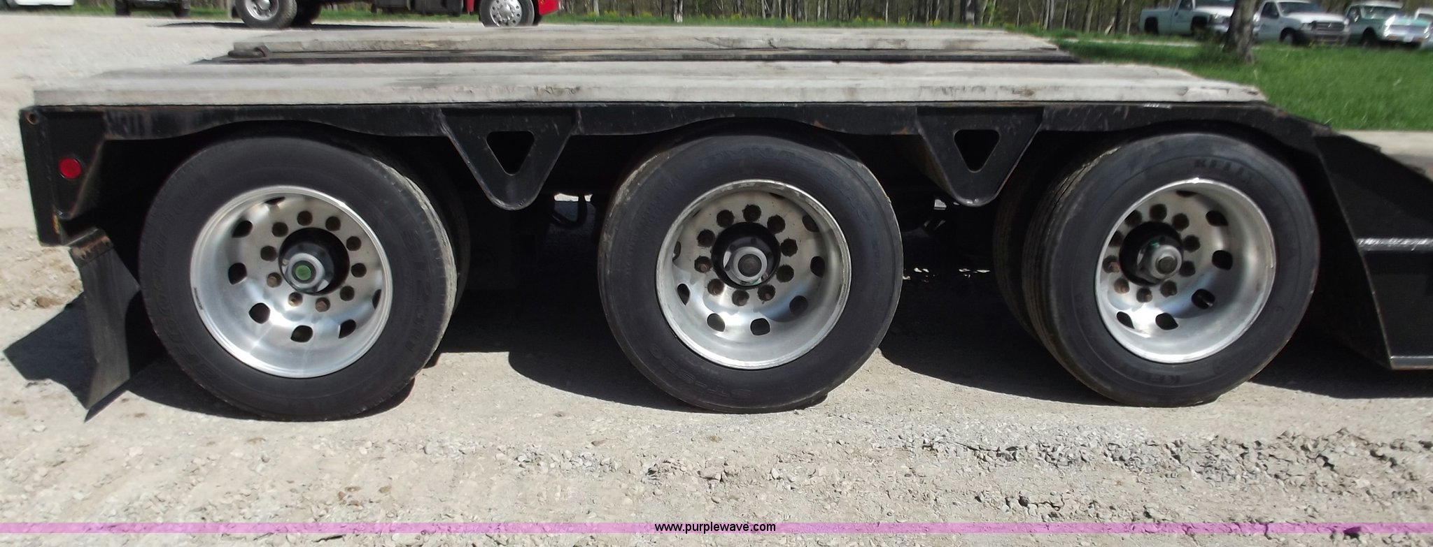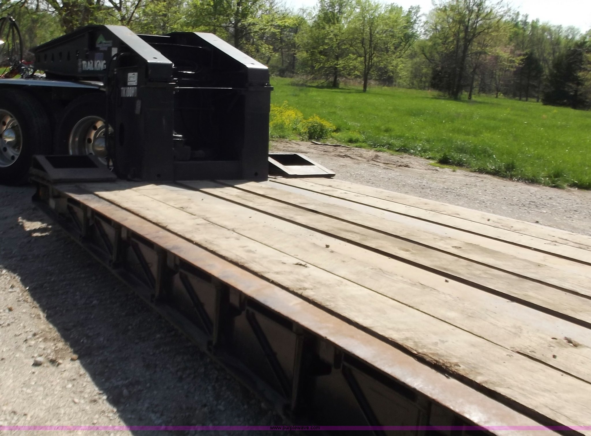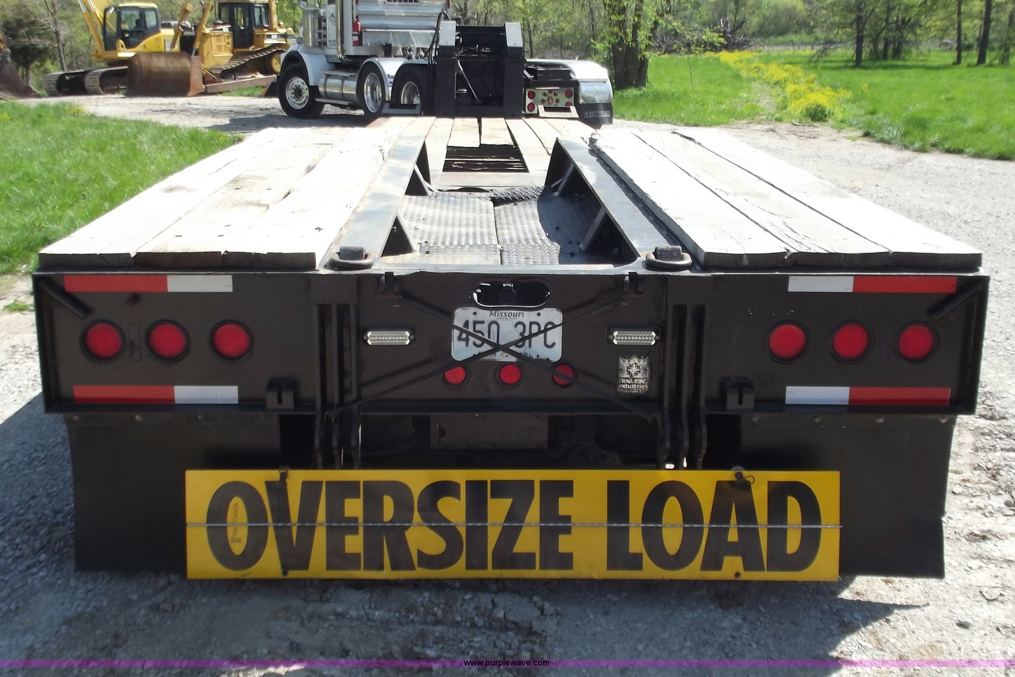 Purple Wave is selling a used Equip. Trailer in Missouri. This item is a 1999 Trail King 50 ton lowboy trailer with the following: Model TK100HDG-533, GVWR 133,320 lbs, GAWR 20,280 lbs, 100,000 lbs concentrated load rating, 40'L, 24' flat deck, 12' top deck above tires, 4' ramp, 24" fold down ramps, 14" to 26" fold out extenders, Air suspension, Air brakes, Aluminum wheels, 225/70R22.5 tires, Oversize load sign on rear, One air bag will need replaced