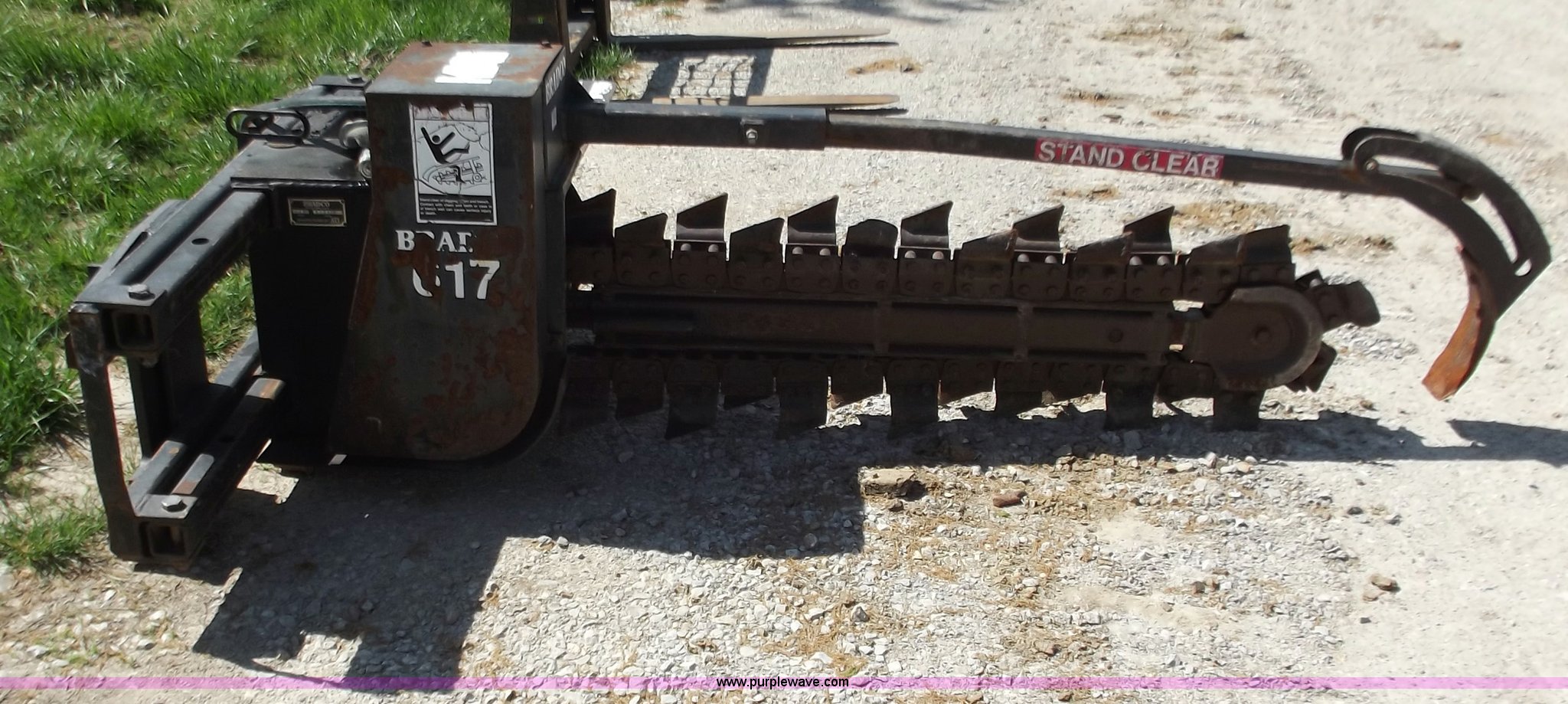 Purple Wave is selling a used Skid Steer Attach. in Missouri. This item is a Bradco 617 trencher skid steer attachment with the following: 54" boom, Approx. 6"W cut with crumber, 24" side auger, Flat face fittings, Serial 6CC404