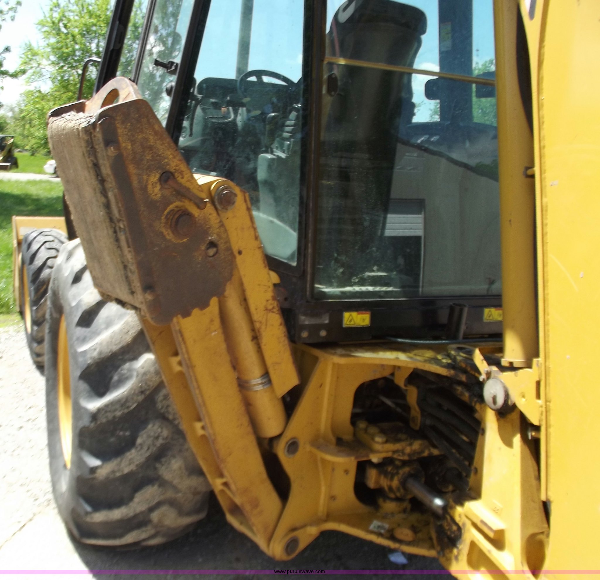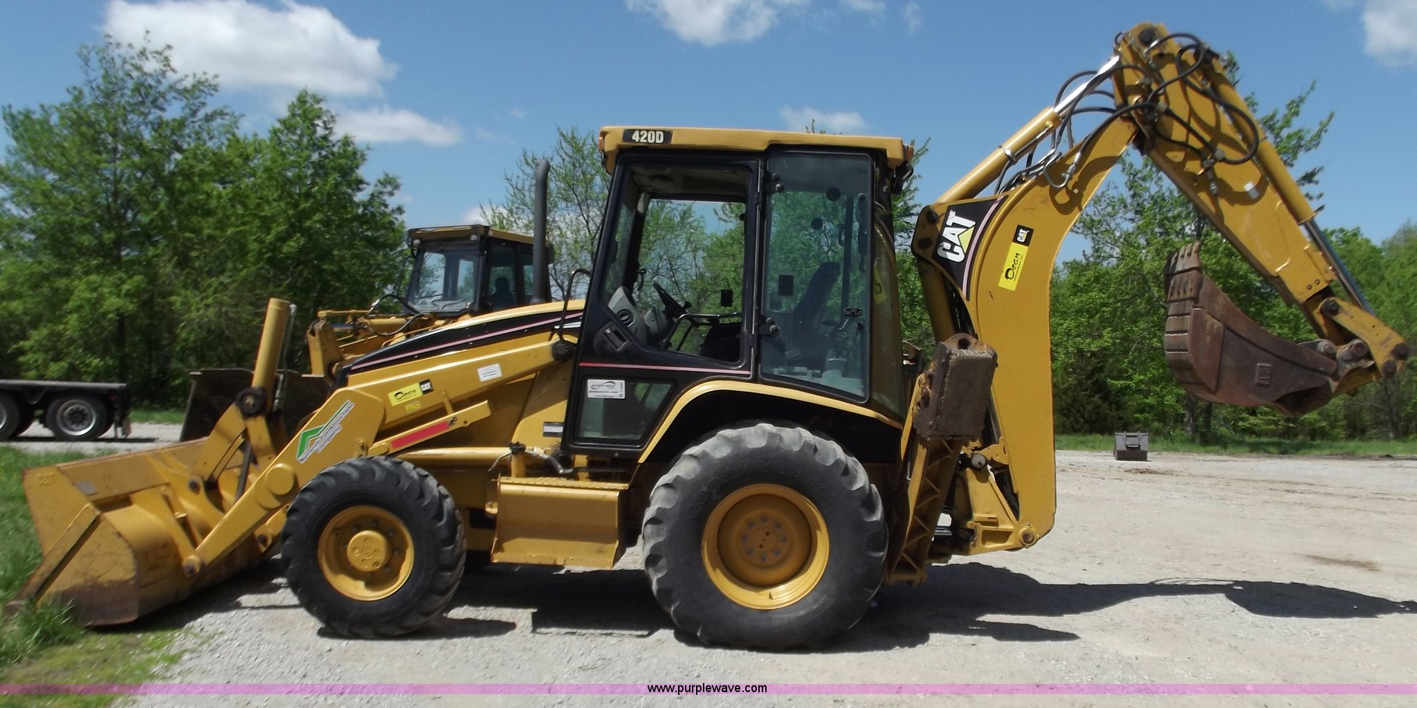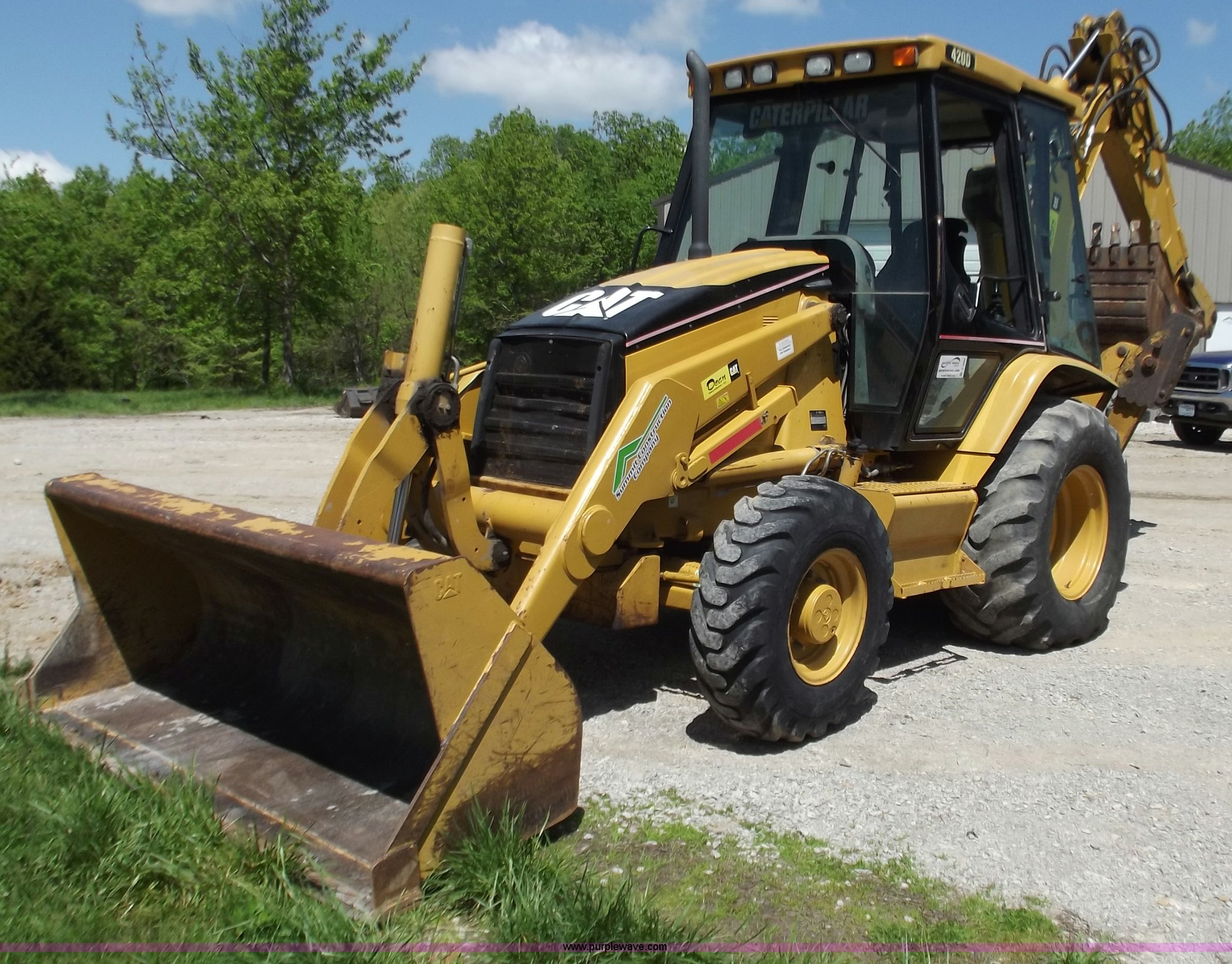 Purple Wave is selling a used Tractor Loader Backhoe in Missouri. This item is a 2005 Caterpillar 420D backhoe with the following: 1,025 hours on meter, Caterpillar 3054T diesel engine, 88 HP, Shuttle shift transmission, 4F-4R gears, Four wheel drive, Cab with AC and heat, Extend-A-Hoe, 88" loader bucket, Bolt-on cutting edge, 24" backhoe bucket, Auxiliary hydraulics, 19.5-L24 rear tires, 12.5/80/18 front tires, 21,605 lbs. base operating weight, Glass in driver side door is out, Will be replaced before sale date, Serial CAT0420DHFDP22081