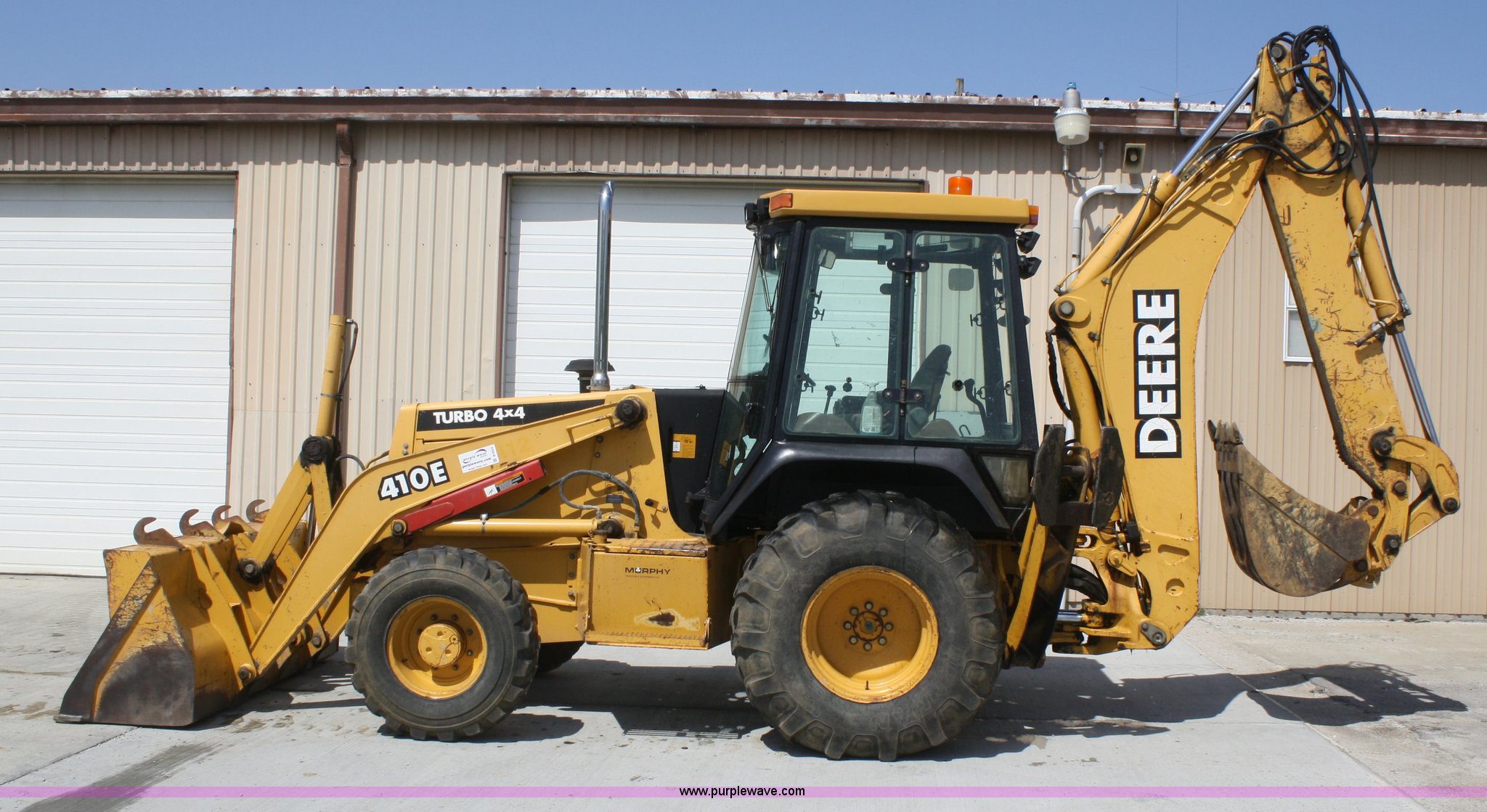 Purple Wave is selling a used Tractor Loader Backhoe in Kansas. This item is a 1998 John Deere 410E backhoe with the following: 8,624 hours on meter, John Deere 4045T four cylinder diesel engine, 98 HP, Four speed manual transmission with power shift reverser, Four wheel drive, Differential lock, Extend-A-Hoe, Outrigger with street shoes, 1.3 cu. yd. bucket, Bolt-on edge, Fork hooks, 24" backhoe bucket, 15' dig depth, Auxiliary hydraulics, Cab with heater, Work lights, Front counter weight, 21L-24 rear tires, 12.5-80-18 front tires, 16,500 lbs. base operating weight, Serial 846877