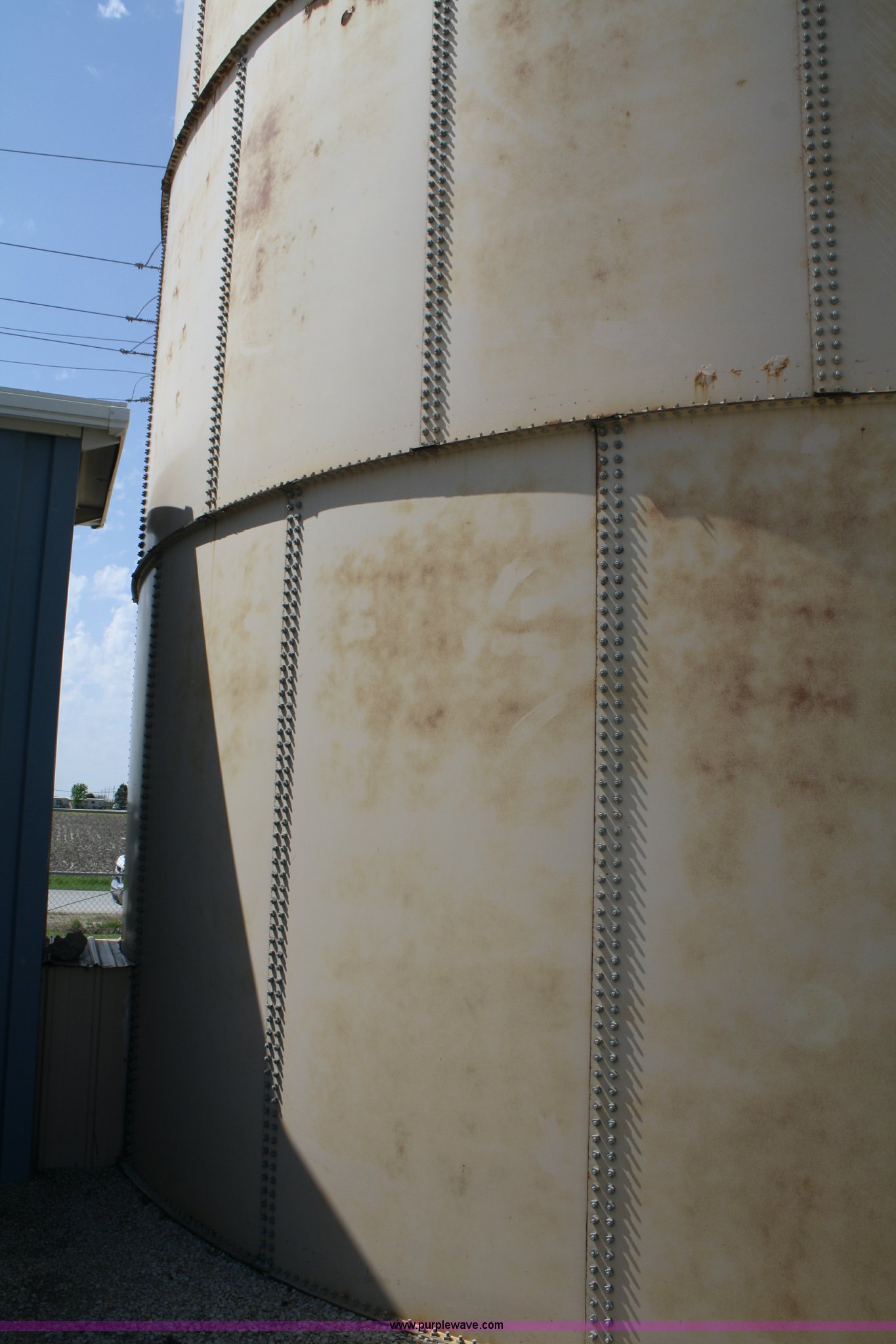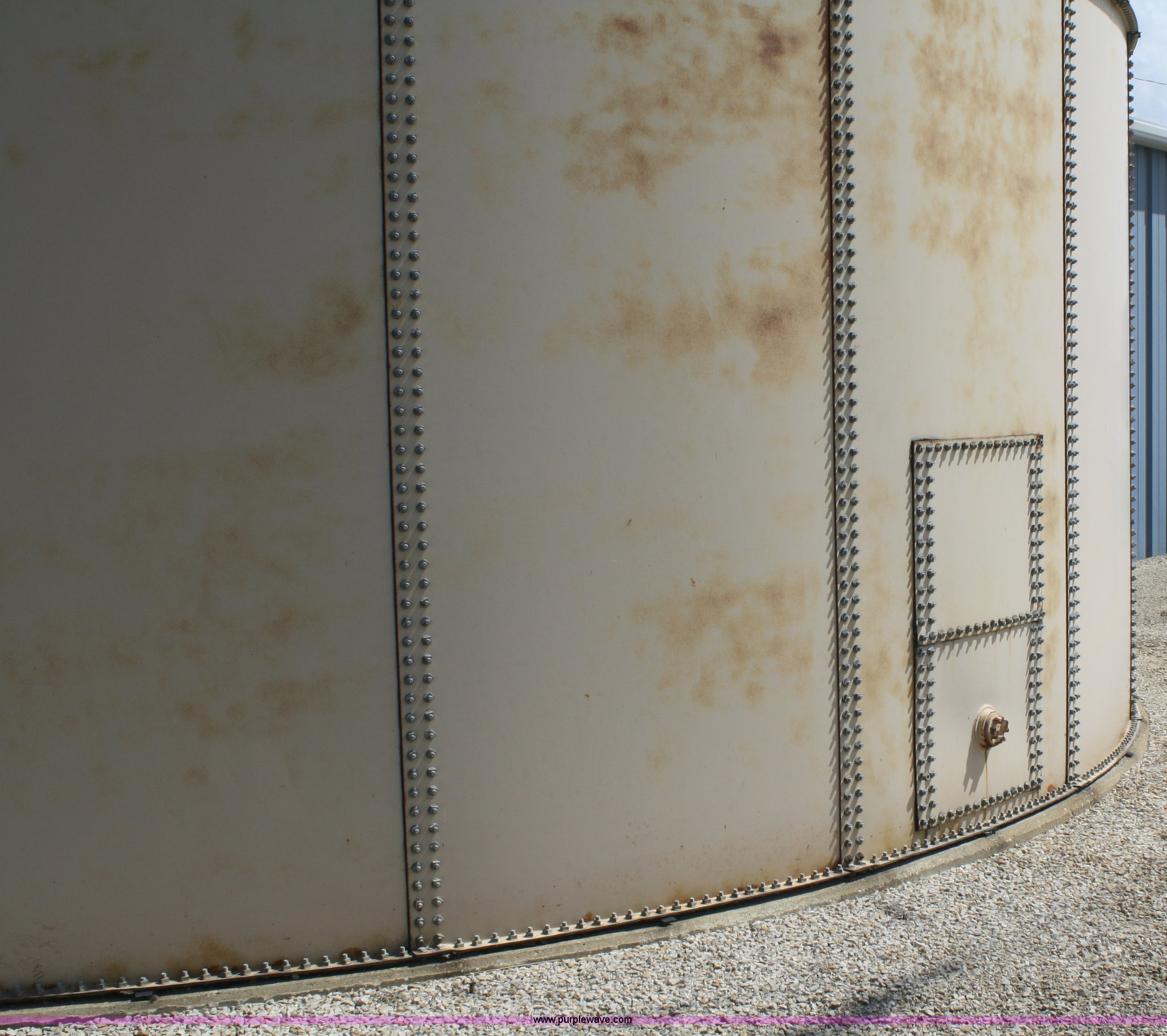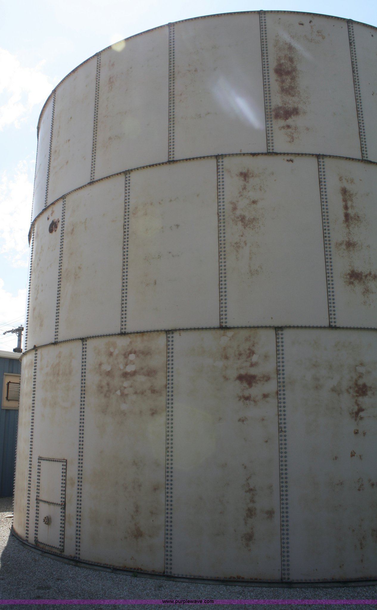 Purple Wave is selling a used Tanks in Kansas. This item is a 100,000 gallon water tank with the following: 26'H x 30' diameter, All lines are unhooked, Buyer responsible for all aspects of loadout and removal