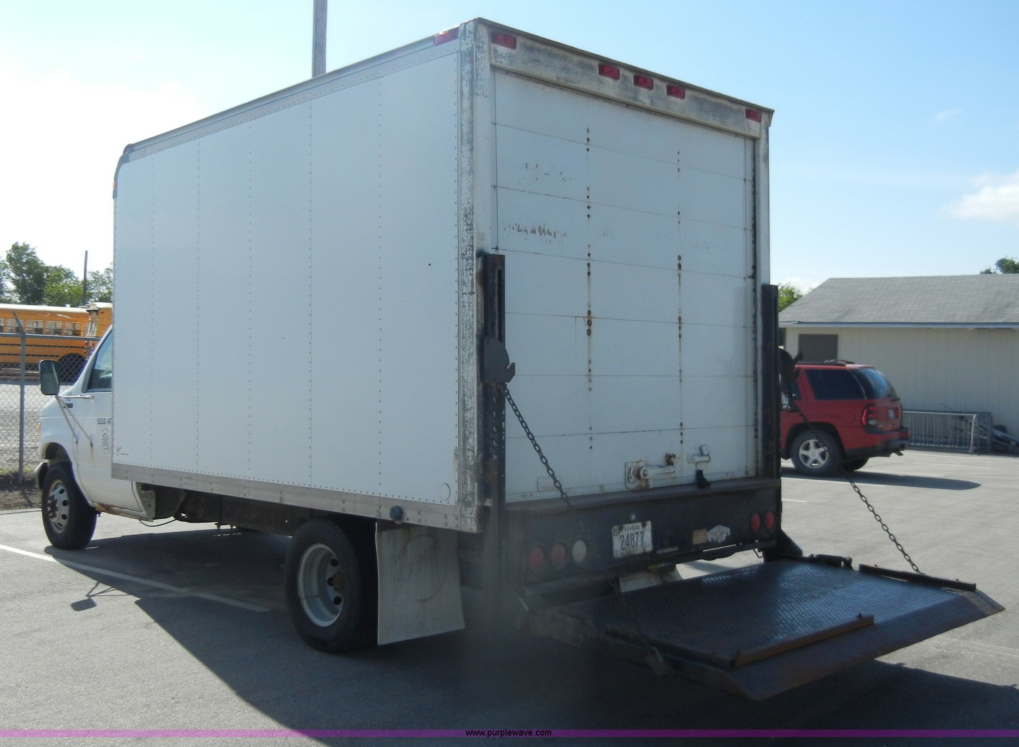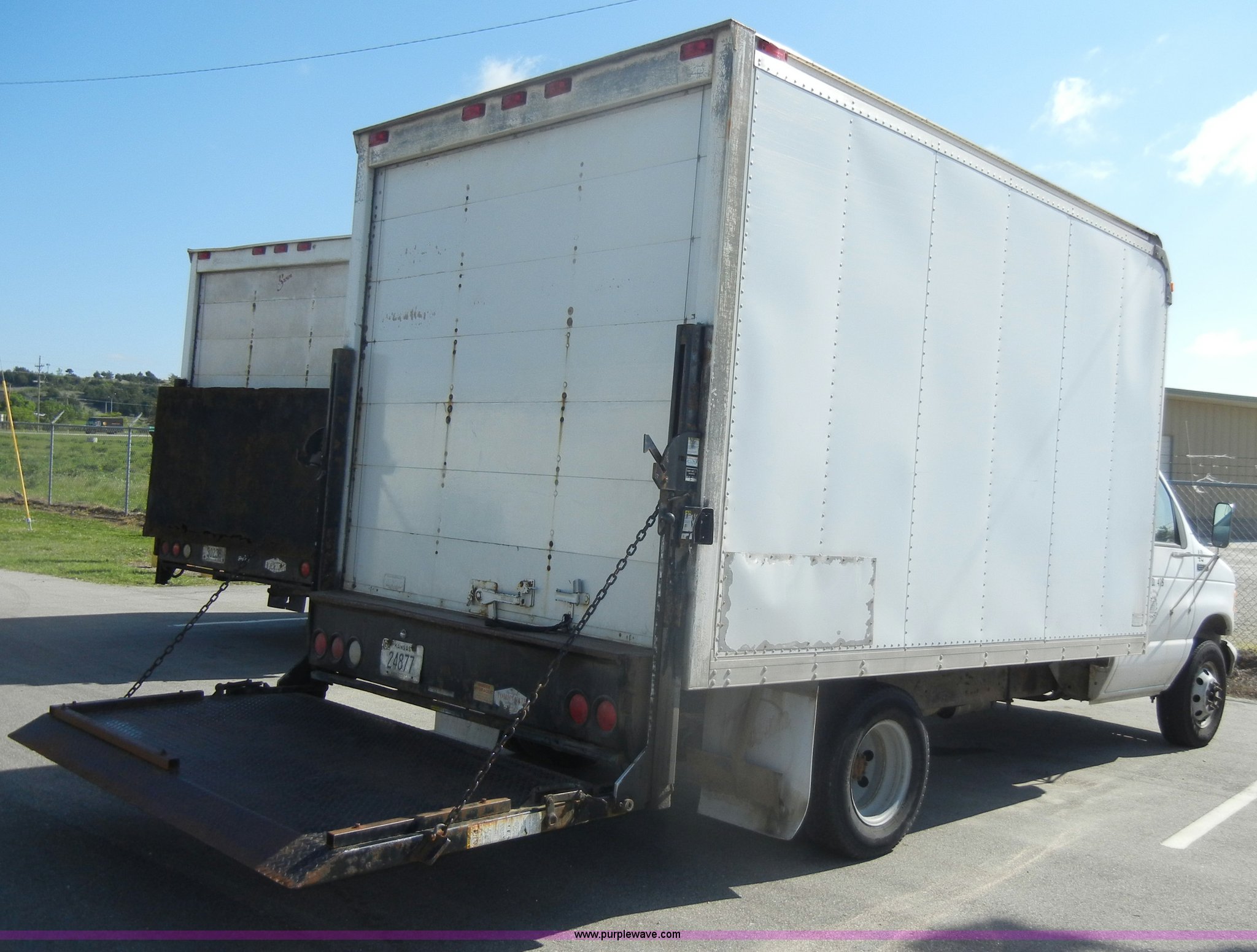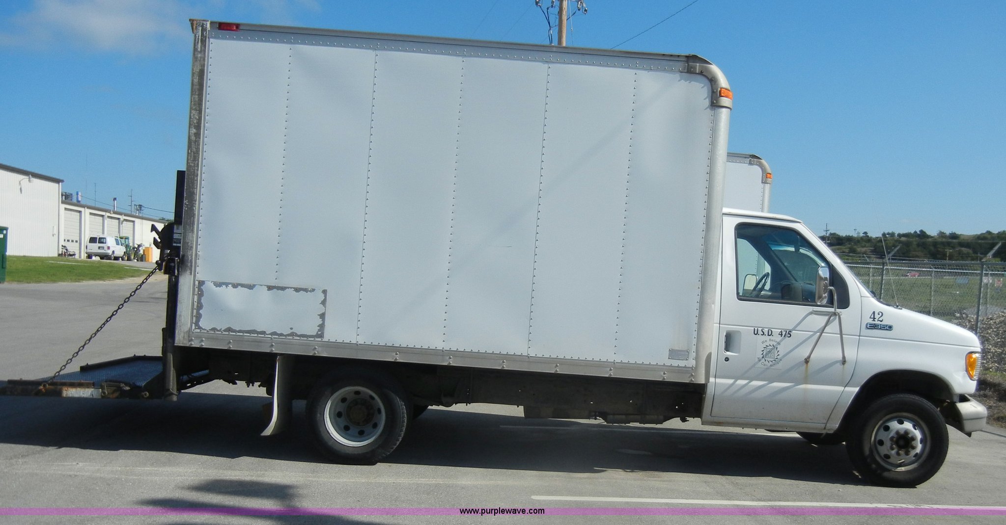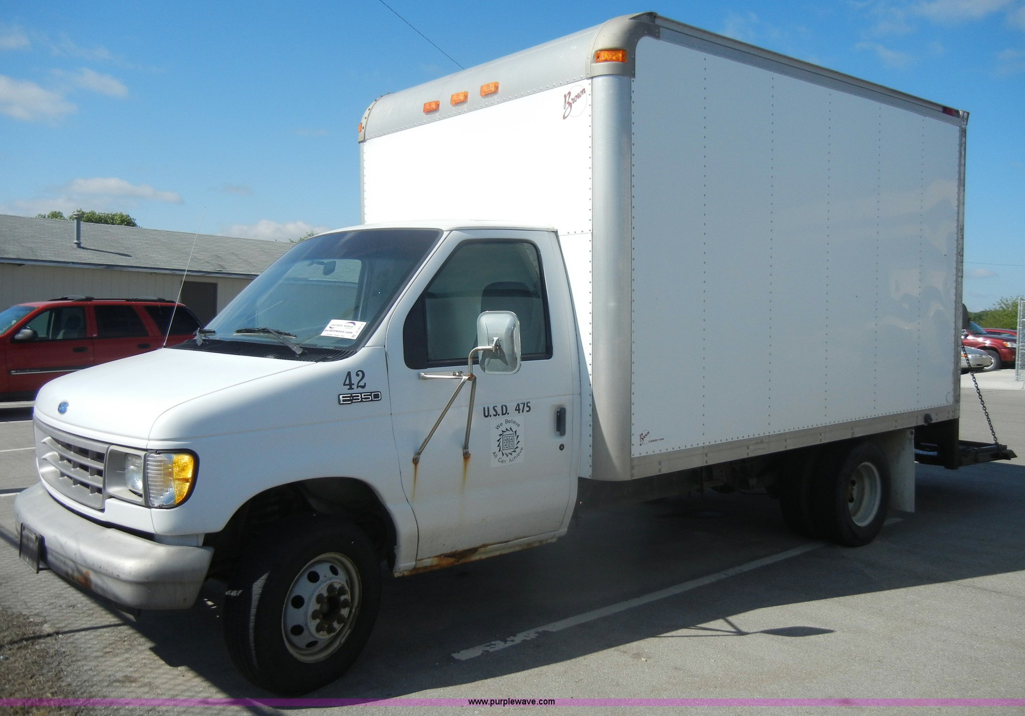 Purple Wave is selling a used Box Truck in Kansas. This item is a 1995 Ford E350 cargo van with lift gate with the following: 110,226 miles on odometer, 5.8L V8 EFI gas engine, Automatic transmission, AC and heat, AM/FM, Manual windows and locks, Vinyl interior, Brown cargo box, 151" x 8', Model 916SA1285, Serial P842495, Tommy Gate 895 lift, Serial M16-16542R, Bottom side rusted, Wood flooring, Roll up rear door, Straps not included, 225/75R16 tires, GVWR 10,700 lbs, Interior/exterior cosmetic damage, Interior door handles damaged, Body rust, ID# 42