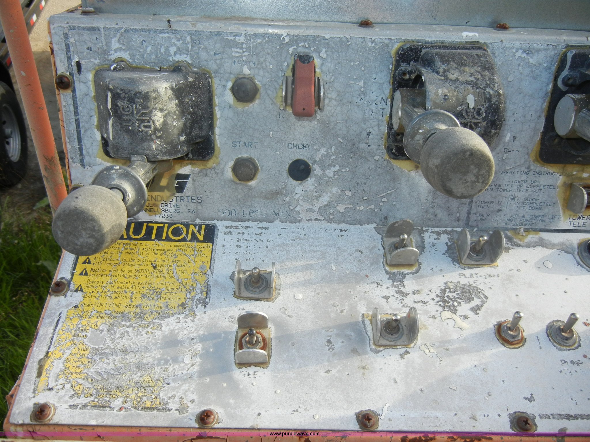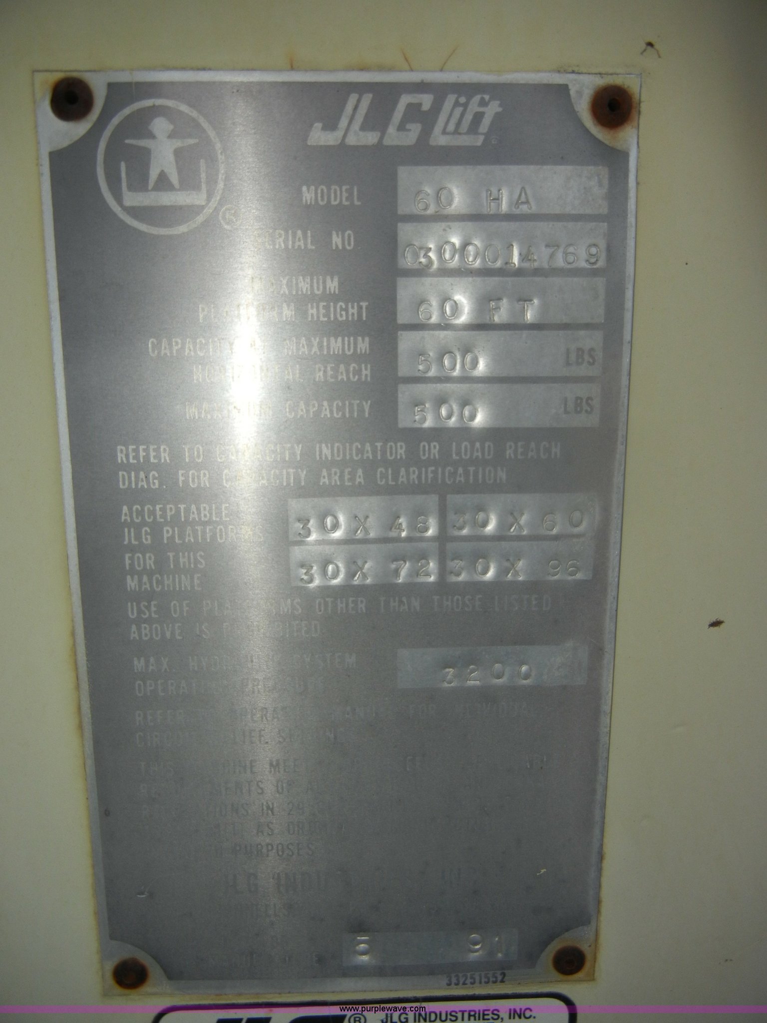 Purple Wave is selling a used Boom Lift in Kansas. This item is a 1991 JLG 60HA TopGun self propelled boom lift with the following: Gas engine, 60' max platform height, 500lb max platform capacity, 30"x60" Platform, Platform controls, 3200psi max hydraulic operating pressure, 14-17.5 tires, Inoperable items or items that may require replacement, Safety decals, Hydraulic filter, Hour meter, Leveling sensor, Hydraulic tank gasket, Horn, Storage box, Auxiliary power motor, Repacking of steering cylinder, Muffler, Hydraulic hoses that run from platform to boom, Electrical cords that run the length of the boom, Serial 0300014769