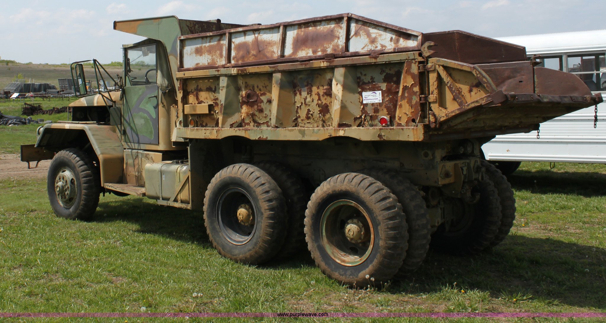 Purple Wave is selling a used Construction Dump Truck in Kansas. This item is a 1968 Kaiser 6x6 military dump truck with the following: 36,423 miles on odometer, 2,117 hours on meter, Six cylinder multi fuel engine, Five speed manual transmission, Six wheel drive, 20,000 lbs max payload capacity, 110 gallon fuel tank, 11.00R20 tires, Front mounted winch, Manual end gate release, Rear air trailer hookups, Pintle hitch, Smokes, Has no power, Canvas top ripped