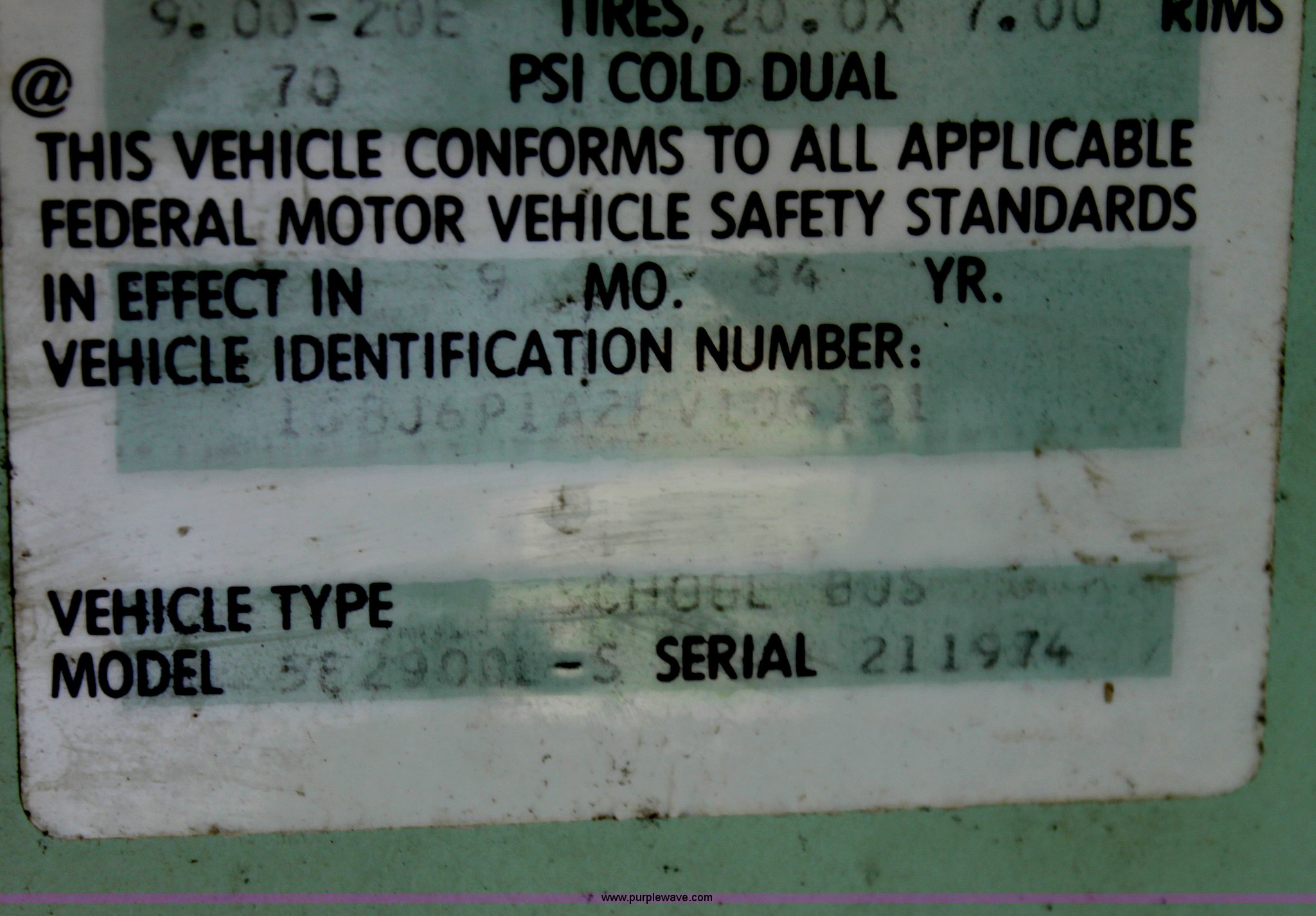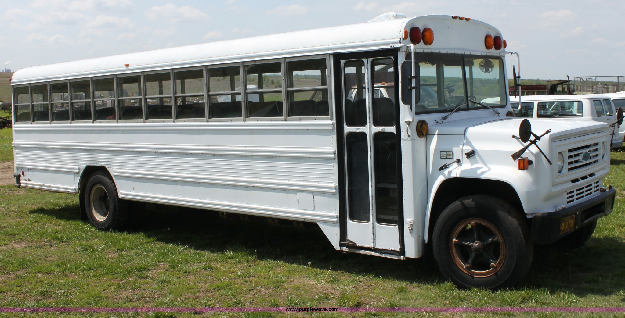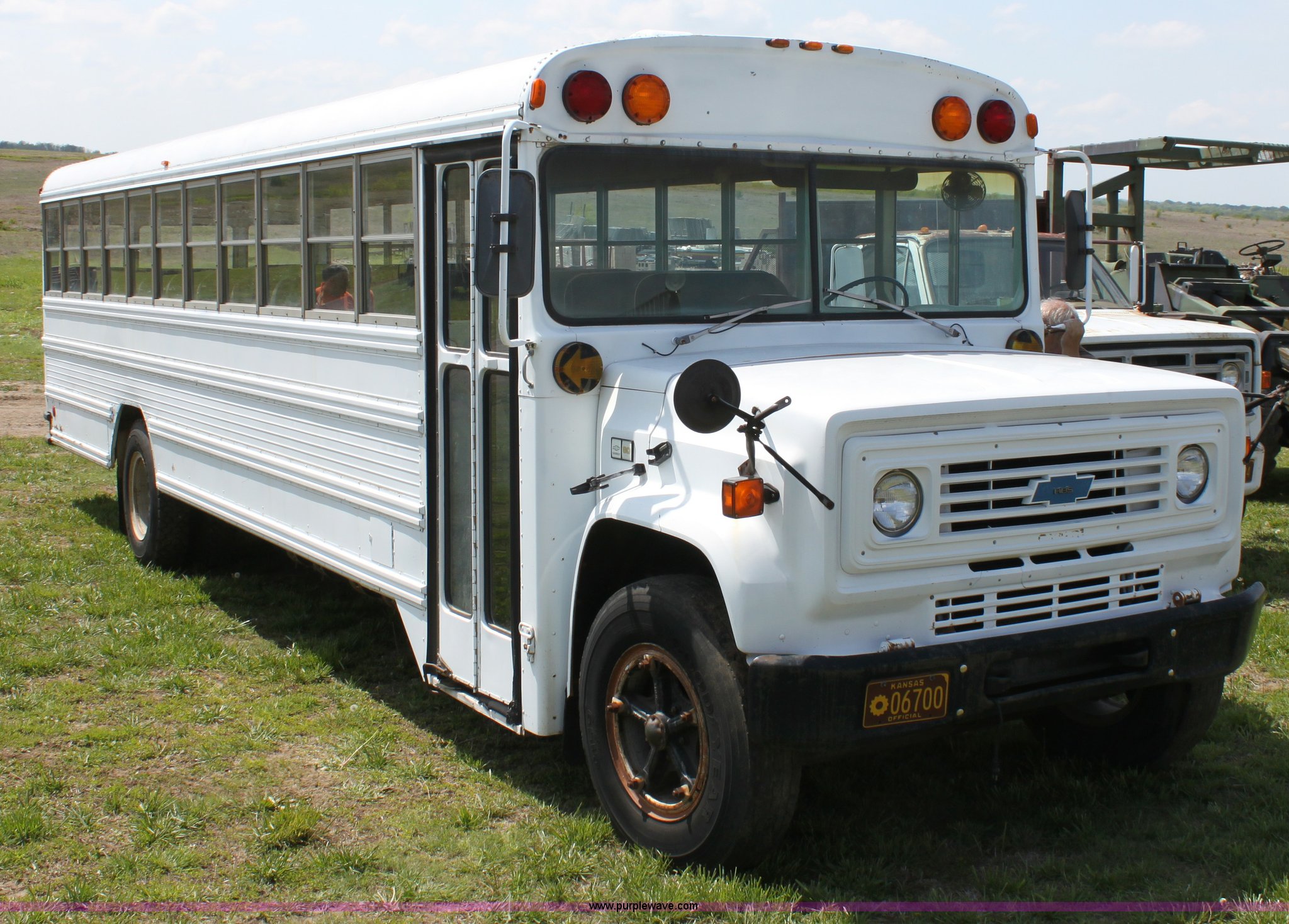 Purple Wave is selling a used Bus in Kansas. This item is a 1985 GM school bus with the following: 9,937 miles on odometer, Not actual mileage, 53 passenger, 350 V8 gas engine, Five speed manual transmission, Heater, 9.00R20 tires, GVWR 23,660 lbs, Interior/exterior cosmetic damage