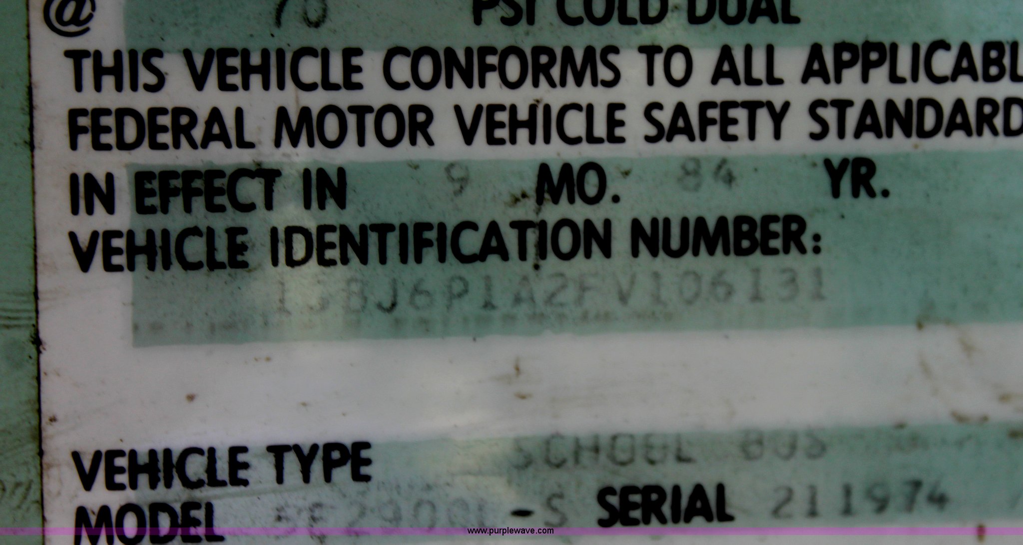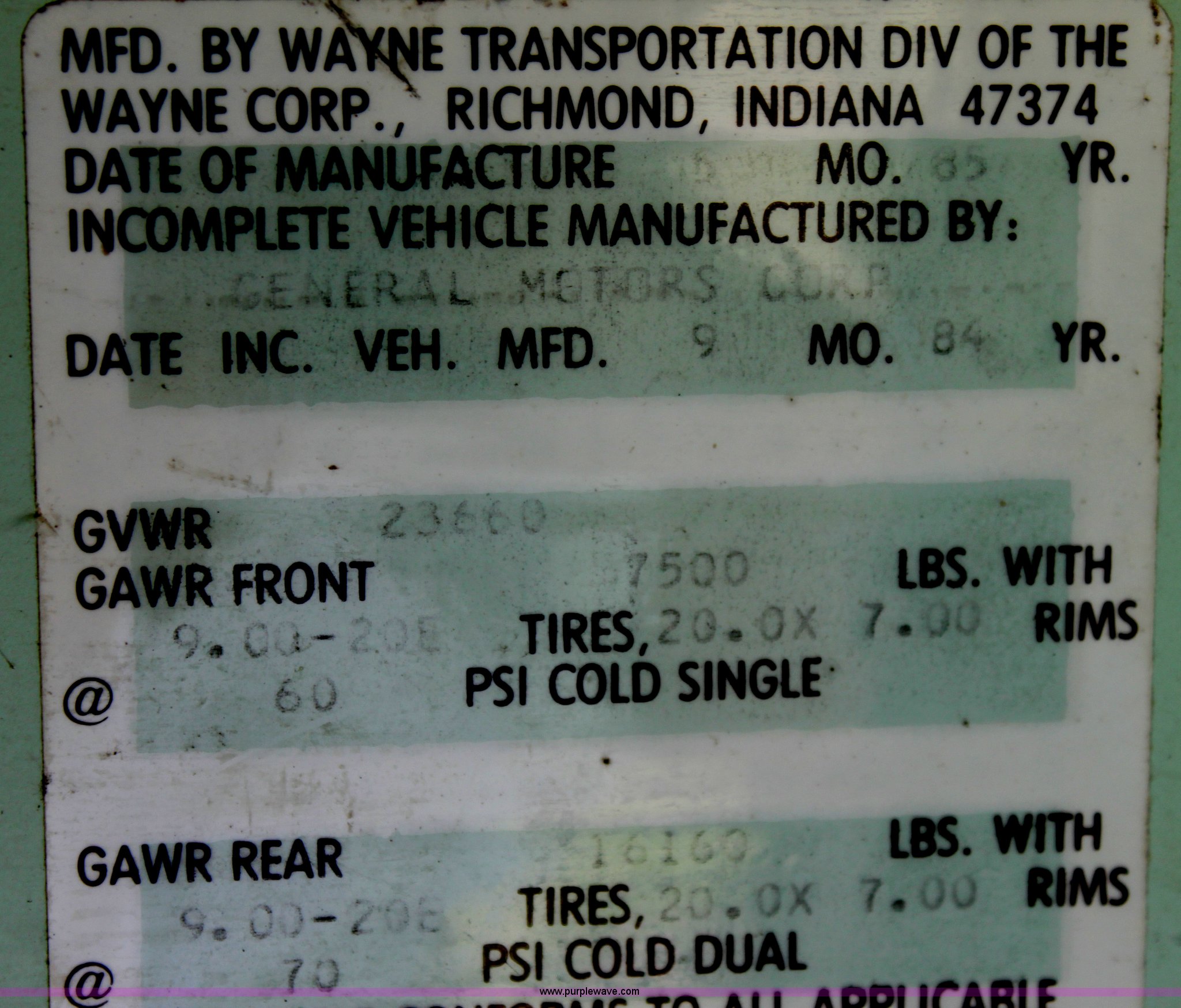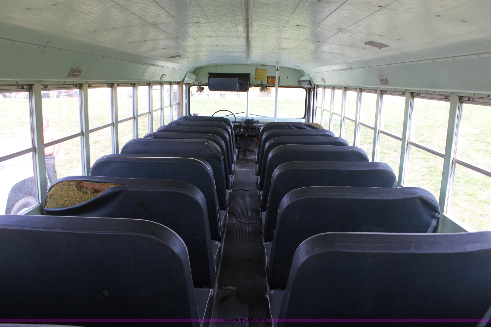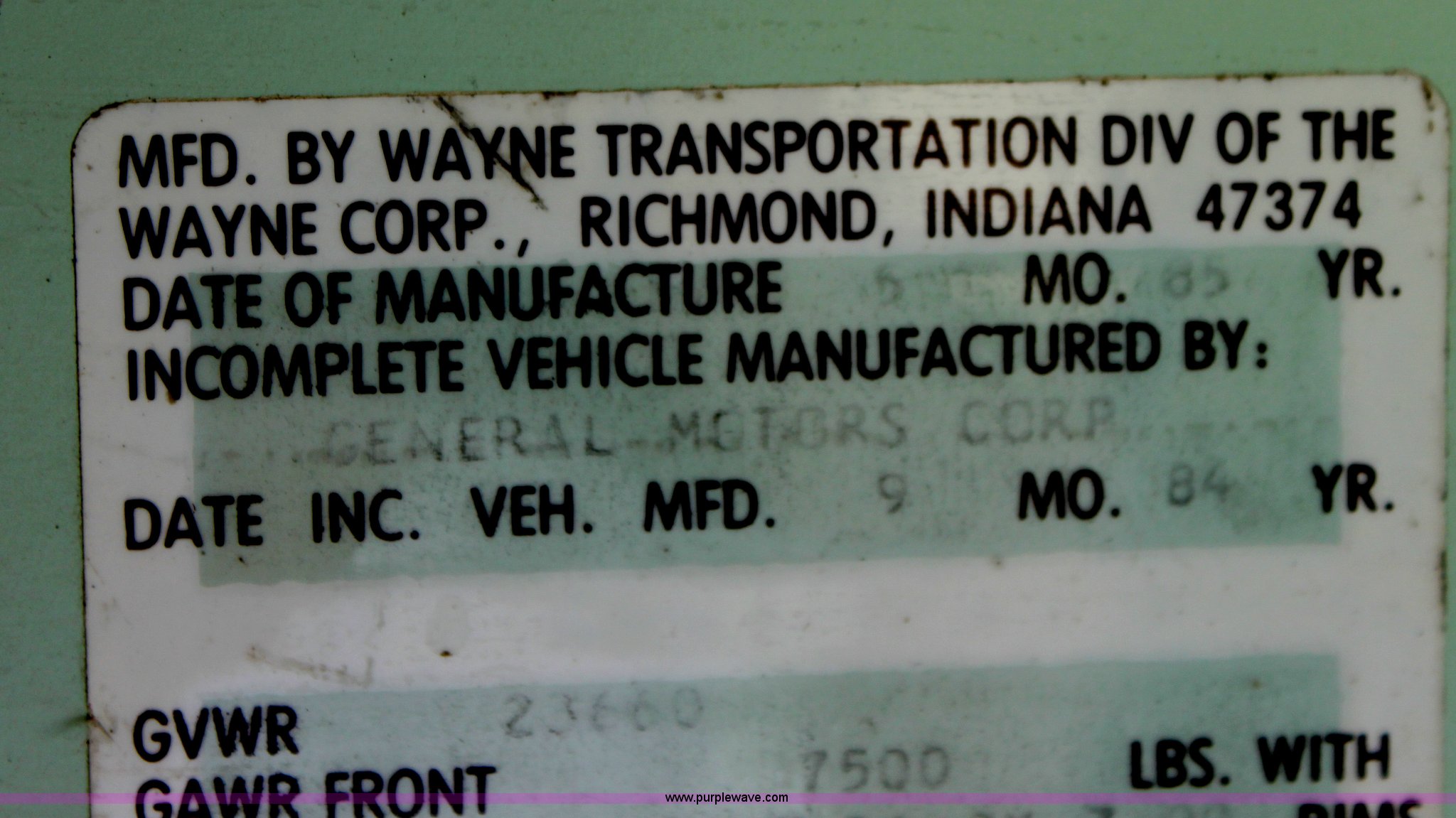Purple Wave is selling a used Bus in Kansas. This item is a 1985 GM school bus with the following: 9,937 miles on odometer, Not actual mileage, 53 passenger, 350 V8 gas engine, Five speed manual transmission, Heater, 9.00R20 tires, GVWR 23,660 lbs, Interior/exterior cosmetic damage