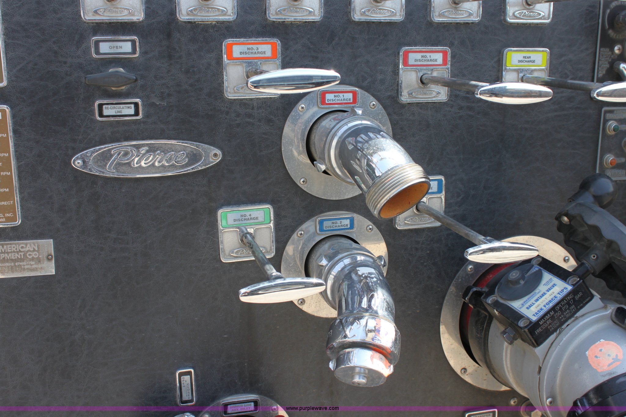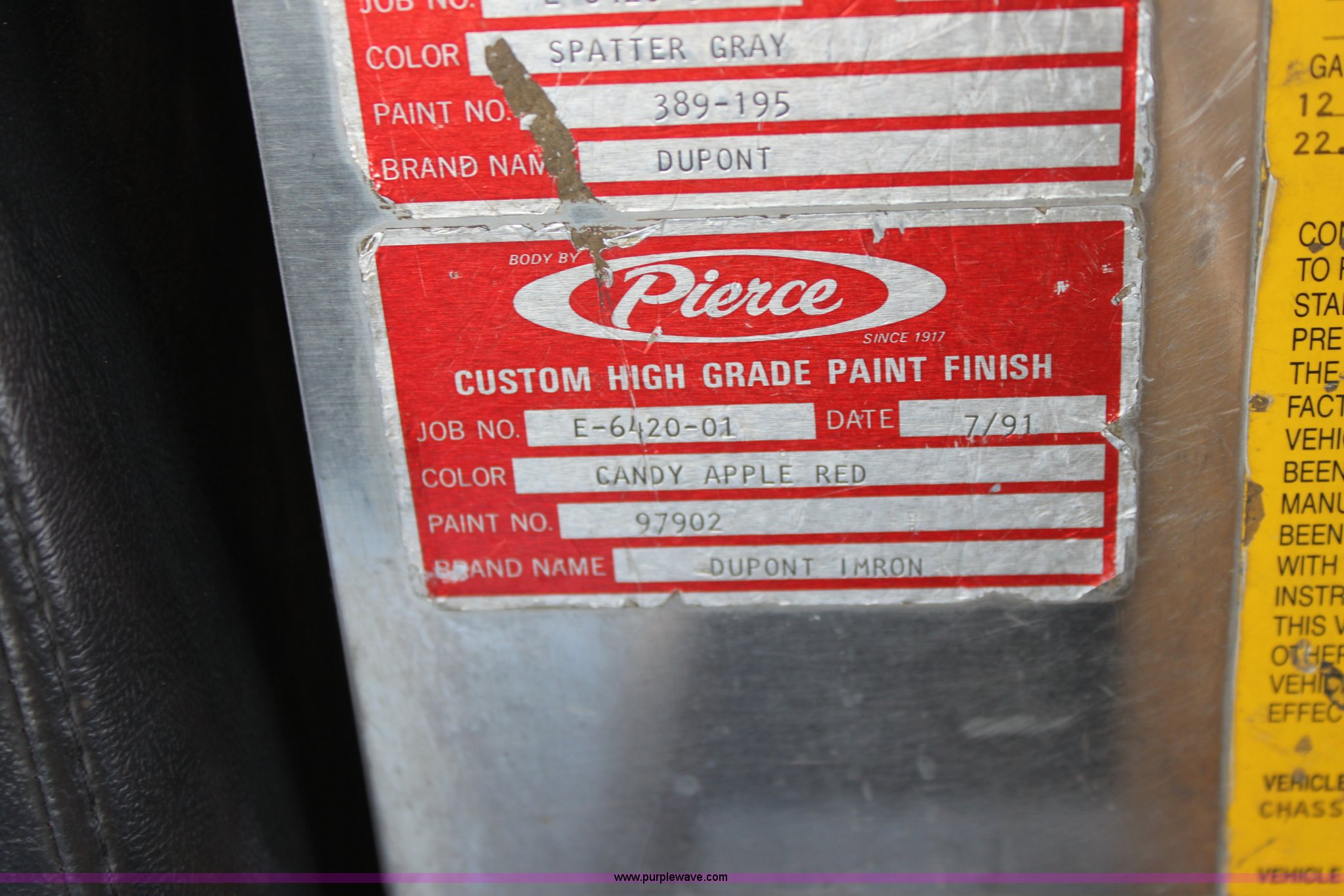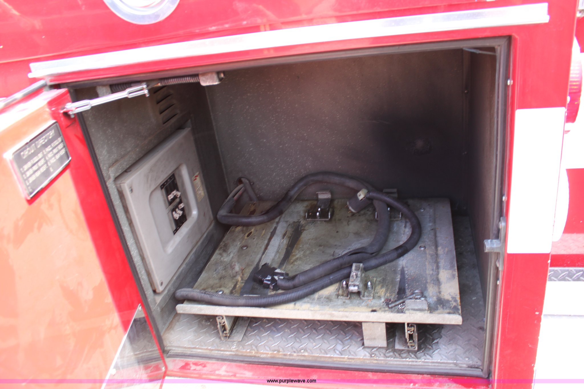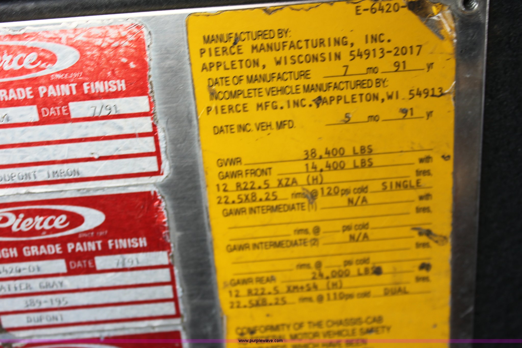 Purple Wave is selling a used Fire Truck or Emergency Vehicle in Kansas. This item is a 1991 Pierce Tilt Cab Fire Engine with the following: 119,278 miles on odometer, Caterpillar 3208 V8 10.4L diesel engine, Automatic transmission, Federal signal and siren controls, Heat, Manual windows and locks, 500 gallon water tank capacity, 883 pump hours on meter, Waterous 1250 gpm pump, 110 and 120 volt external AC outlets, (2) electric rewind hose reels, 1" hose, Rear discharge, Scaling ladder
