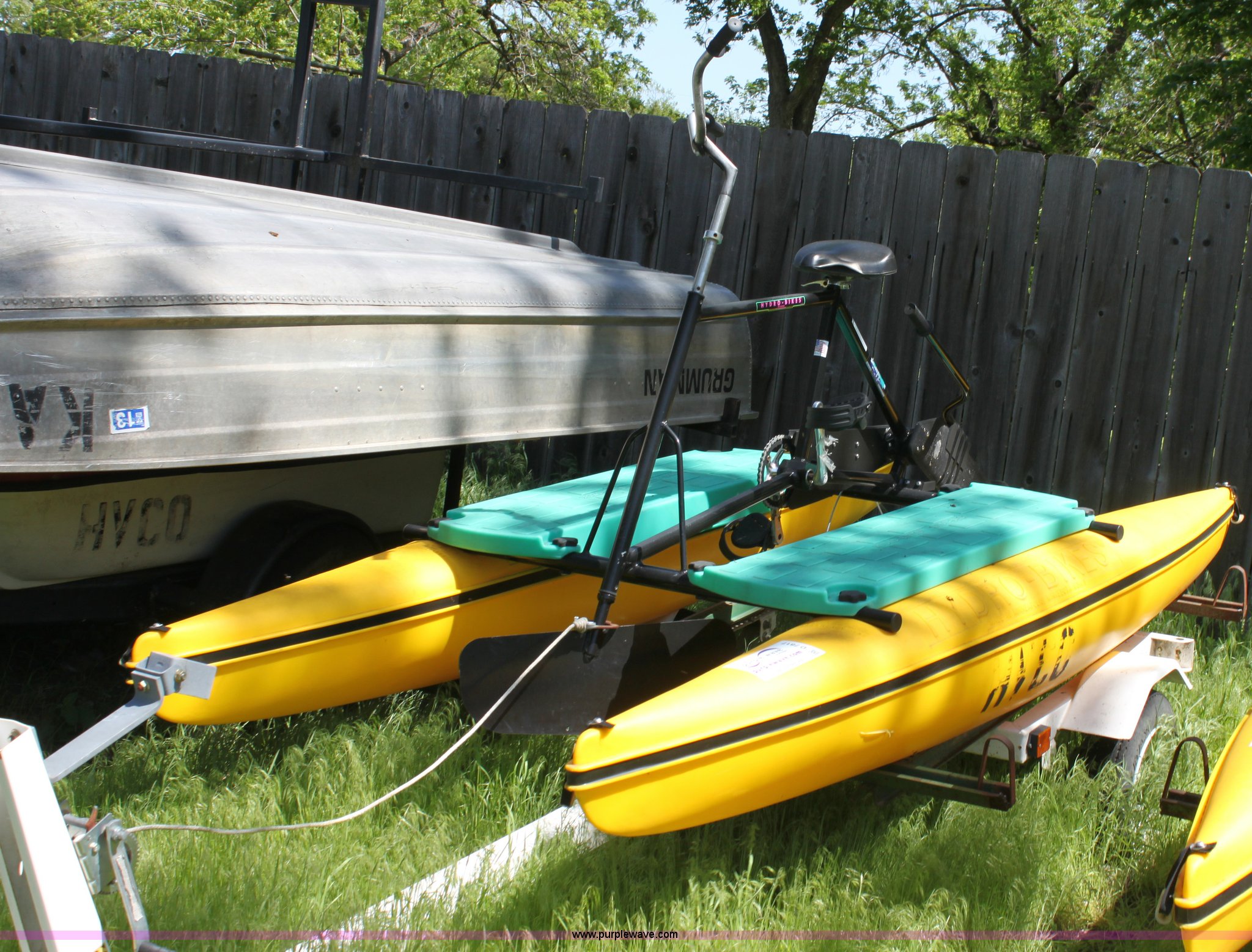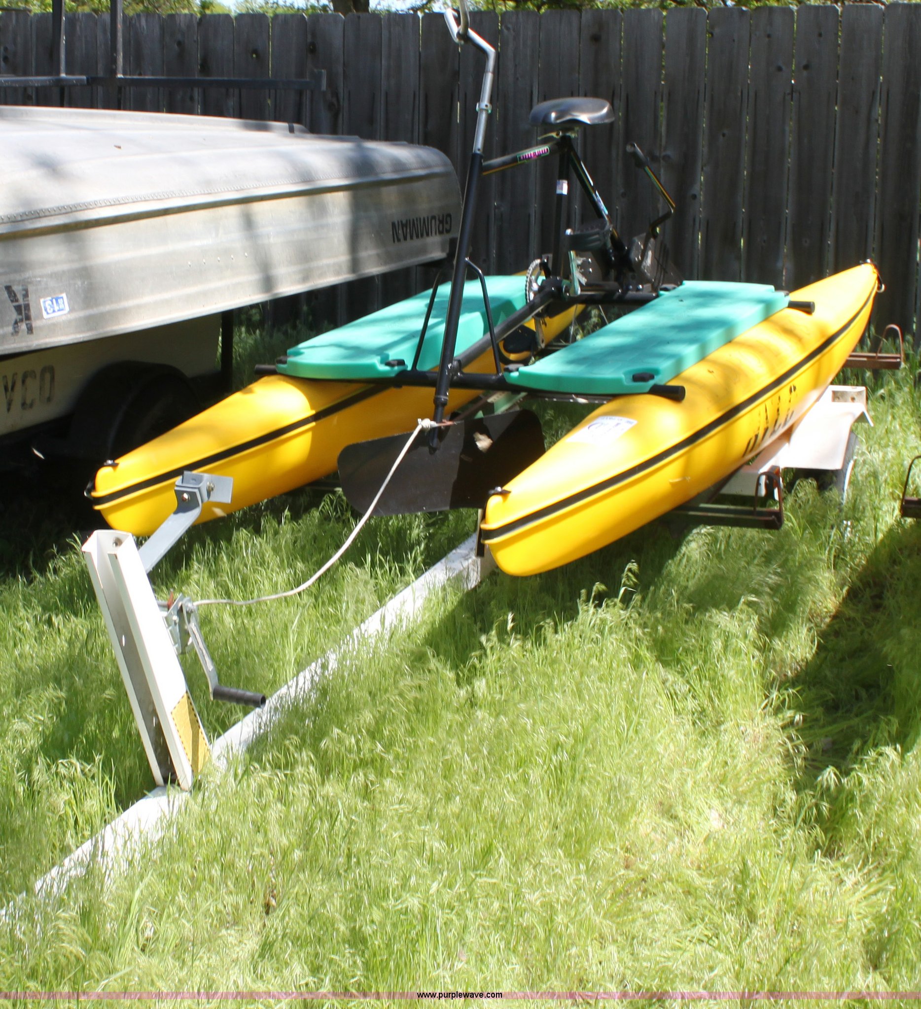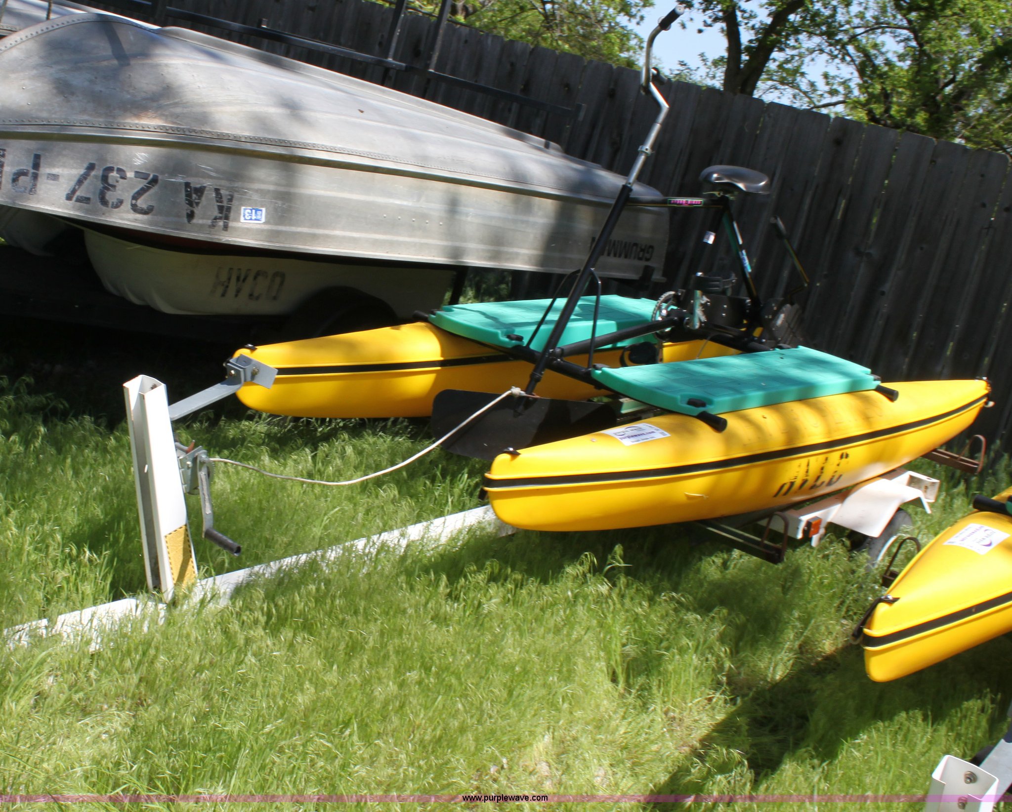 Purple Wave is selling a used Boat in Kansas. This item is a Hydro bikes paddle boat with the following: 116"L x 48"W, Single axle trailer, 2" receiver hitch, Four pin trailer wiring, 4.80-12 tires