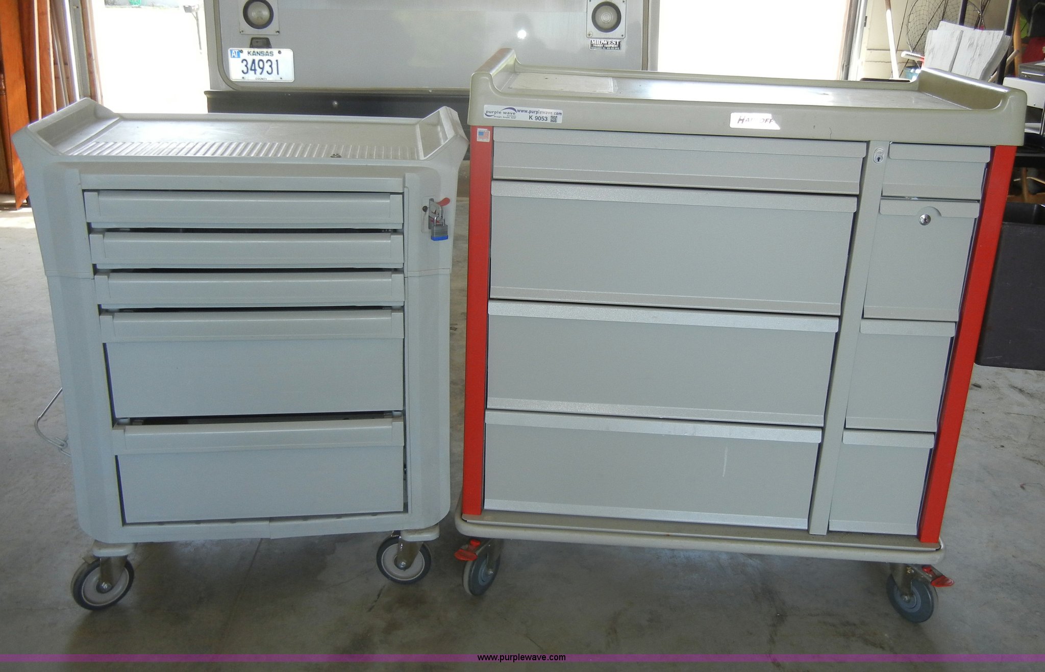Purple Wave is selling a used Medical Equip. in Kansas. This item is a (2) assorted medical carts with the following: Five-drawer, Eight-drawer, Keys included