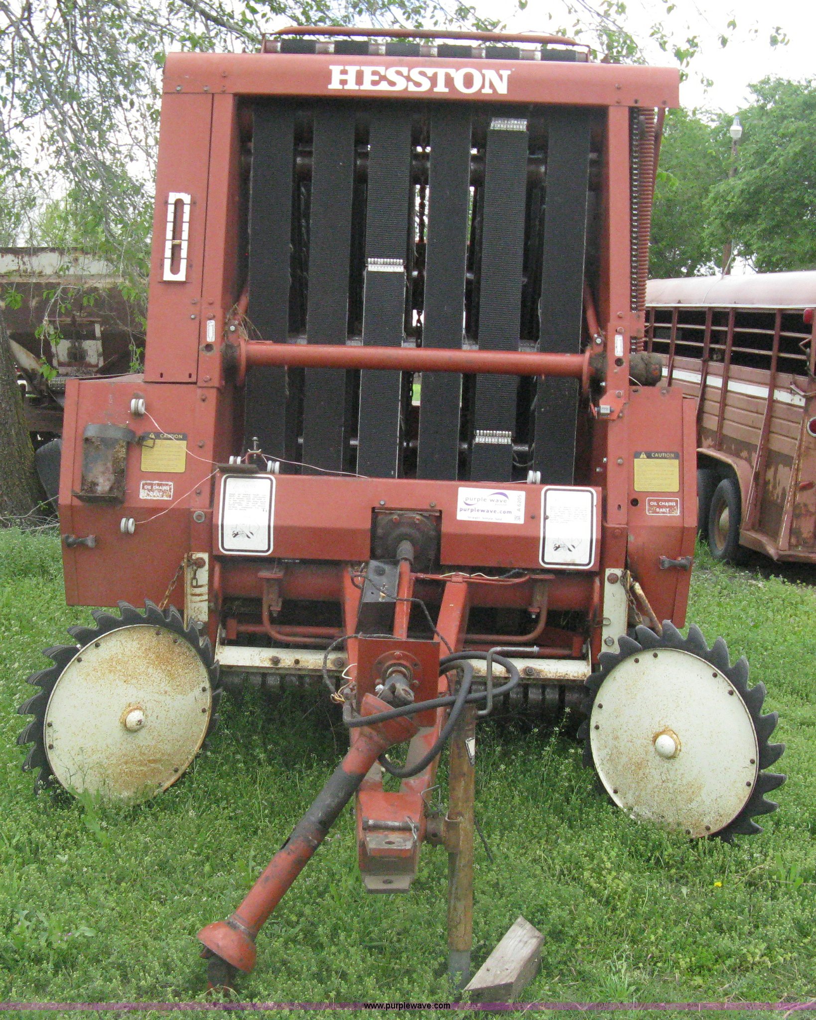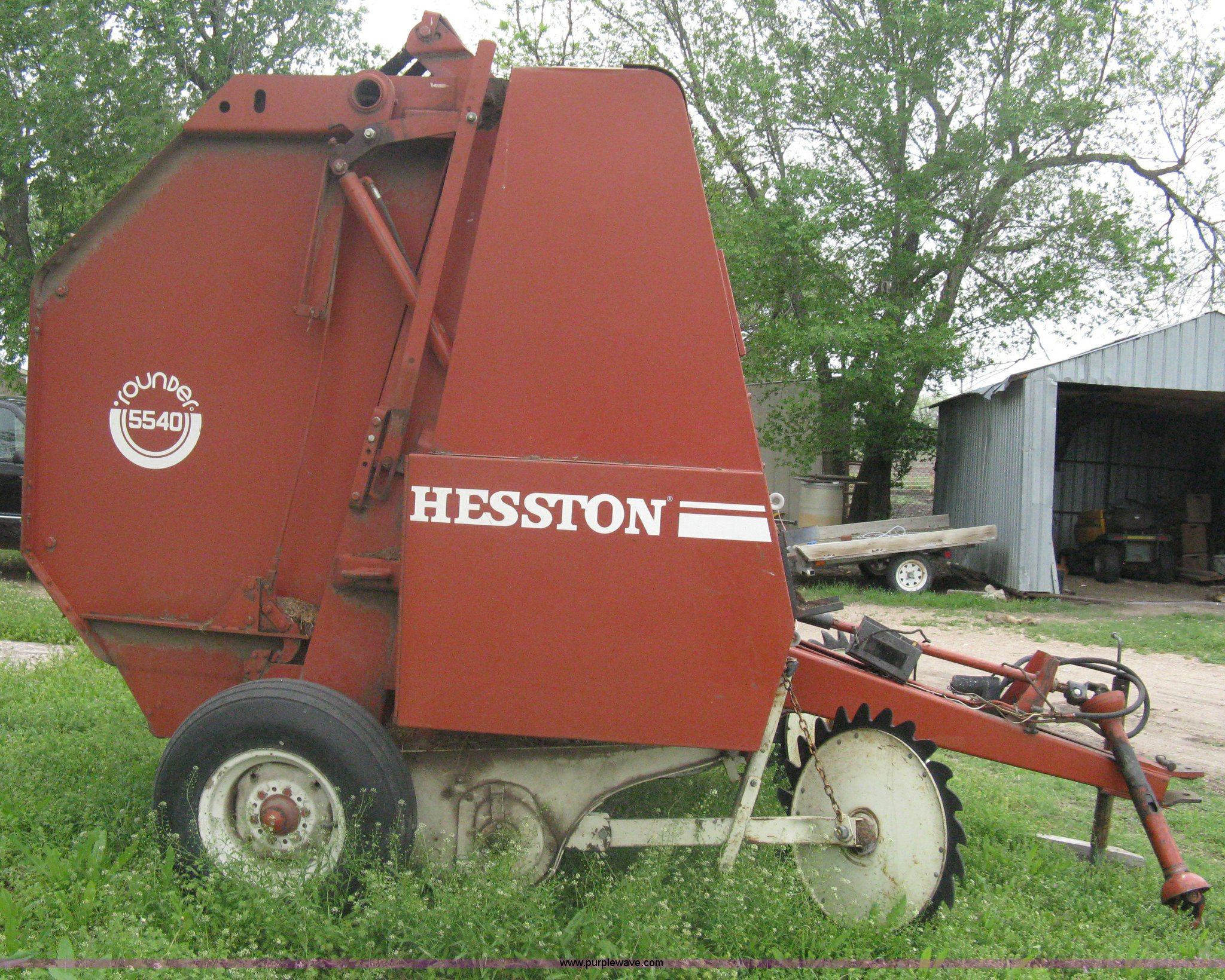 Purple Wave is selling a used Round Baler in Kansas. This item is a Hesston 5540 round baler with the following: Twine tie, 540 PTO, In cab control monitor, 72 bales on counter, 9.5L-15SL, Serial R5542072