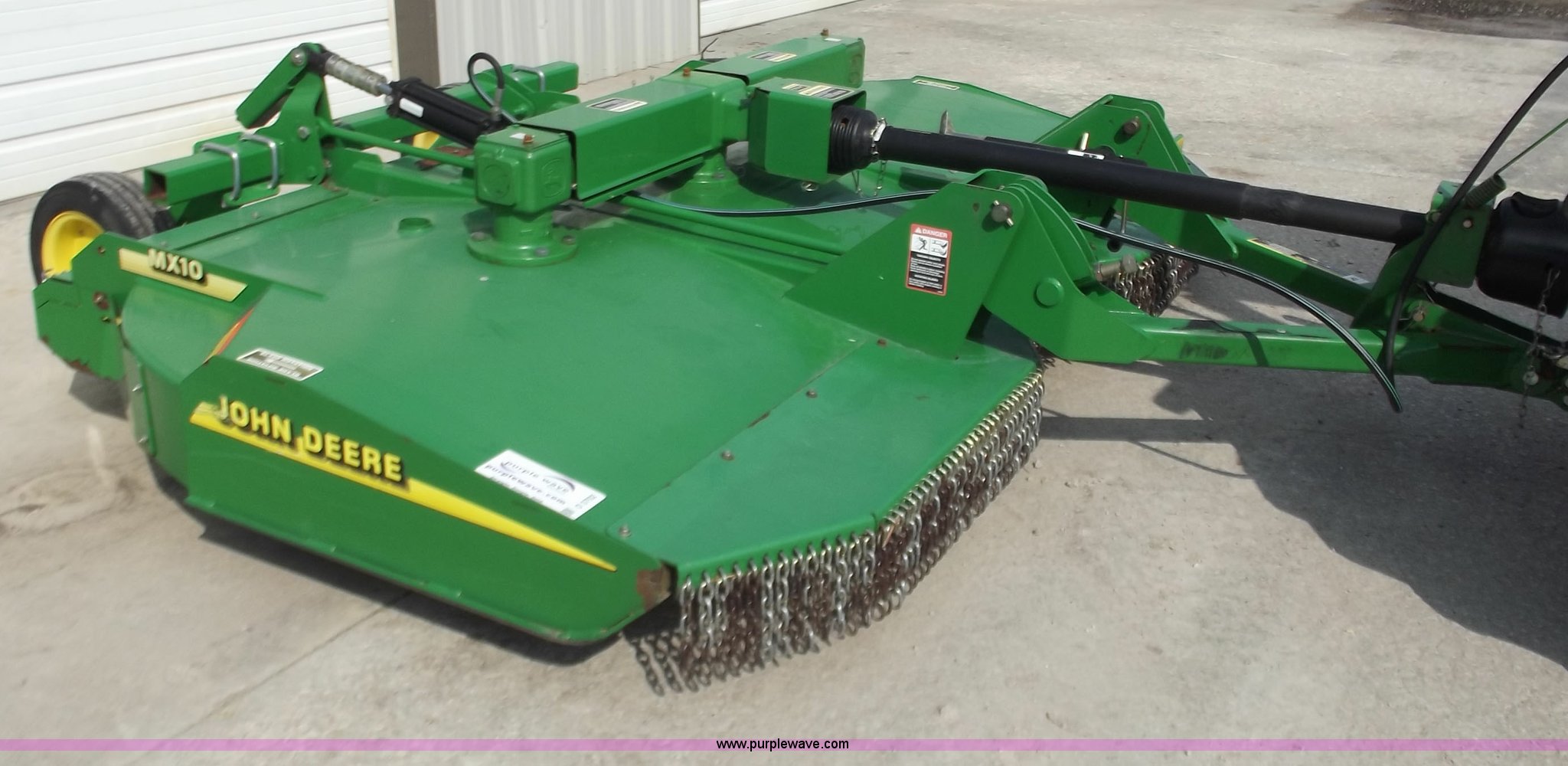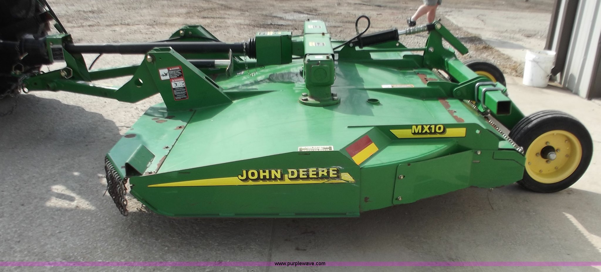 Purple Wave is selling a used Mower, Cutter, Shredder in Missouri. This item is a John Deere MX10 10' rotary mower with the following: Less than 10 hours use, Rear discharge, Hydraulic lift, Pin hitch, Tongue jack, Stump jumper, 21x7-12 tires, Used with item D3698, Tractor not included, Serial W0MX10E011439