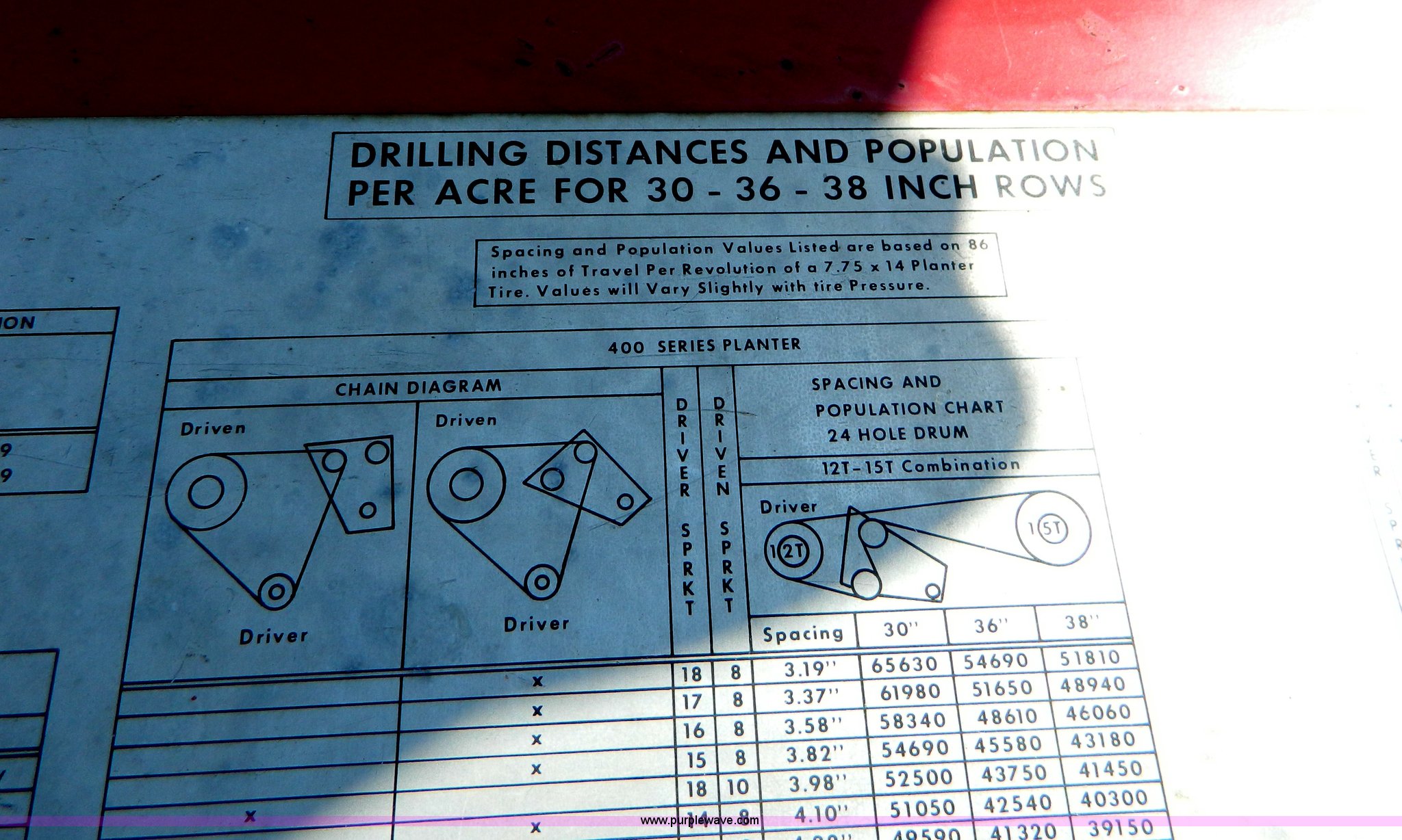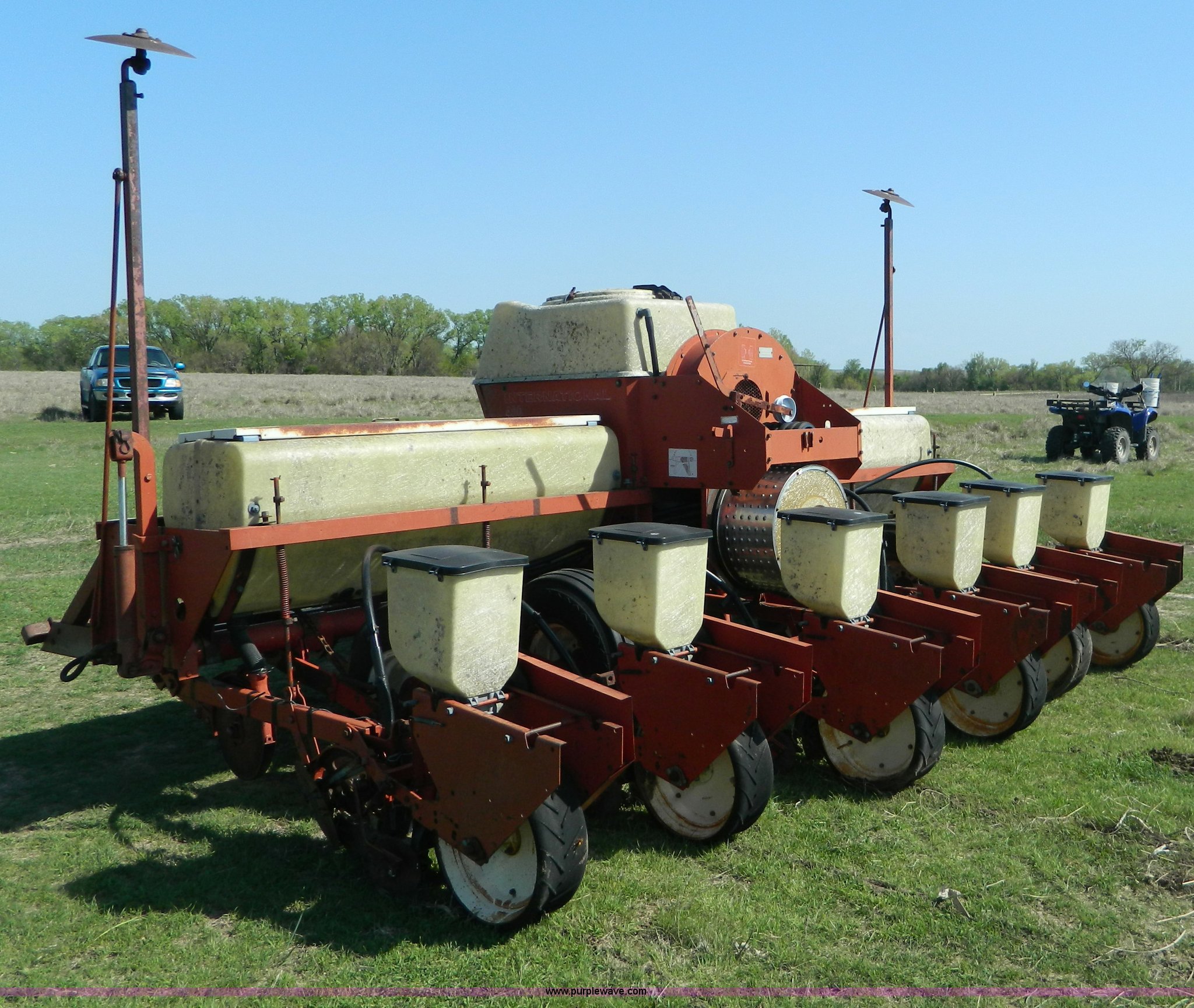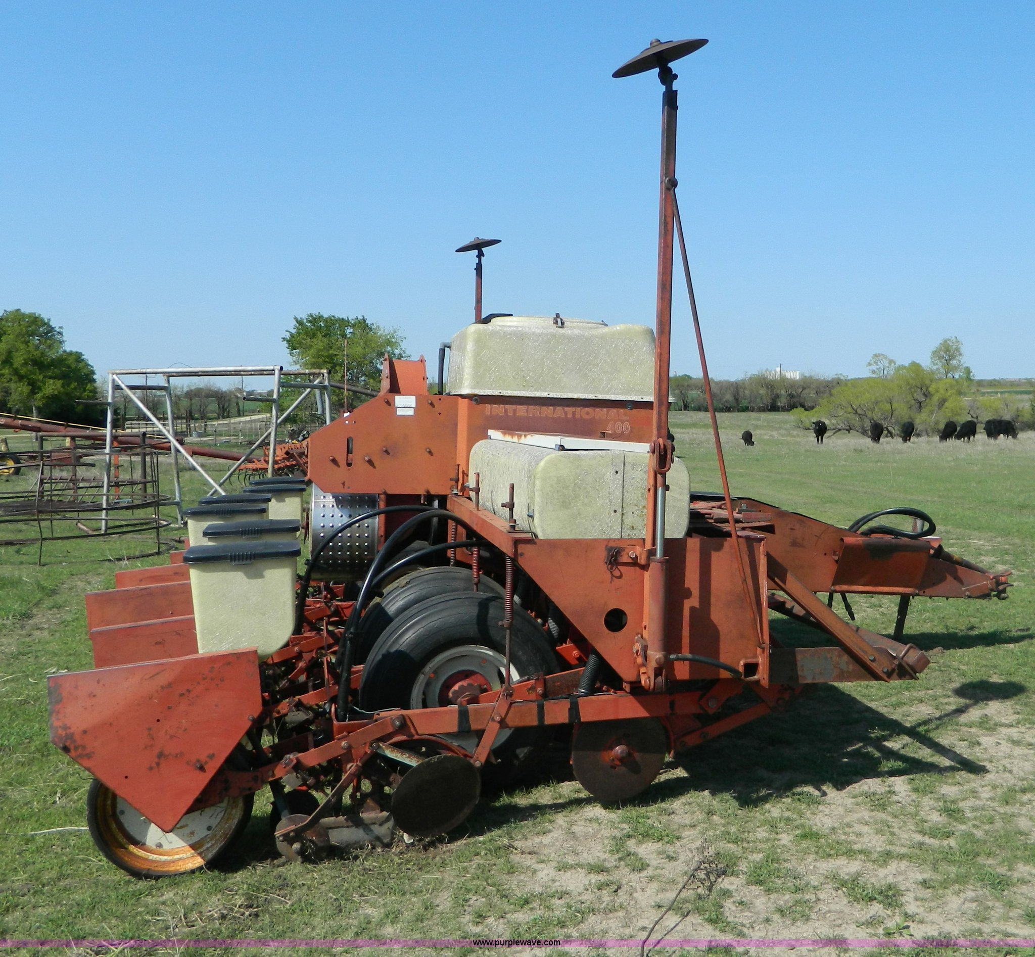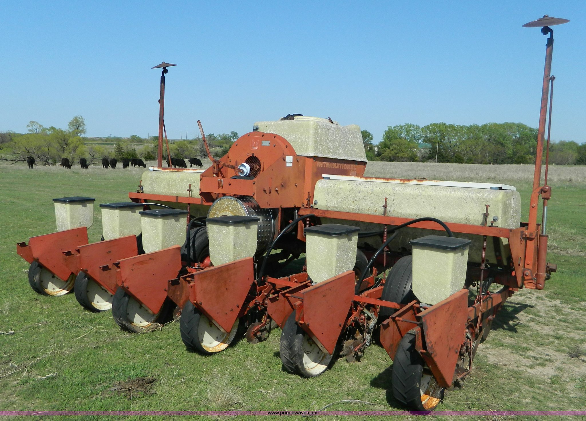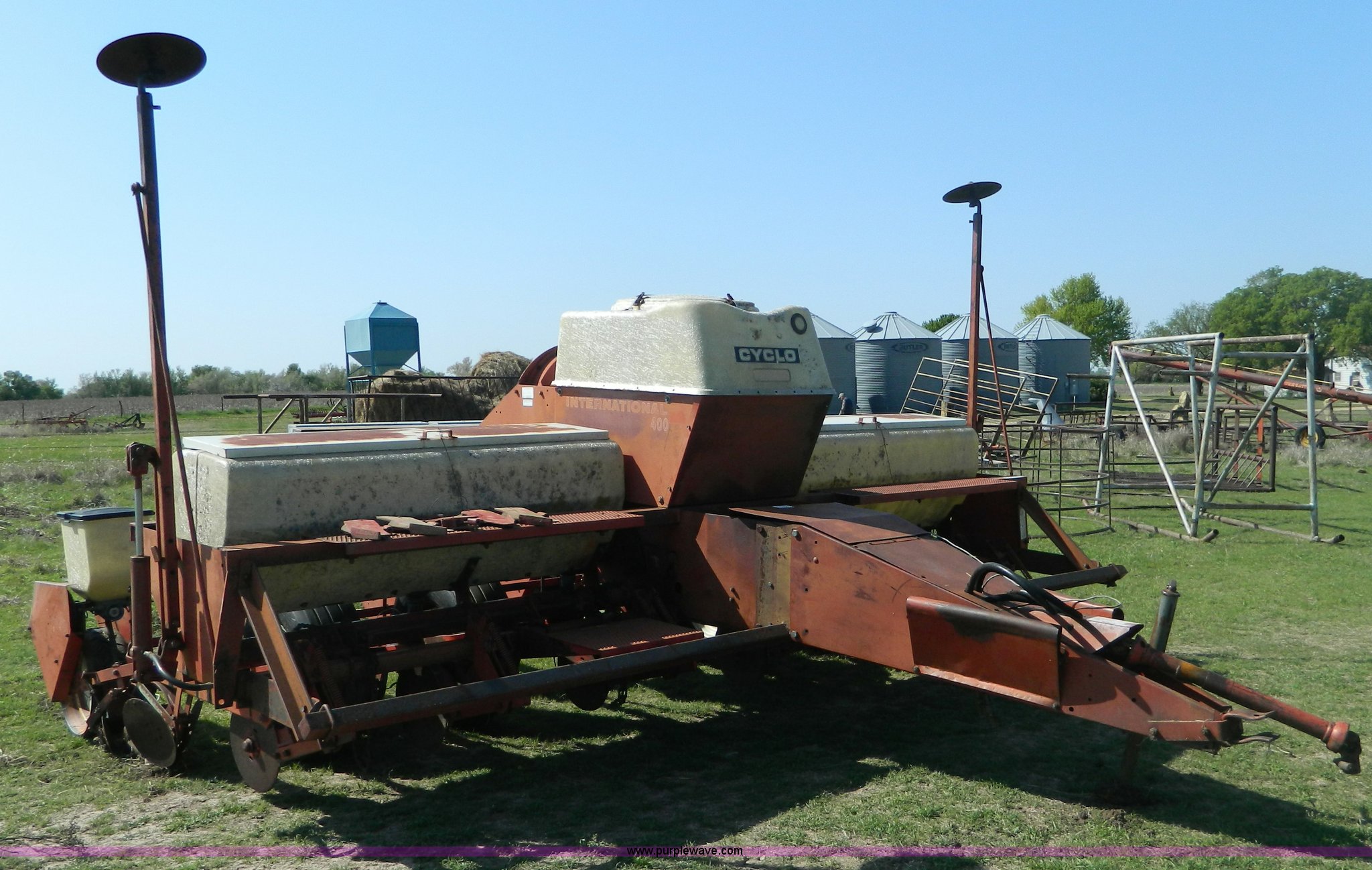 Purple Wave is selling a used Planter in Kansas. This item is a International Harvester 400 six row planter with the following: 30" spacing, Individual hoppers, Double disk openers, Milo and soybean drums, Hydraulic markers, 540 PTO, Dry fertilizer, Extra sprockets, Serial 0970000U009607
