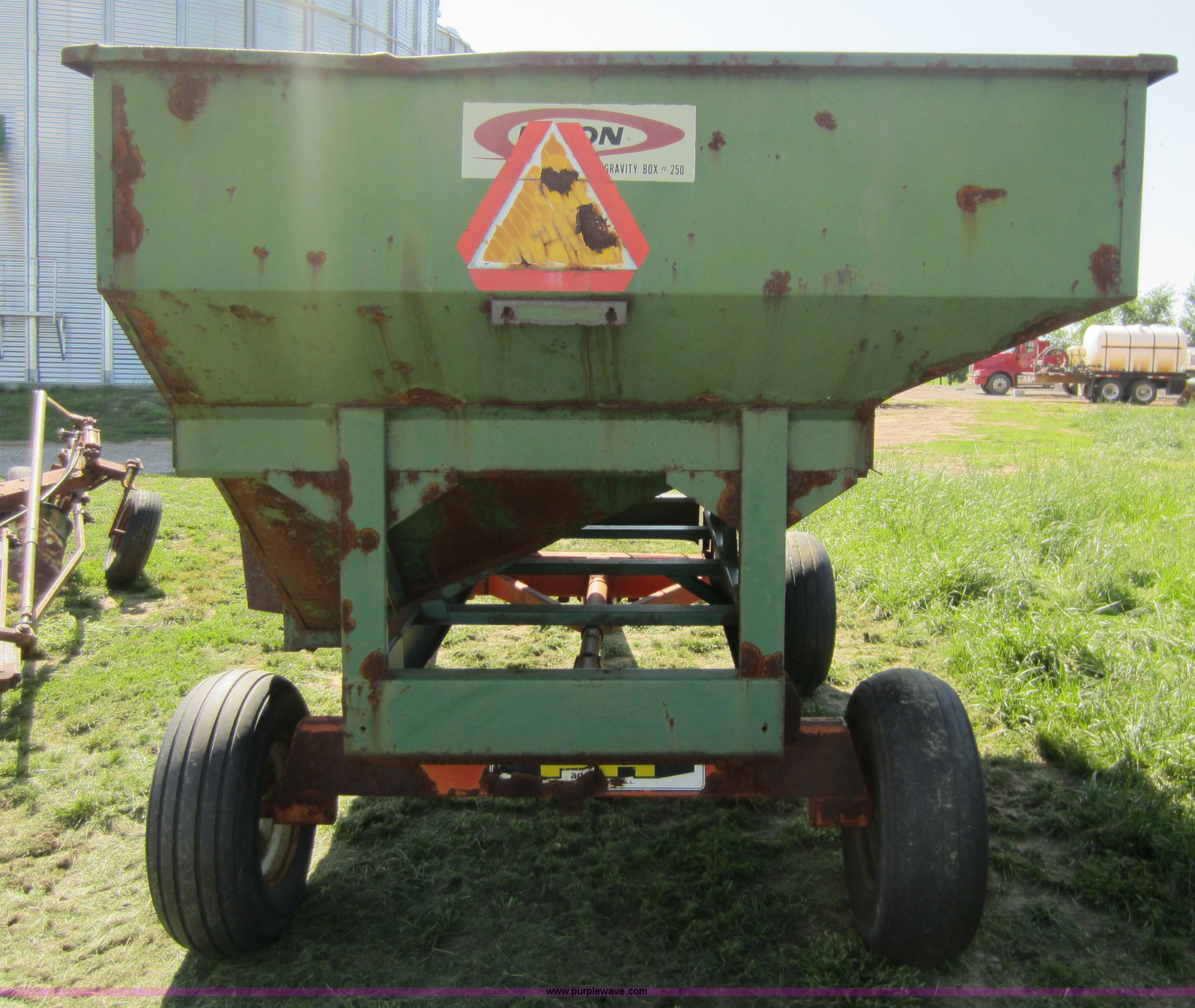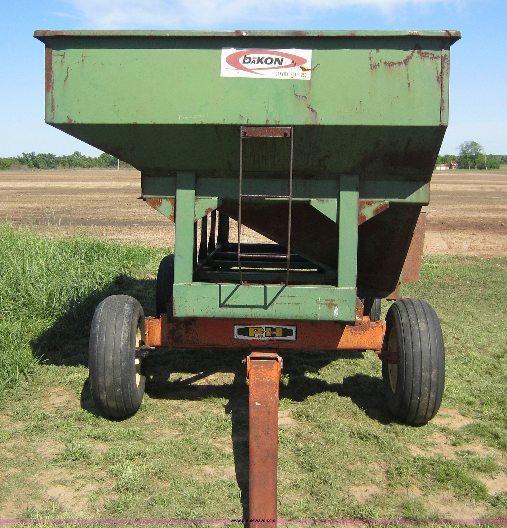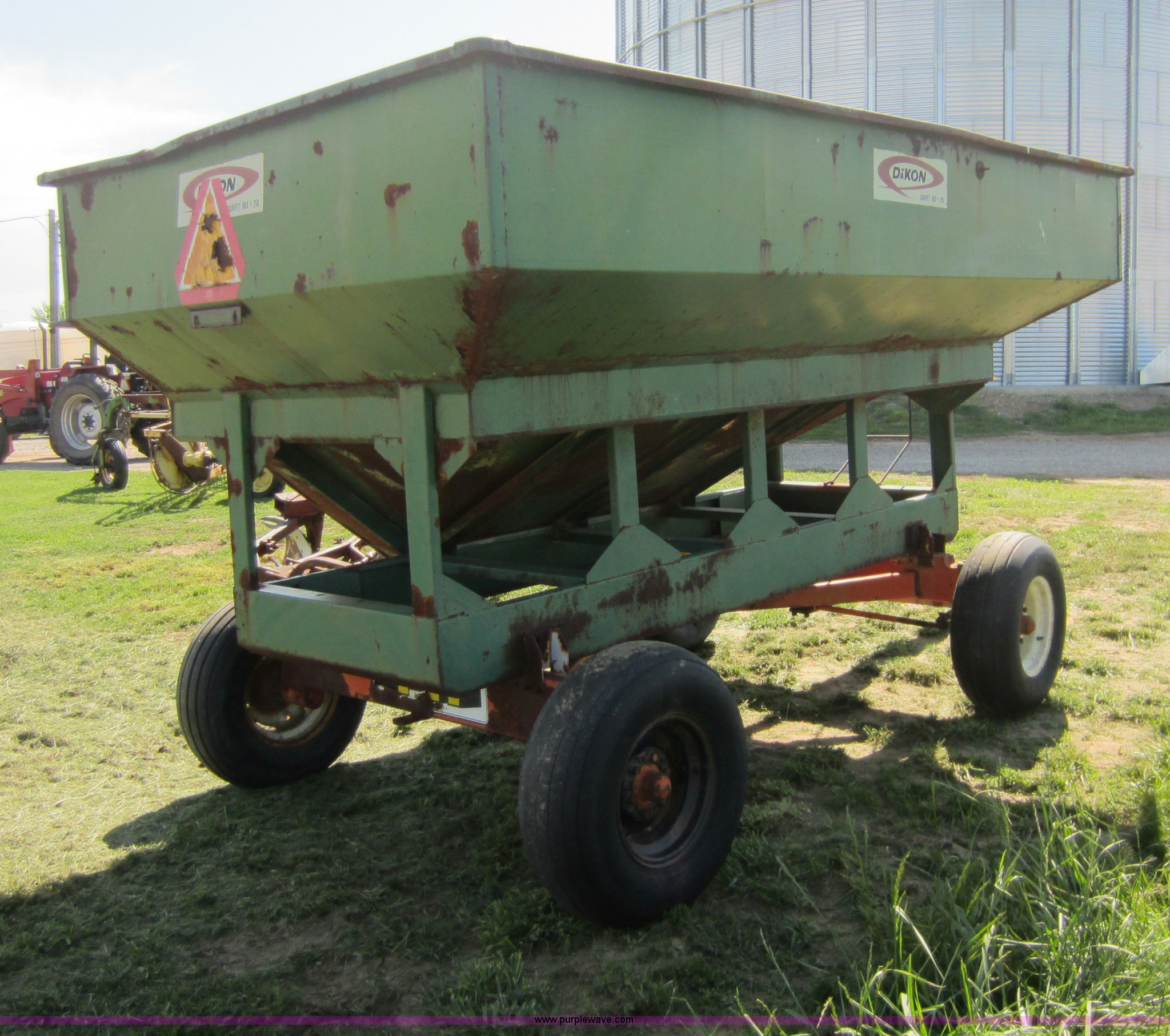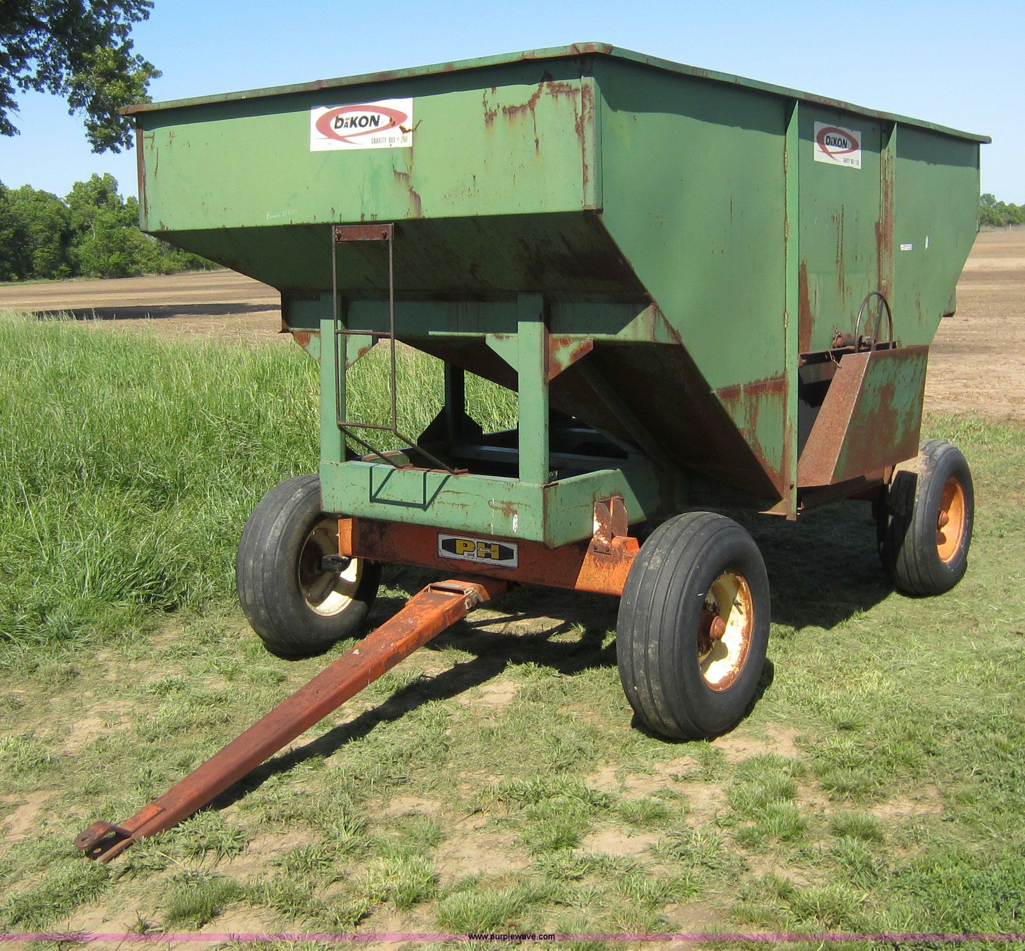 Purple Wave is selling a used Grain Cart or Gravity Wagon in Kansas. This item is a Dakon gravity wagon with the following: 250 bushels, 11L-15 tires