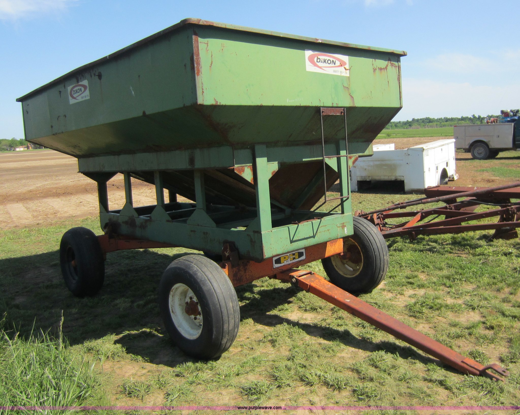 Dakon gravity wagon. 250 bushels, 11L-15 tires. Shipping quotes available. Hutto Grain and Livestock. 6663 Messer Road. Galena, KS 66739