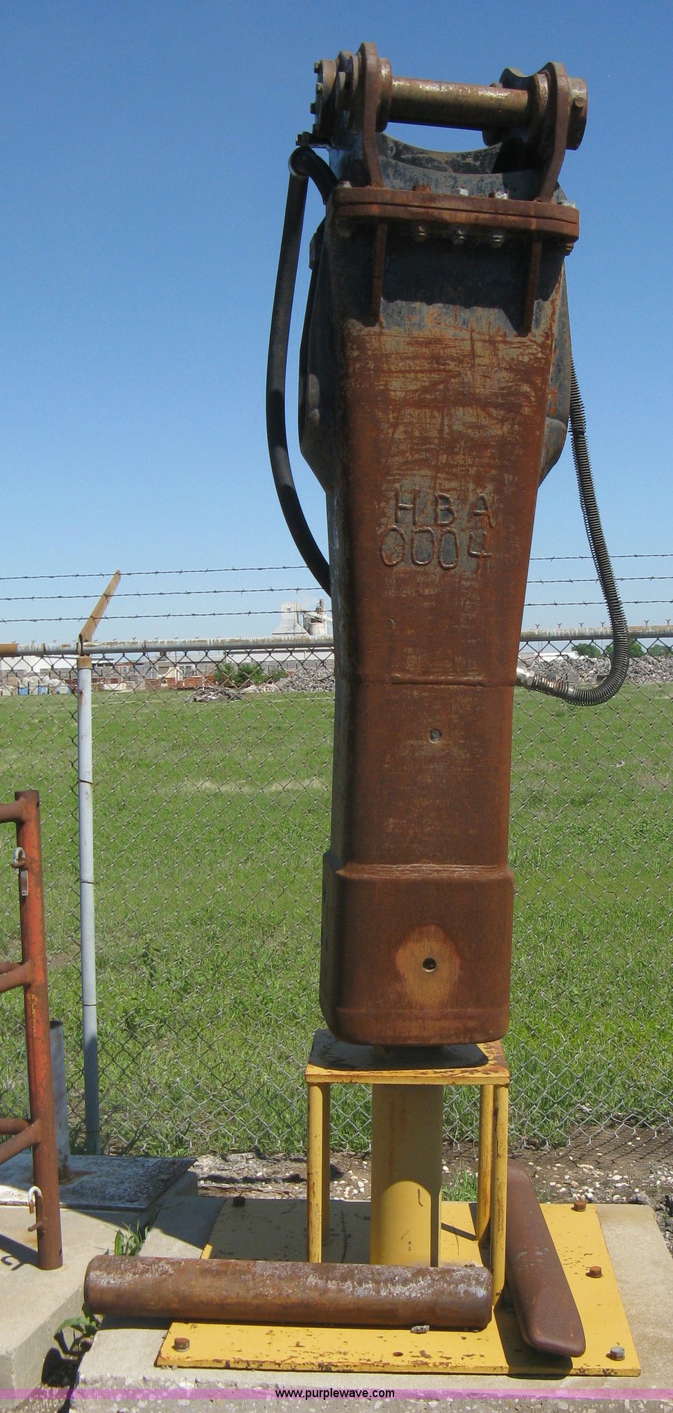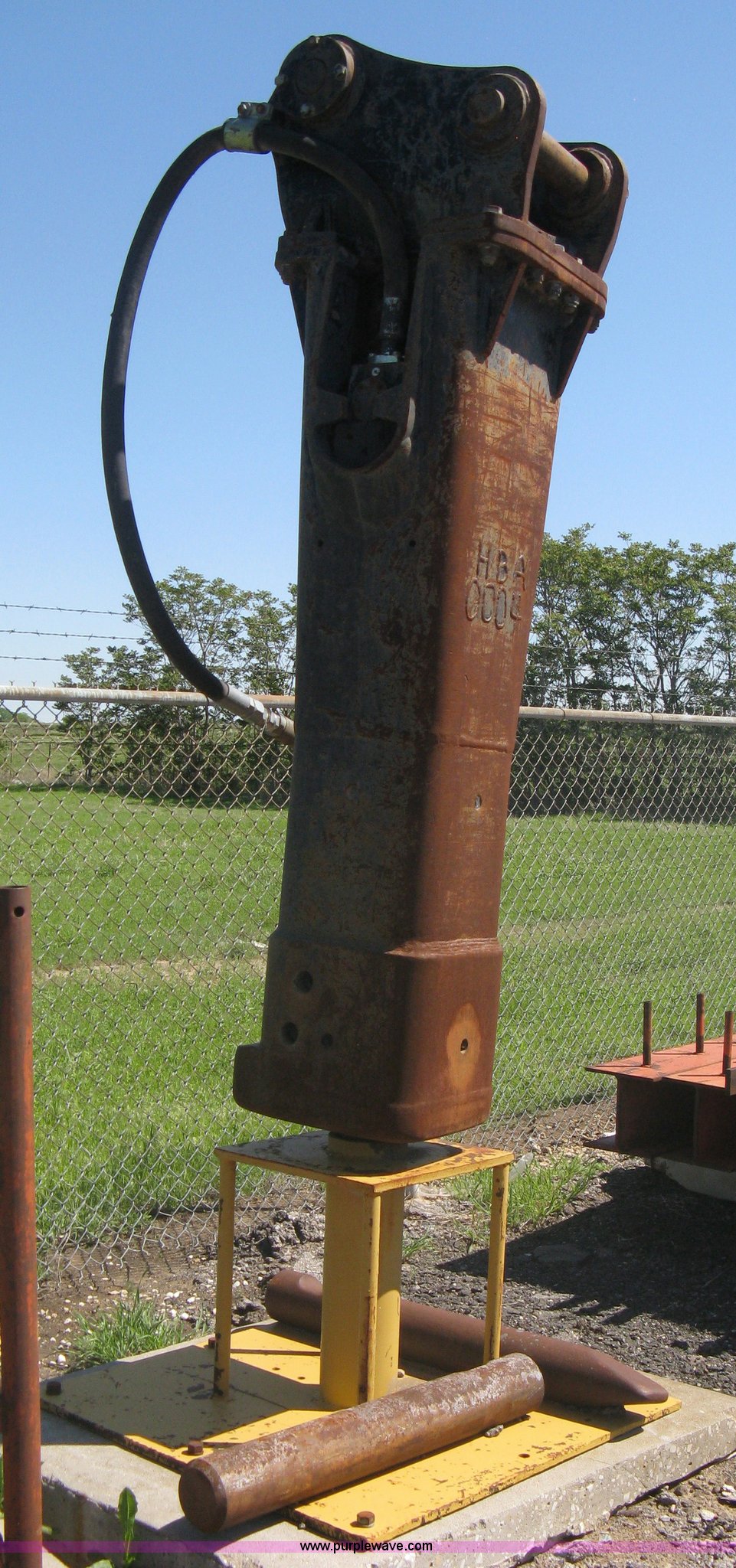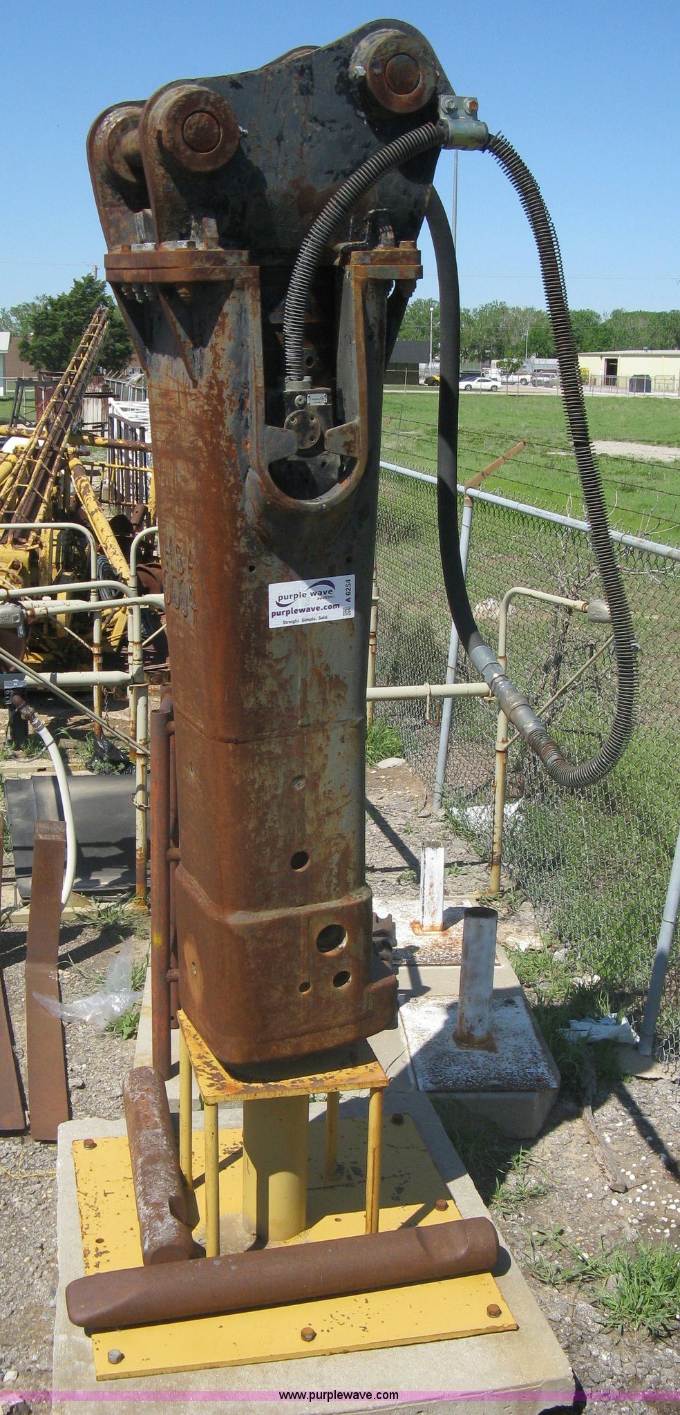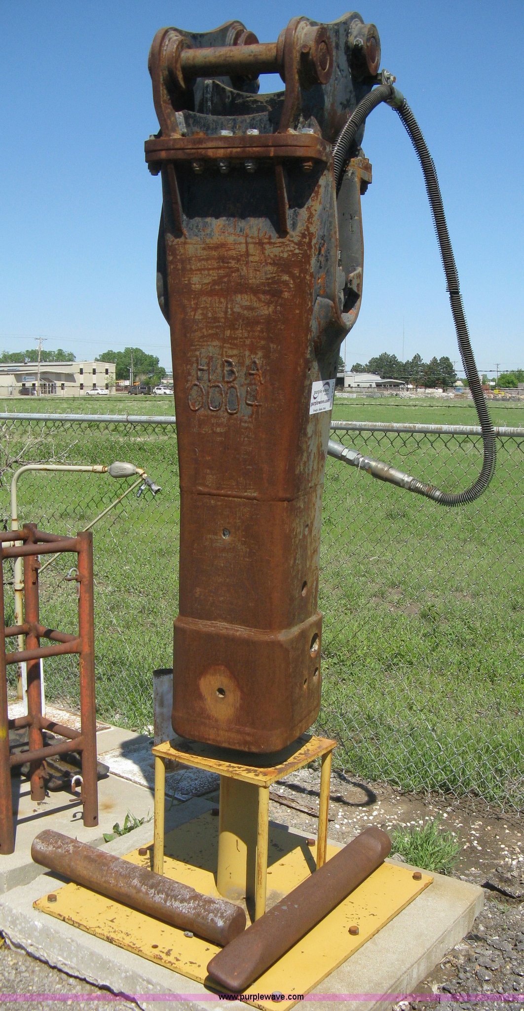Purple Wave is selling a used Excavator Attach. in Kansas. This item is a Balderson 130 hammer with quick attachment bracket with the following: (2) 42" and 34" breaker bits, On-stand, Removed from Caterpillar EL240E, Not working