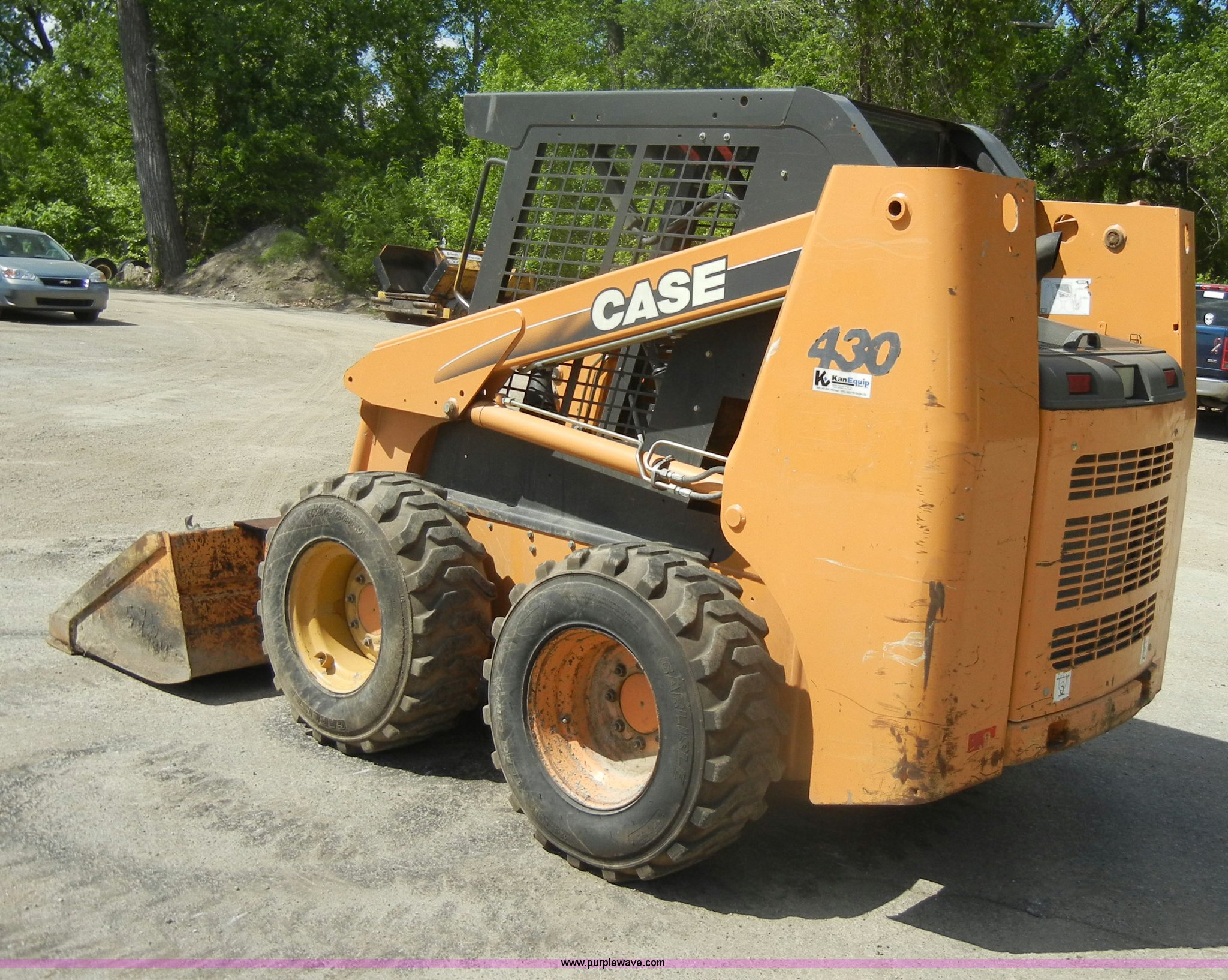 Purple Wave is selling a used Skid Steer Loader in Kansas. This item is a 2007 Case 430 skid steer with the following: Approx 1,371 hours, Hour meeter replaced, Case four cylinder diesel engine, 74 HP, Resealed winter of 2011, Foot and hand controls, 6' bucket, Bolt-on edge, 2,000 lb capacity, Front hydraulics, Front and rear lights, 12-16.5 tires, 6,875 lbs. base operating weight, Serial N7M460596