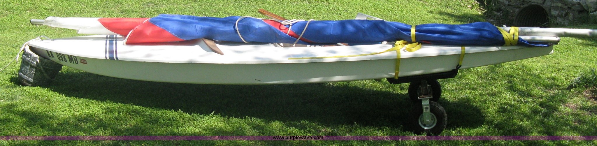 Purple Wave is selling a used Boat in Kansas. This item is a 1976 Sunfish 14' two person sailboat with the following: Recently replaced main sail, Center board and rudder, Custom built tow dolly, 4.10/3.50 tires, ID# AMF41066M76H