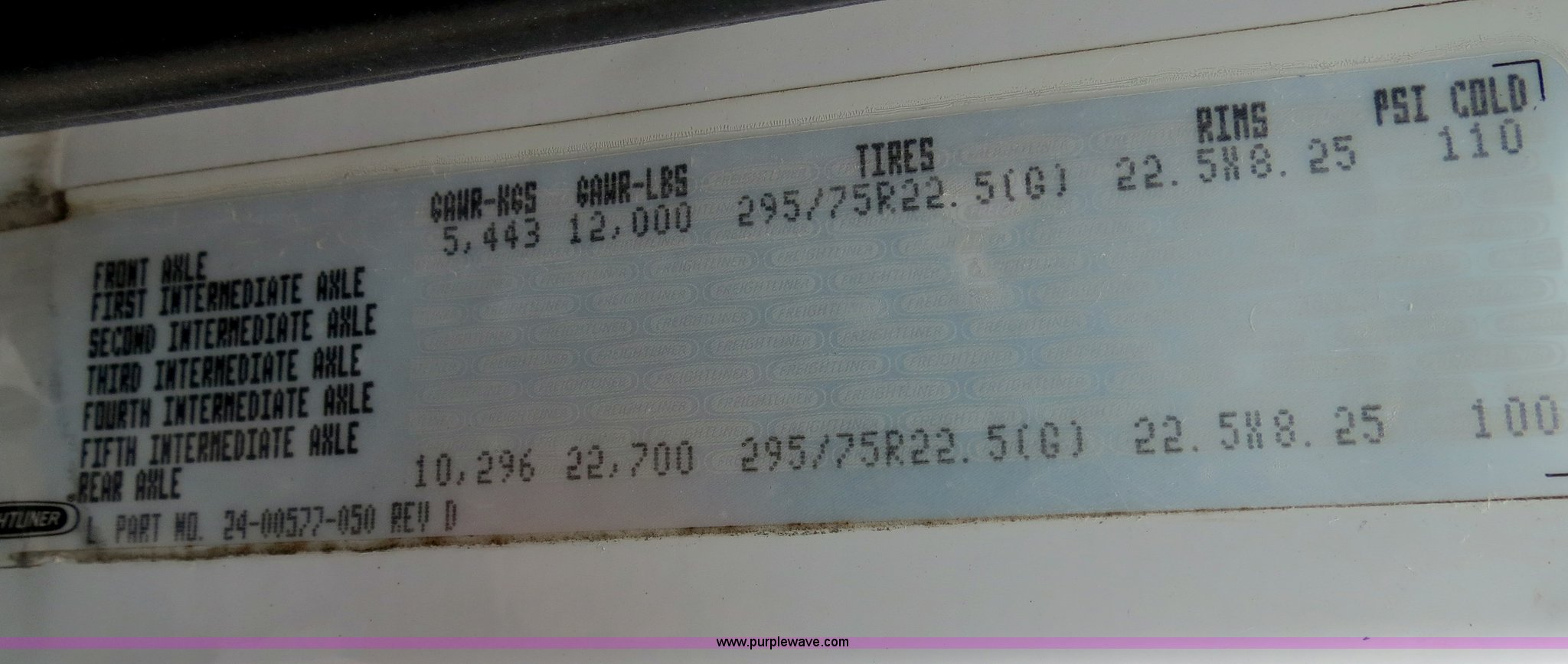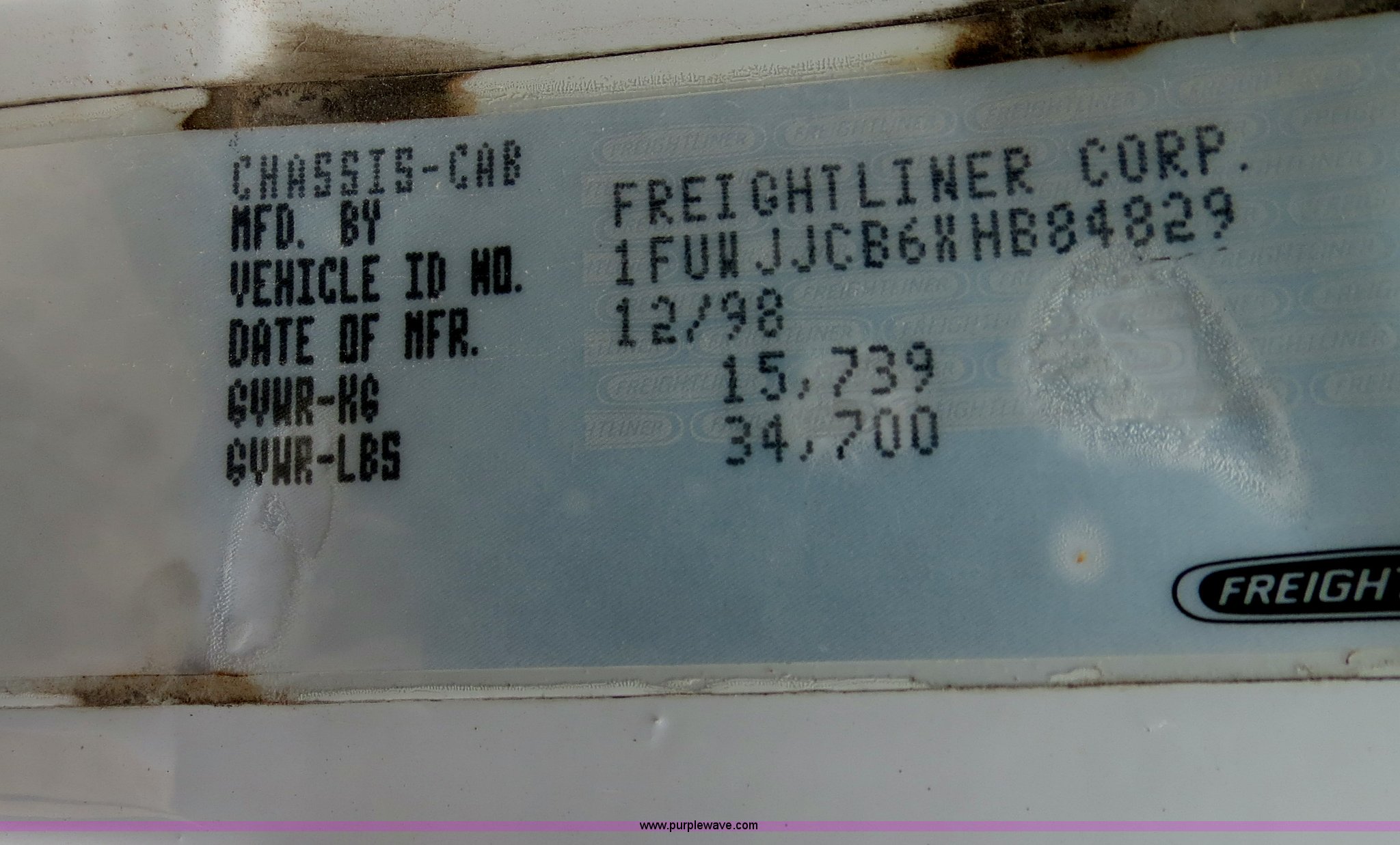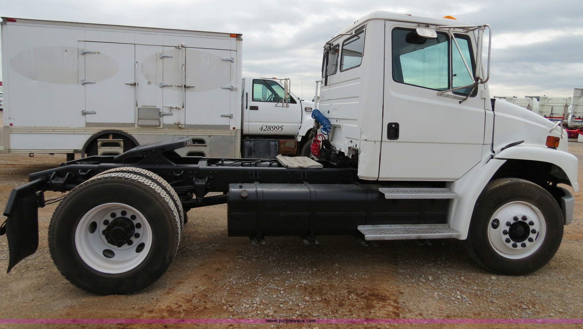 Purple Wave is selling a used Truck Tractor in Oklahoma. This item is a 1999 Freightliner FL80 semi truck with the following: 354,798 miles on odometer, 12,282 hours on meter, Caterpillar 3126 7.2L six cylinder diesel engine, 300 HP, Serial 7AS42207, AC and heat, Cruise, Heated mirrors, Air ride seat, Air ride cab, Bumper, Block heater, (2) 100 gallon fuel tanks, Aluminum deck plate, Fifth wheel hitch, Pintle hitch, Air suspension, Air brakes, 295/75R22.5 rear tires, 275/80R22.5 front tires, GVWR 34,700 lbs, FAWR 12,000 lbs, RAWR 22,700 lbs, 148" wheelbase