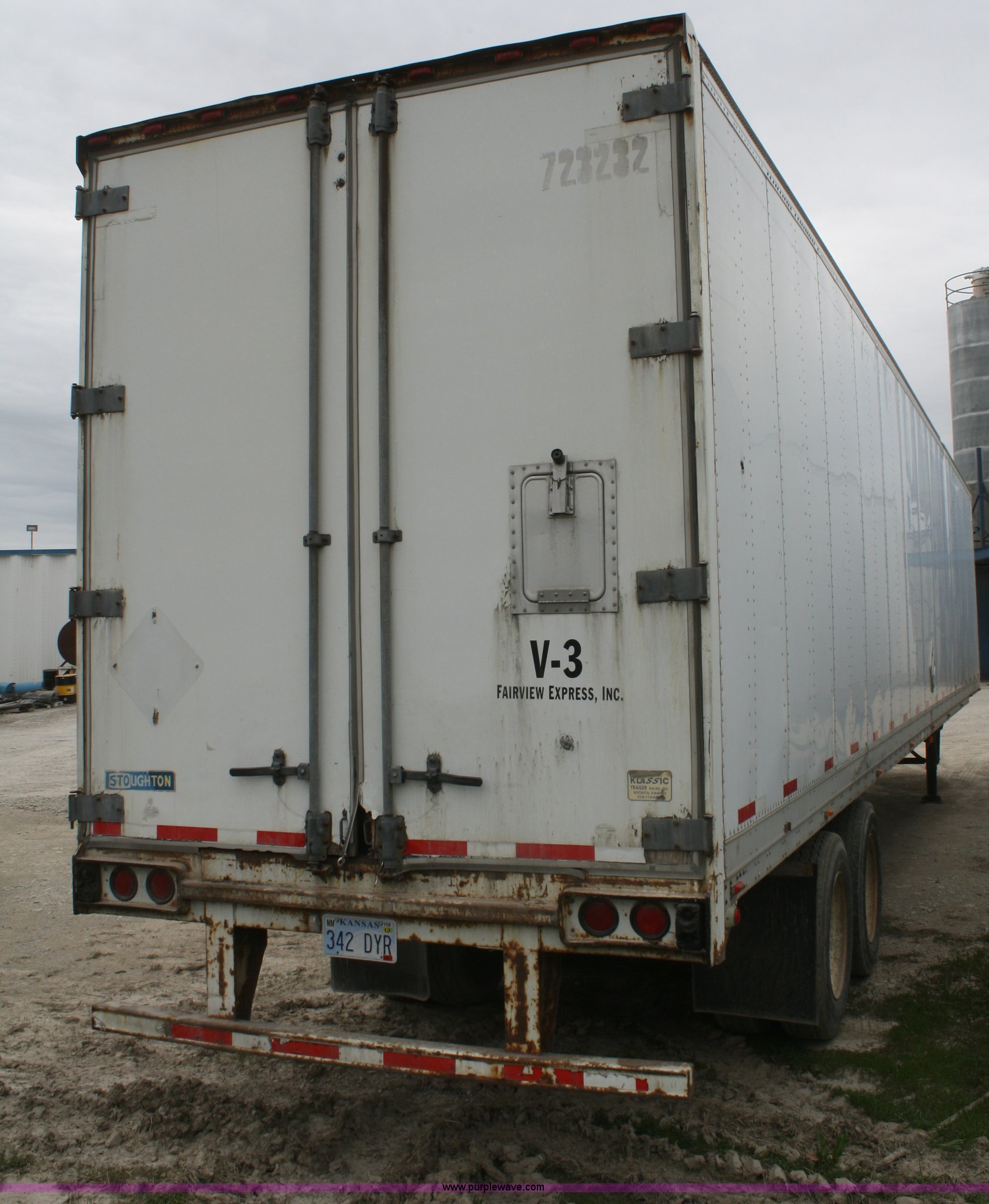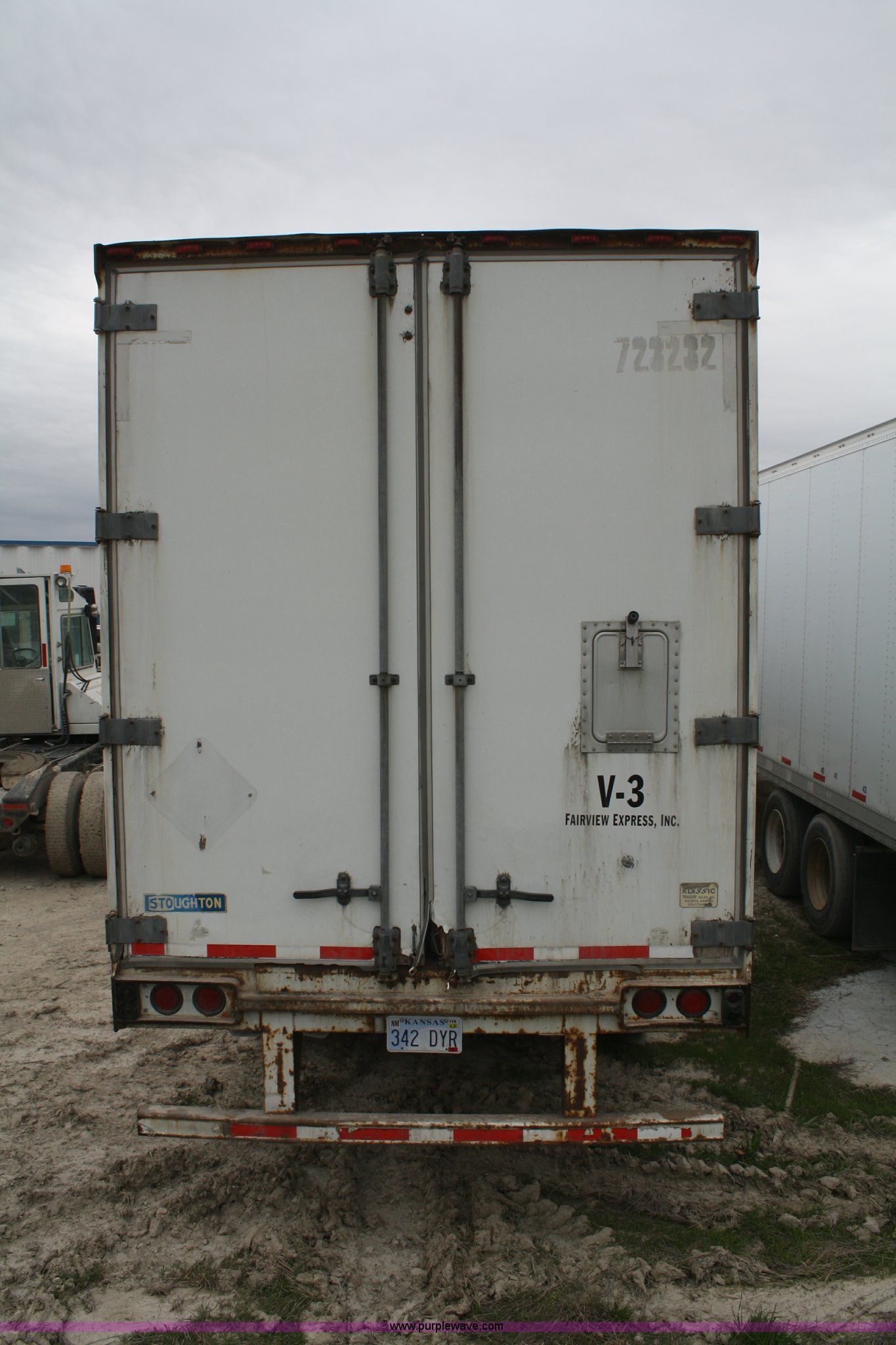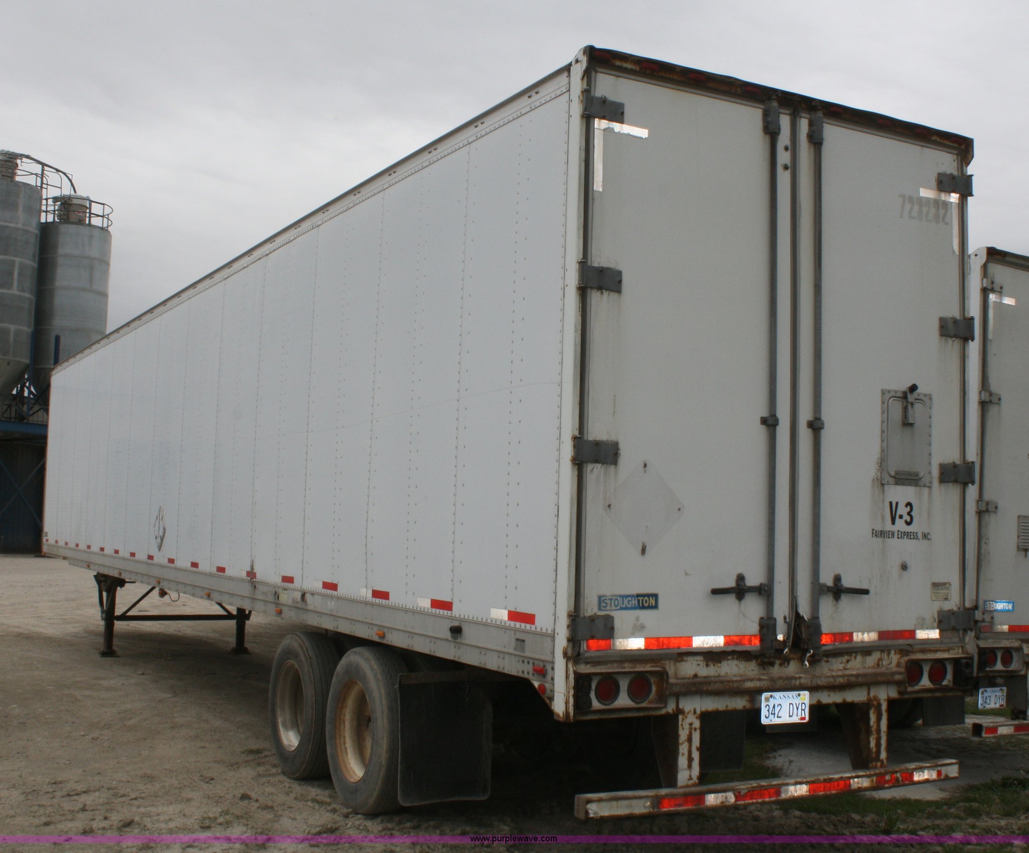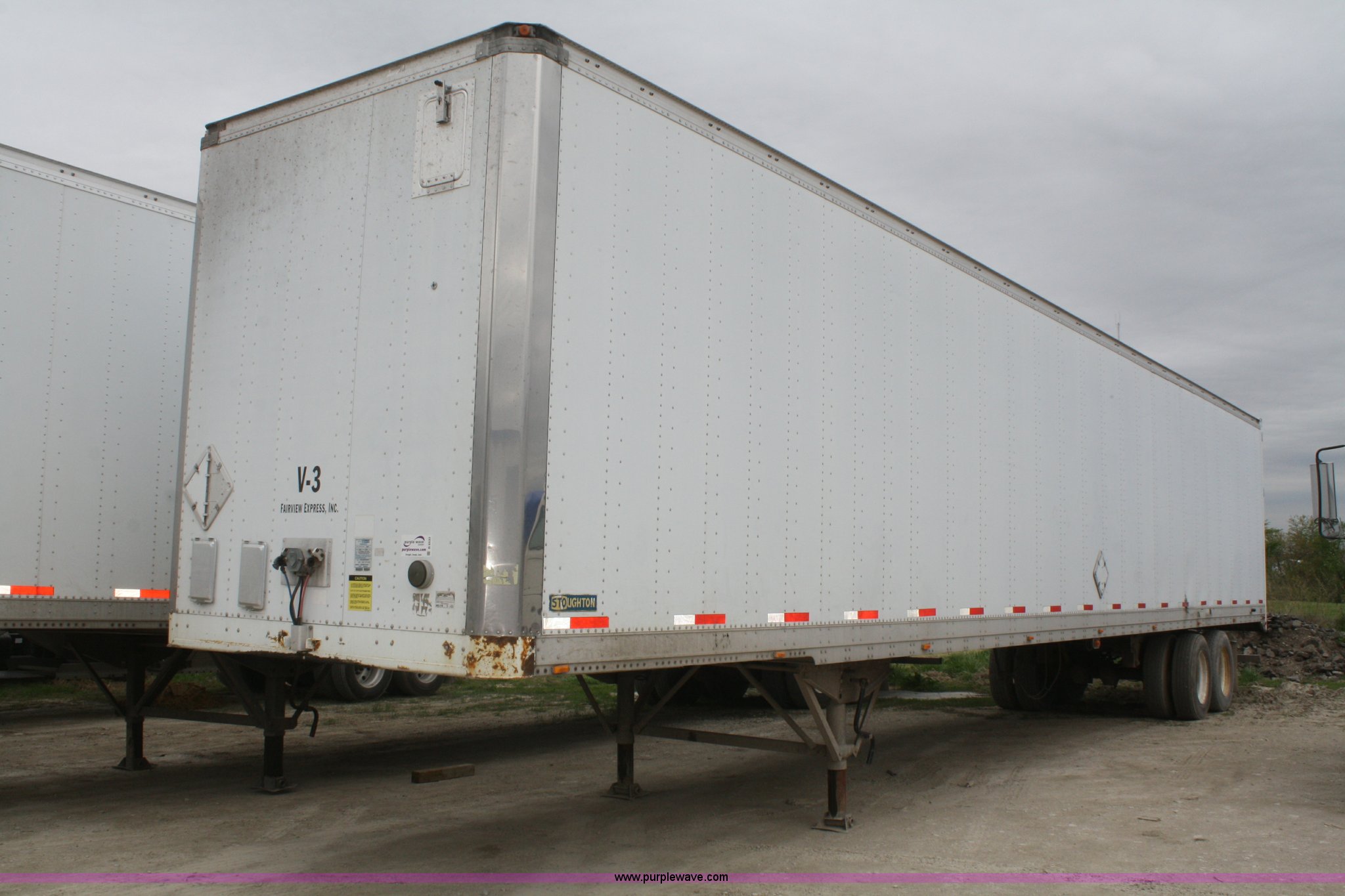 Purple Wave is selling a used Dry Van Trailer in Kansas. This item is a 2000 Stoughton 53' dry van trailer with the following: Air suspension, Sliding tandems, Swinging doors, 102"W, Air brakes, 13.5'H, 285/75R24.5 tires, GAWR 19,000 lbs