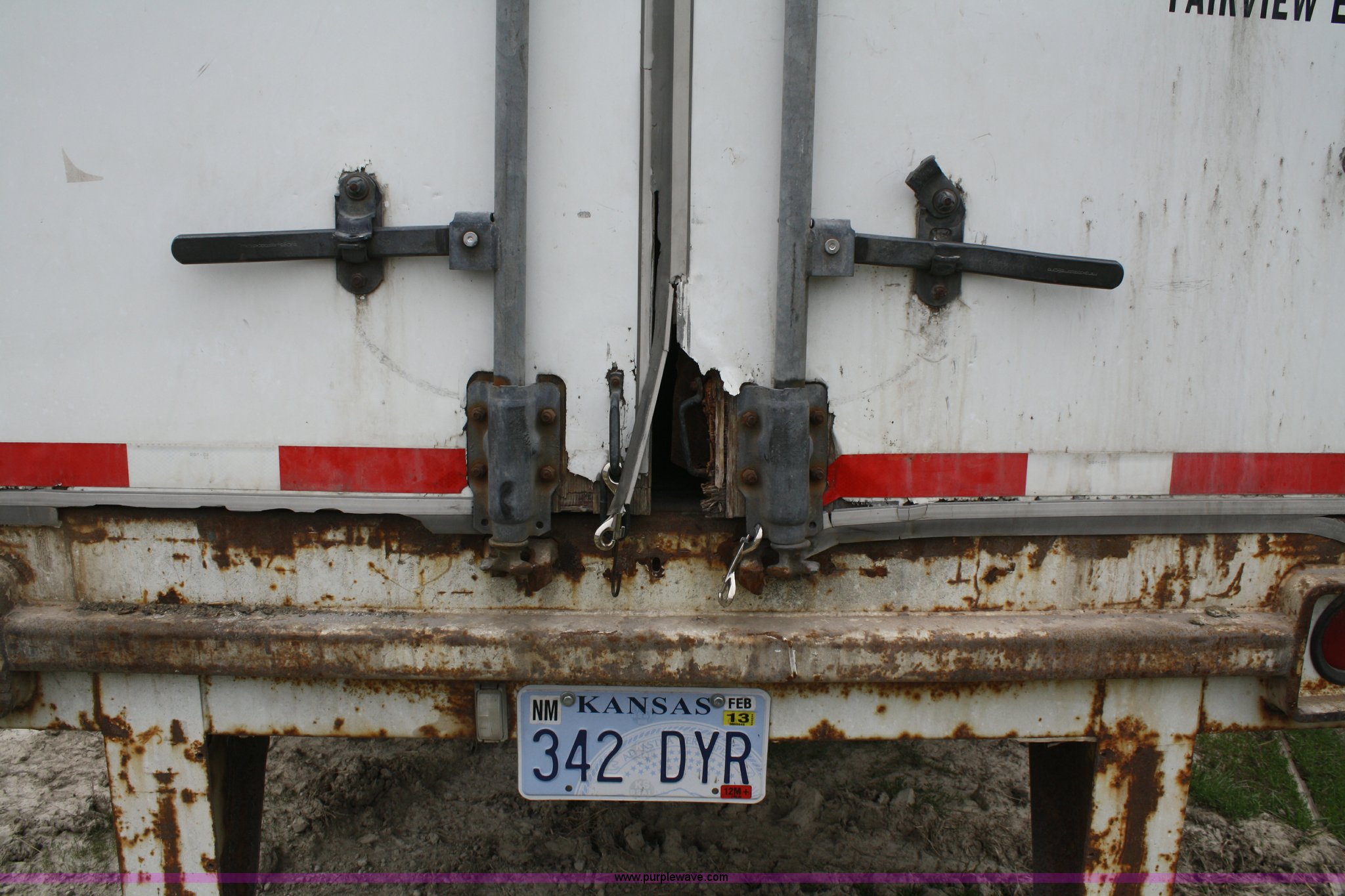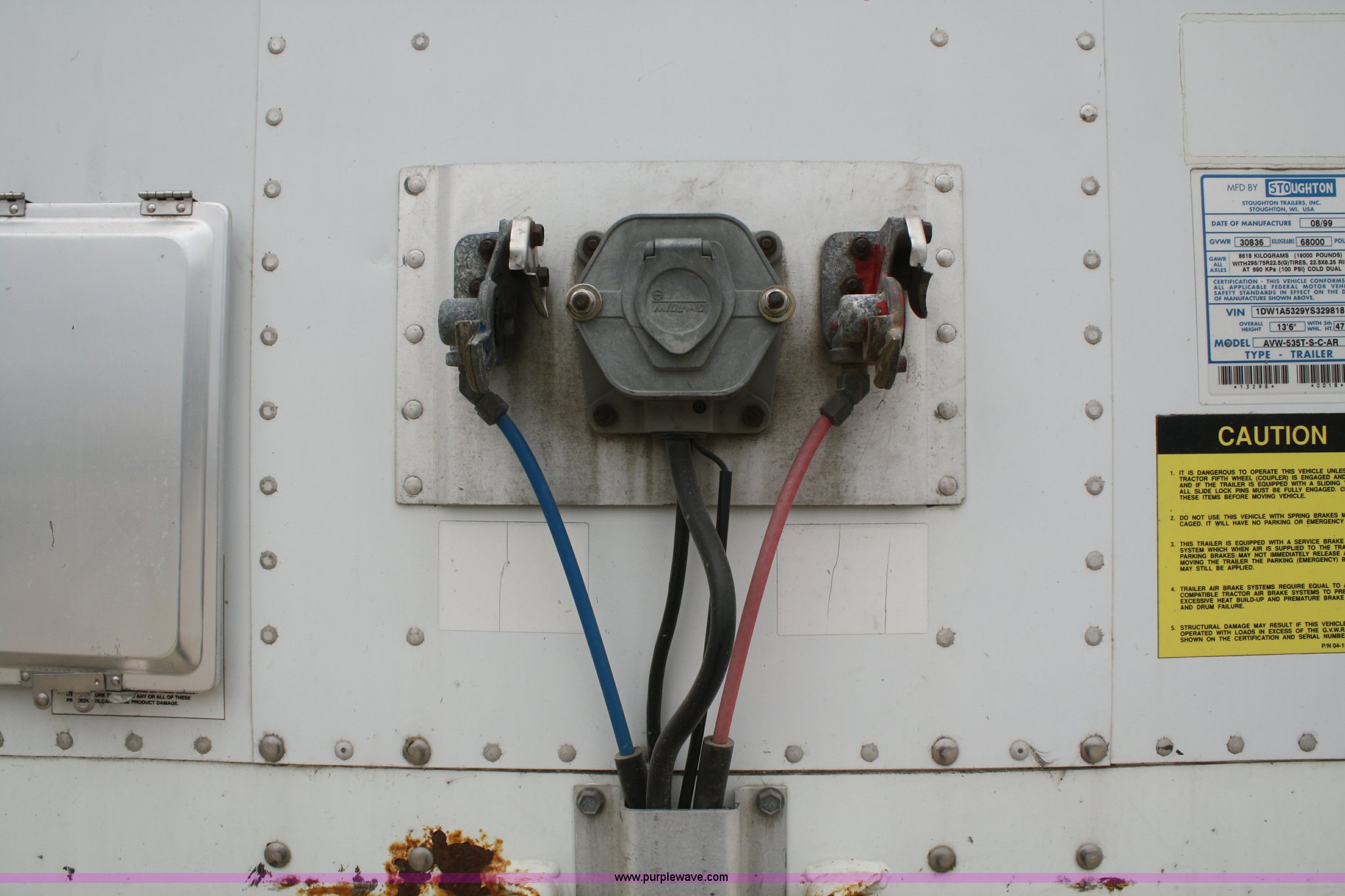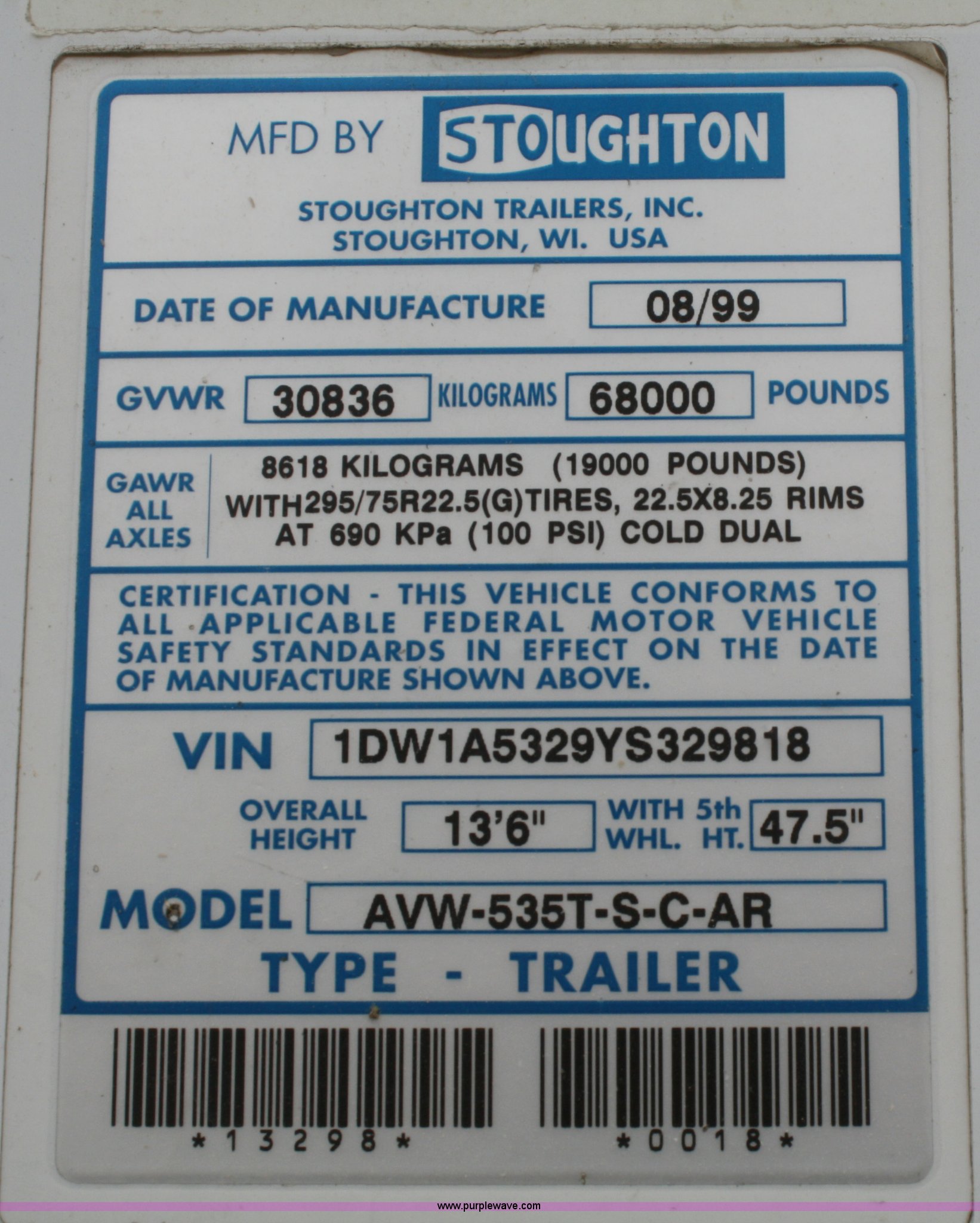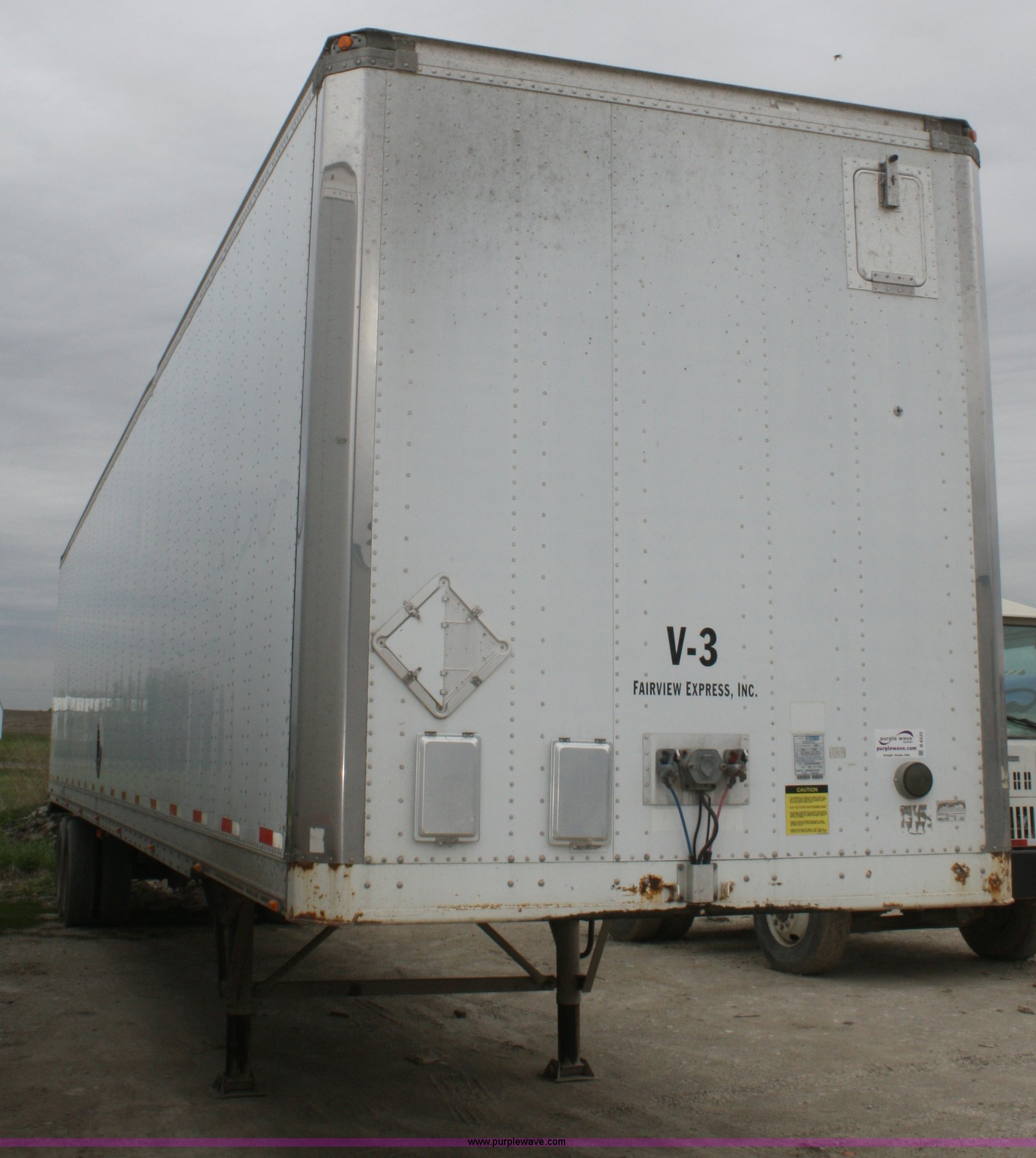 Purple Wave is selling a used Dry Van Trailer in Kansas. This item is a 2000 Stoughton 53' dry van trailer with the following: Air suspension, Sliding tandems, Swinging doors, 102"W, Air brakes, 13.5'H, 285/75R24.5 tires, GAWR 19,000 lbs