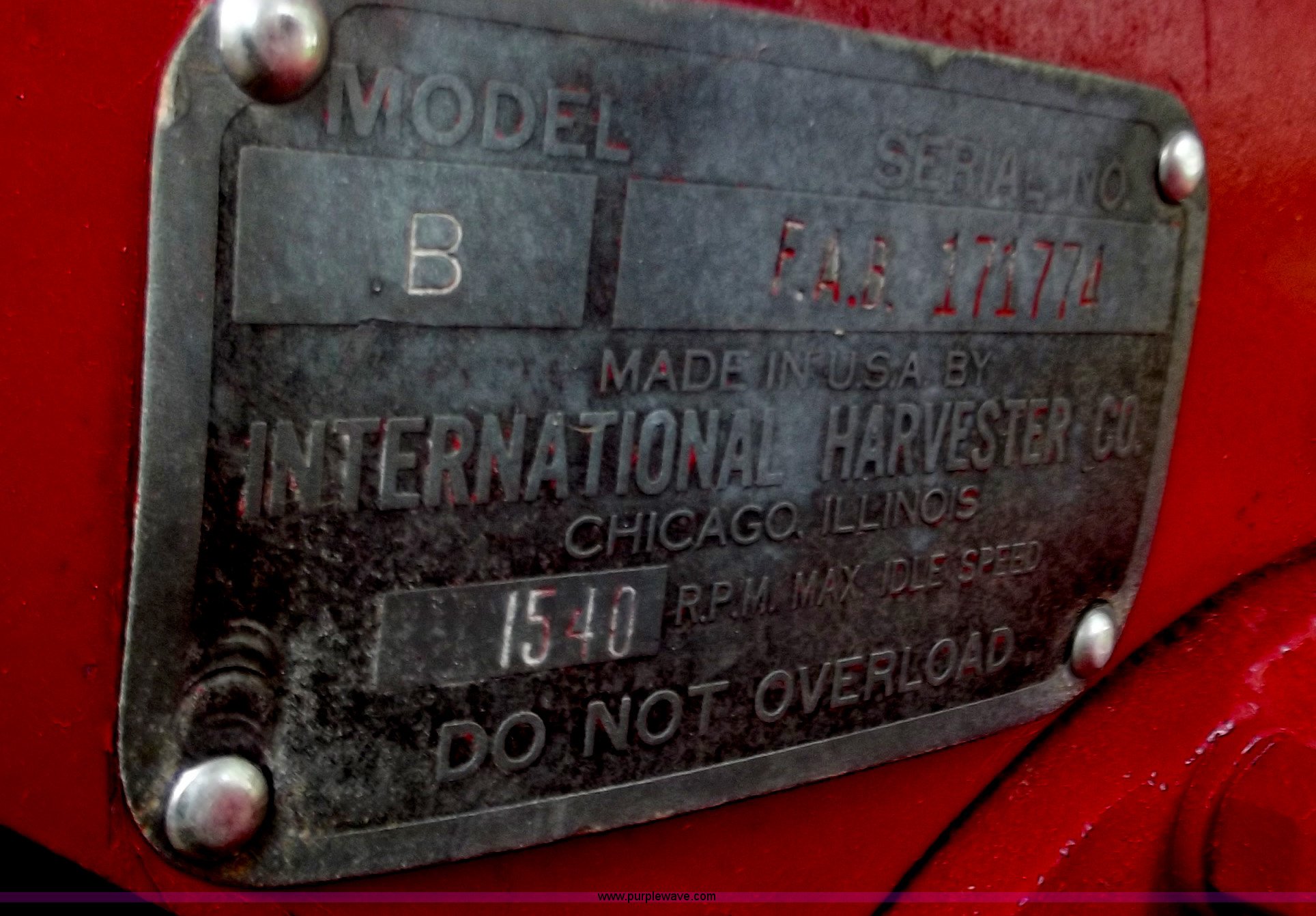 Purple Wave is selling a used Tractor in Missouri. This item is a Mccormick Farmall B Culti-Vision tractor with the following: Four cylinder gas engine, Manual transmission, 4F-1R gears, 6v electric start, Tricycle front end, 540 PTO, 4.00x15 front tires, 11.2x24 rear tires, Recently replaced paint, decals, and seat, Serial 171774