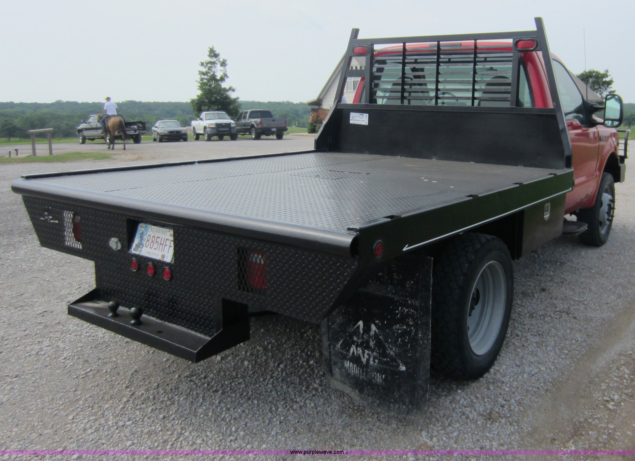 Purple Wave is selling a used Flat Bed Truck in Oklahoma. This item is a 2001 Ford F450 XL Super Duty flatbed pickup truck with the following: 116,985 miles on odometer, 6.8L V10 gas engine, Five speed manual transmission, Four wheel drive, AC and heat, Tilt, Cruise, AM/FM, Manual windows and locks, Vinyl interior, JTI 9'L flatbed, Trailer wiring, 225/70R19.5 tires, Dual rear, GVWR 15,000 lbs