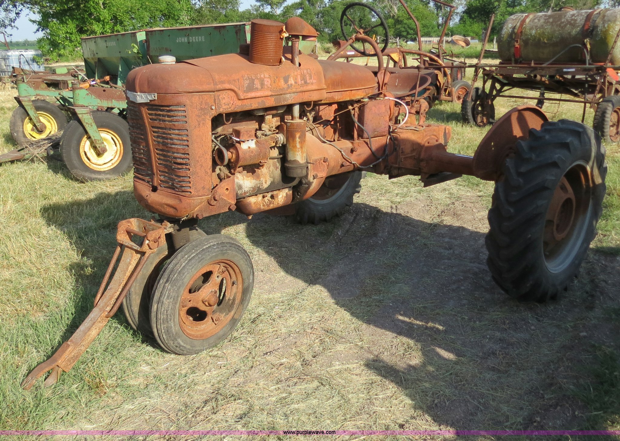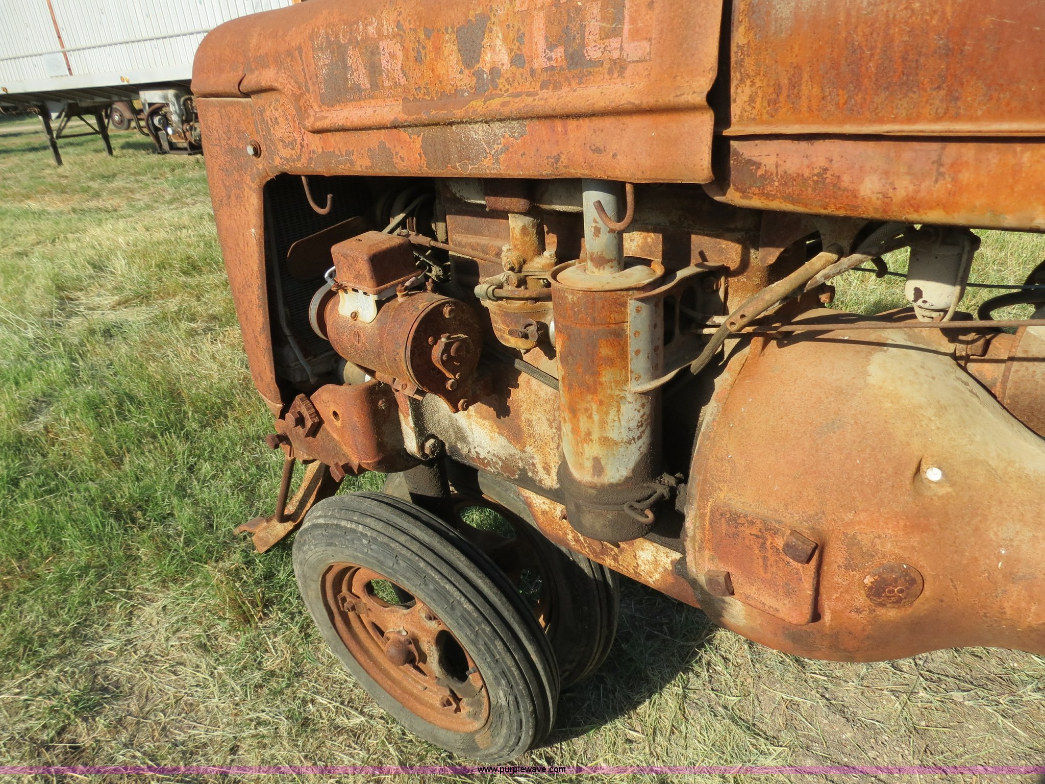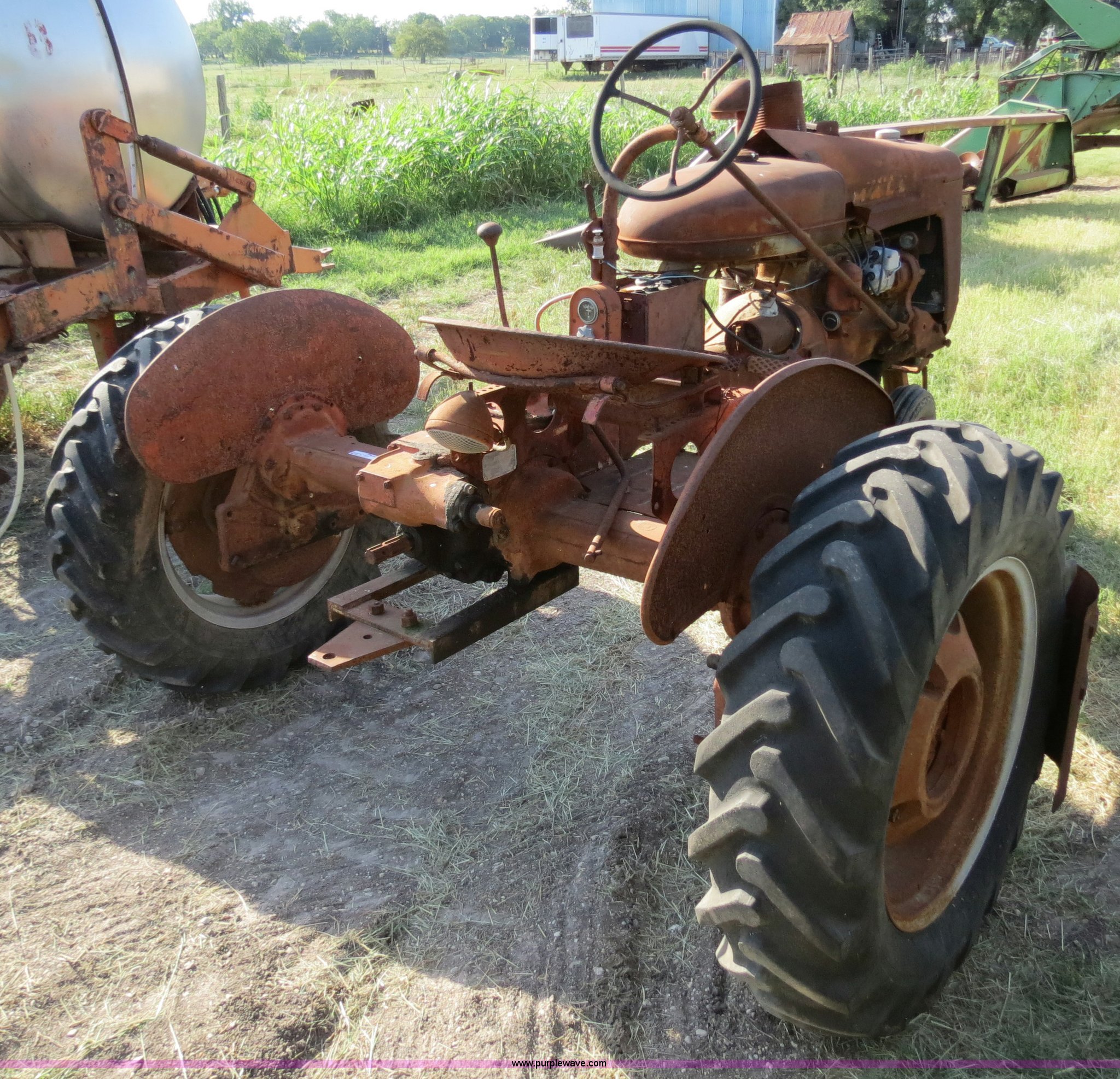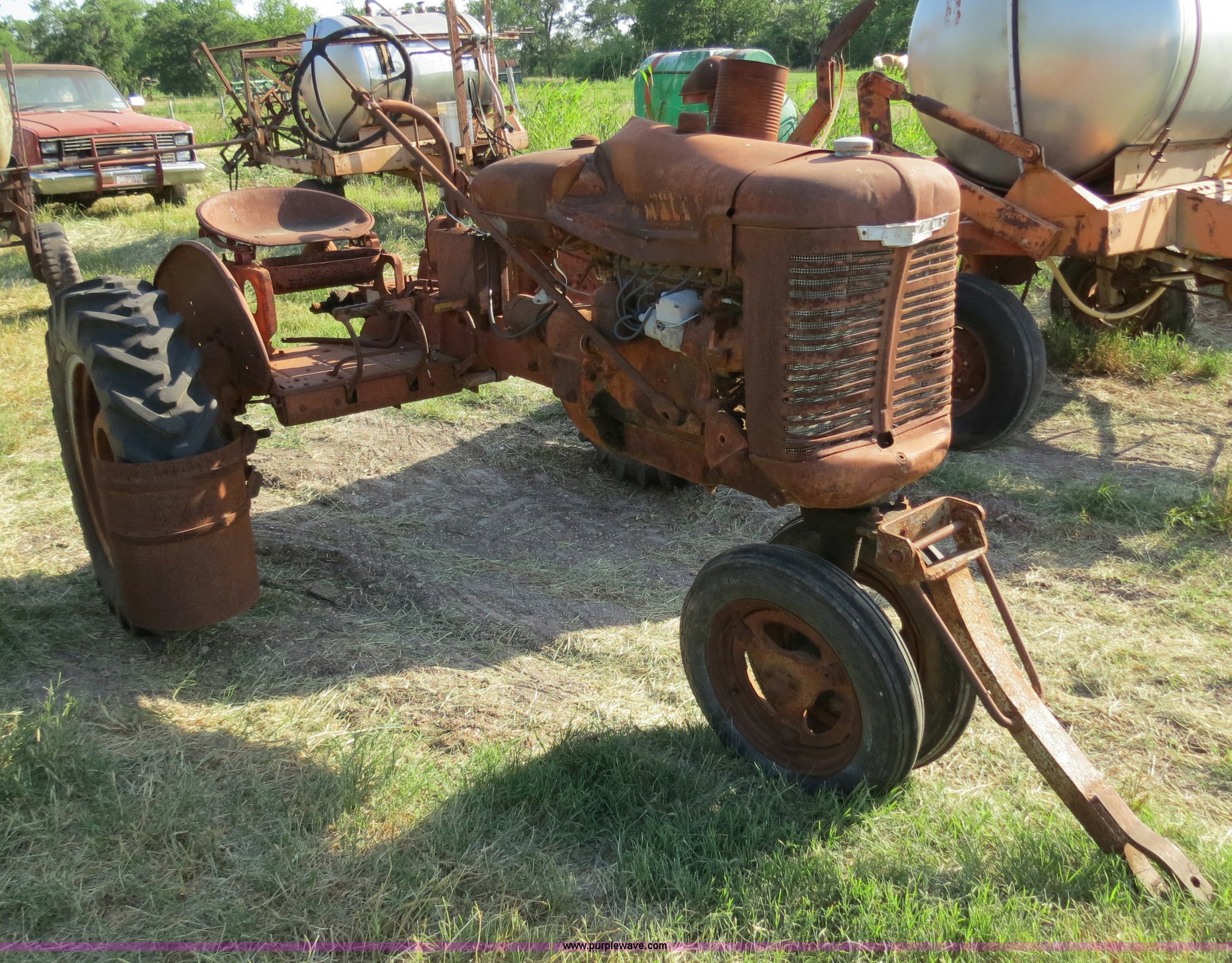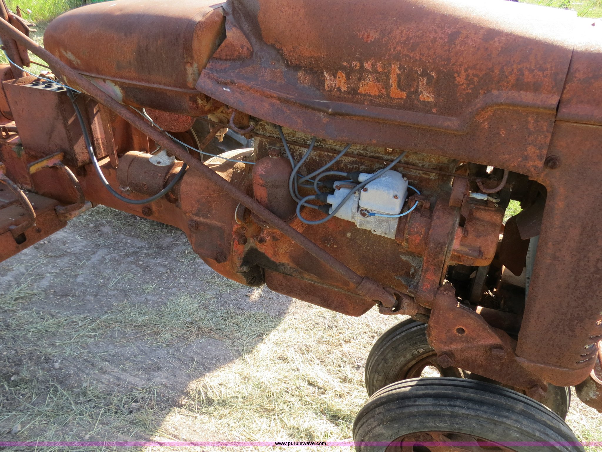 Purple Wave is selling a used Tractor in Texas. This item is a 1945 Farmall B tractor with the following: Four cylinder gas engine, Manual transmission, 4F-1R gears, 540 PTO, Draw bar, Front hitch, 4.00-15 front tires, 10-24 rear tires, Serial 145228
